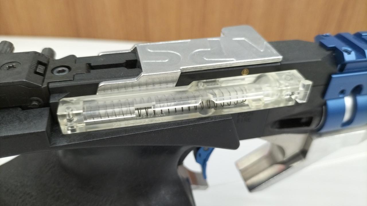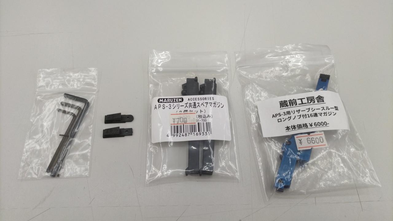 説明書、透明マガジン×1、交換用フロントサイト2種、六角レンチ、別売純正スペアマガジン黒×2、蔵前工房舎16連マガジン |