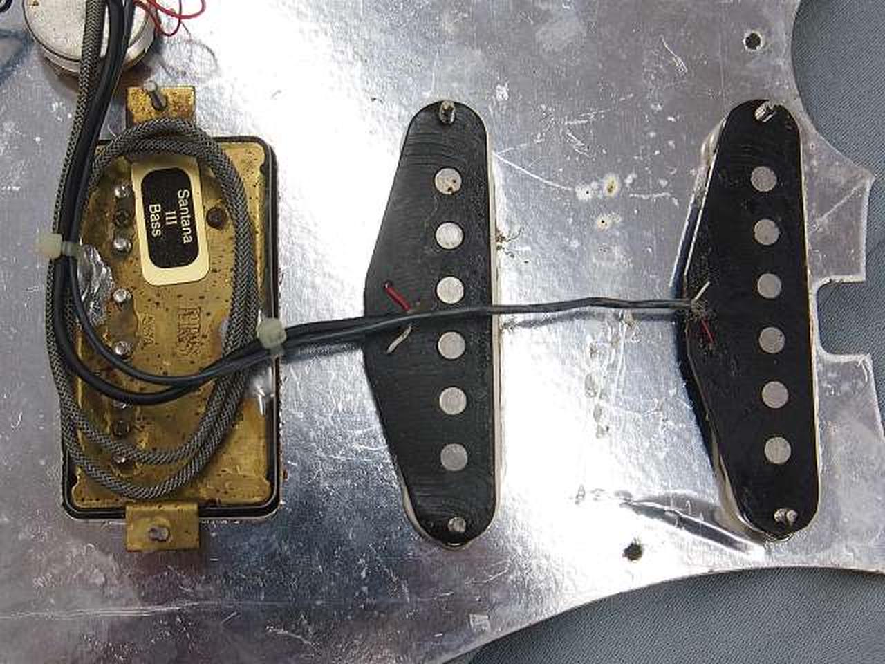 PU:フロント・センター記載なく不明。リアPRS USA/SANTANAIII BASS。ボディ恐らくアルダー。つば出し22Fメイプルネック/ローズ指板※ネックと指板に段差が生じています |
