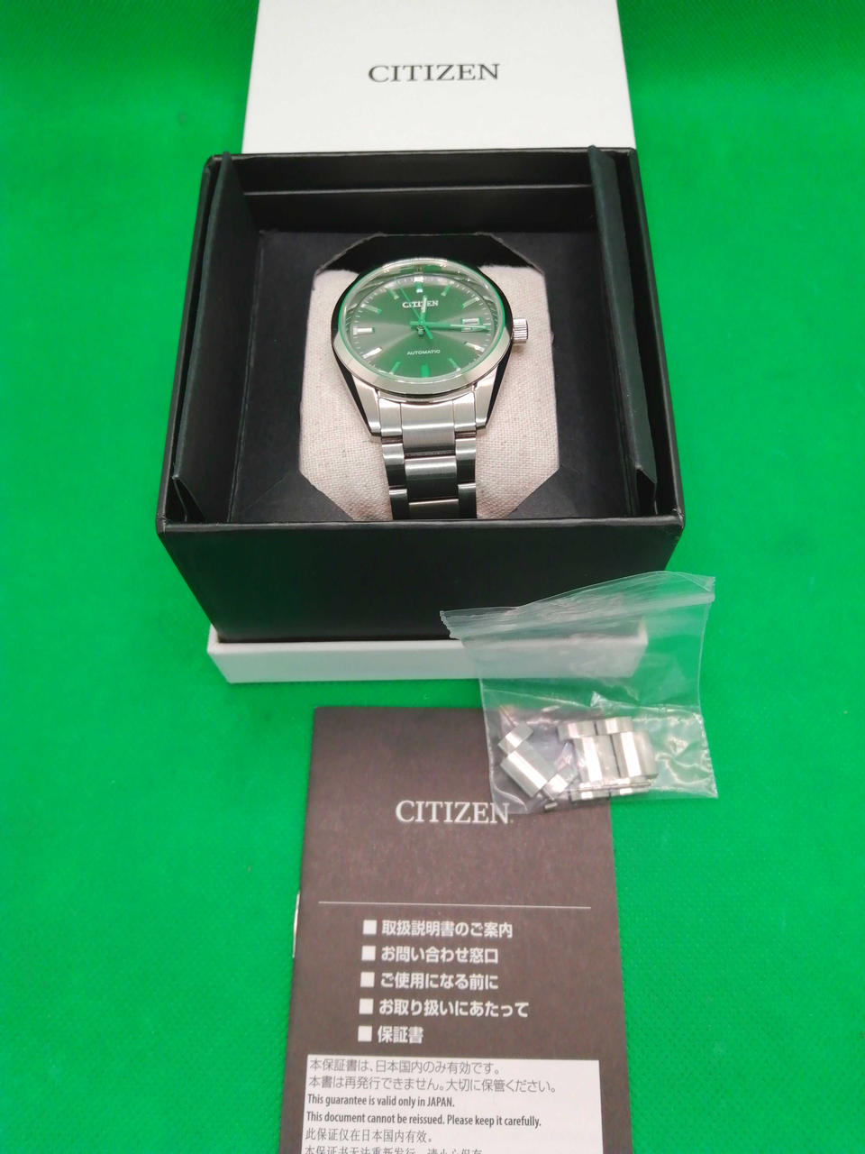 自動巻きで駆動しています、腕周り:17.5cm予備コマあります、取扱説明書案内付き、専用ケース・箱入りです。 |