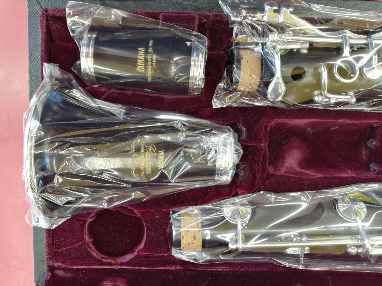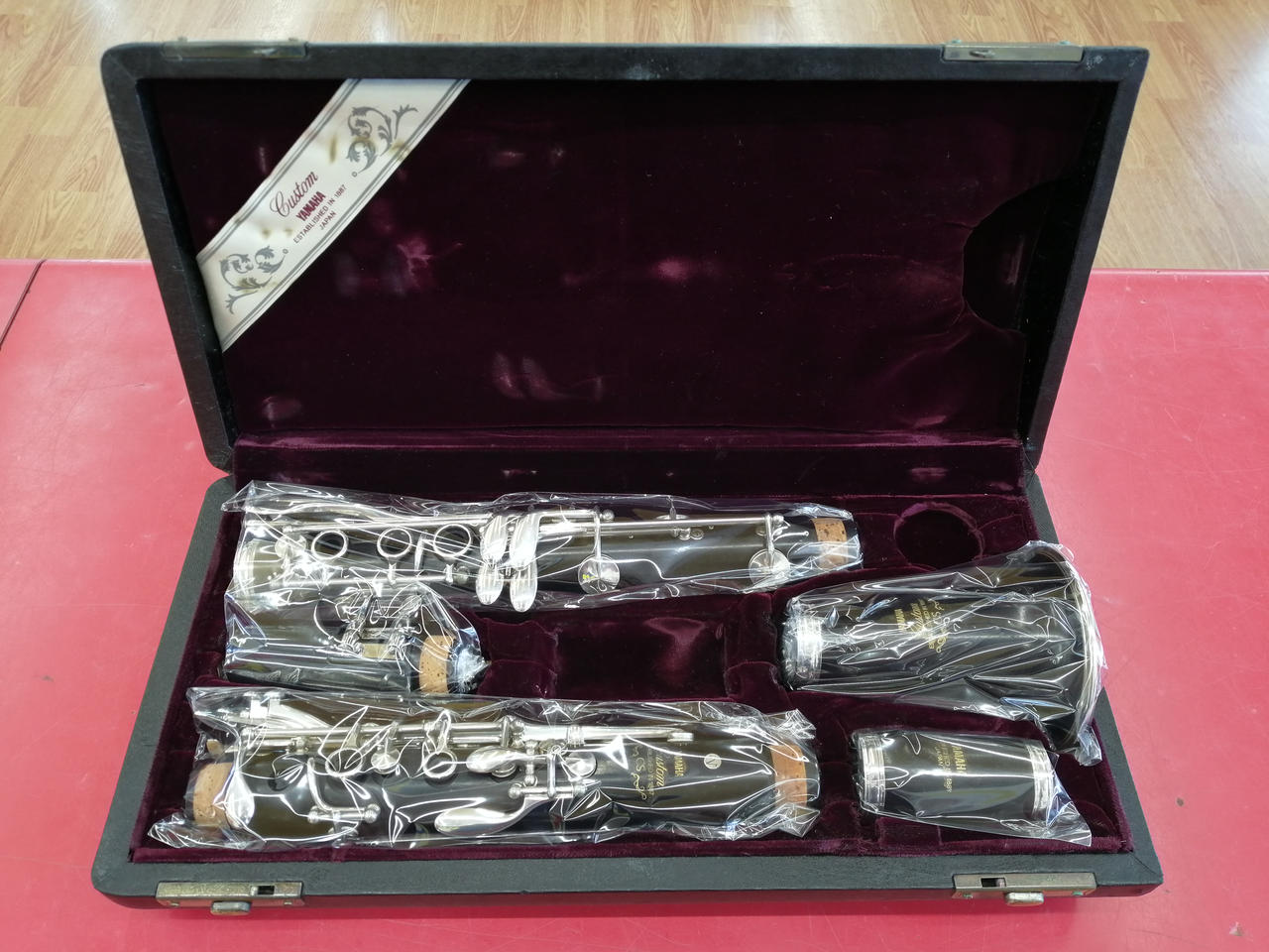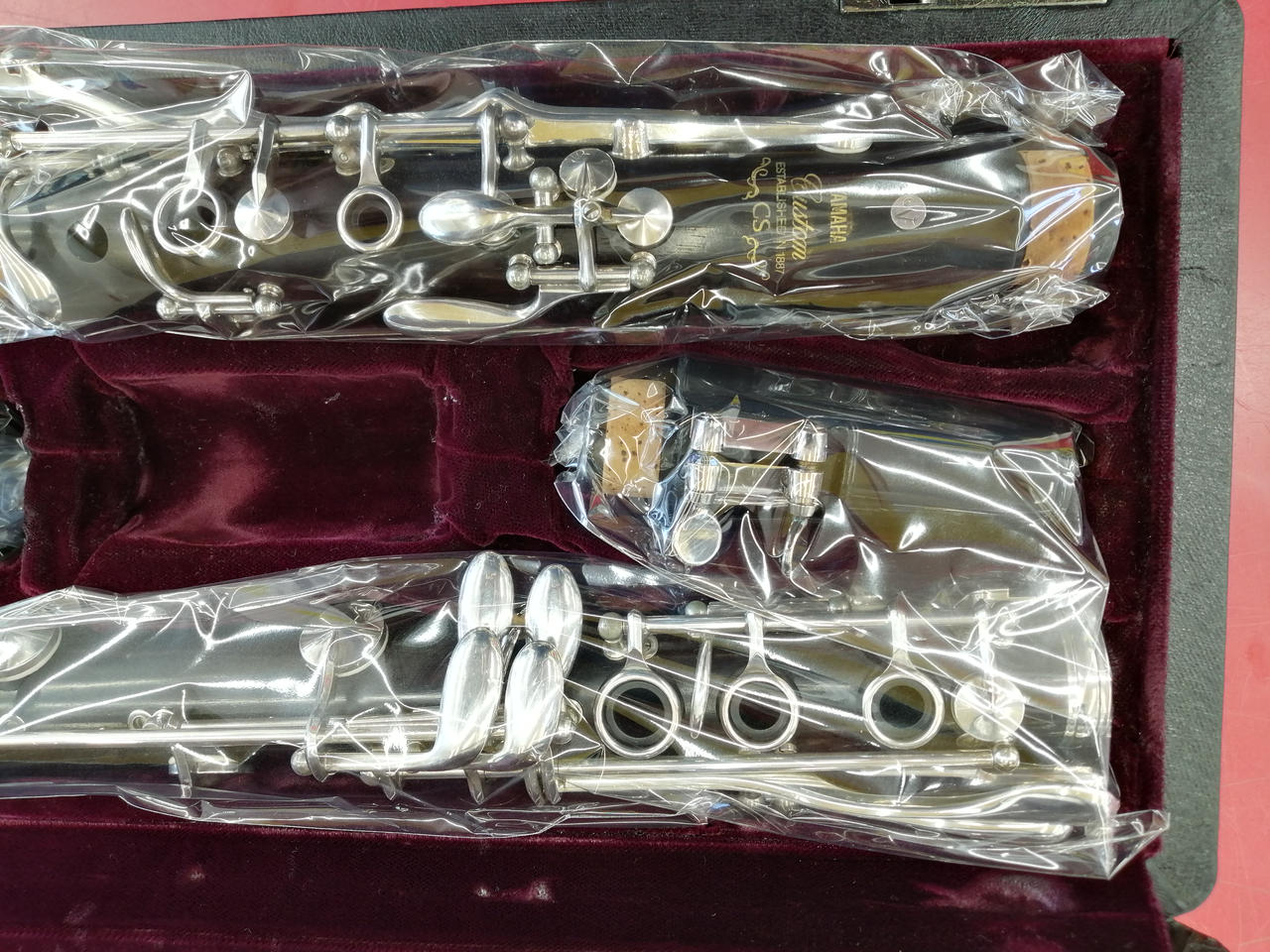 カスタムCSシリーズB♭管。管体はグラナディラ、キイは洋白鍛造銀メッキ、芯金・ネジ類はステンレススチール、針バネ・板バネは硬質鋼、17キイ6リング・ベーム式モデル。 |