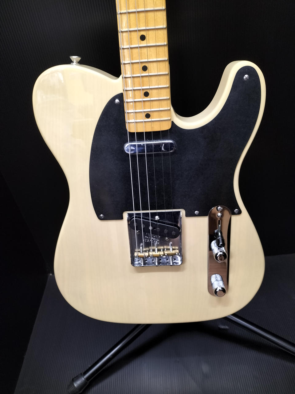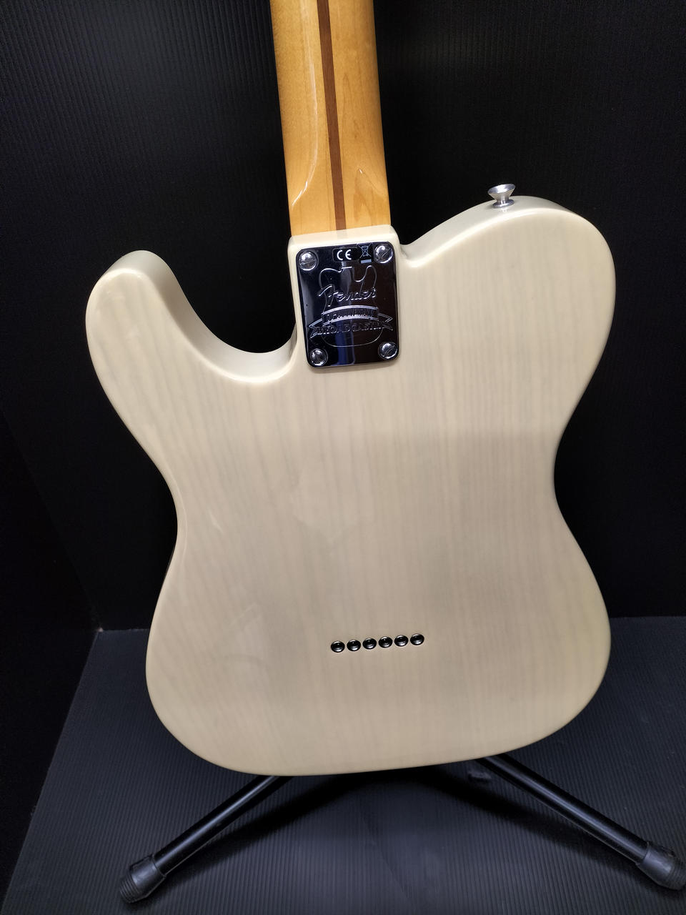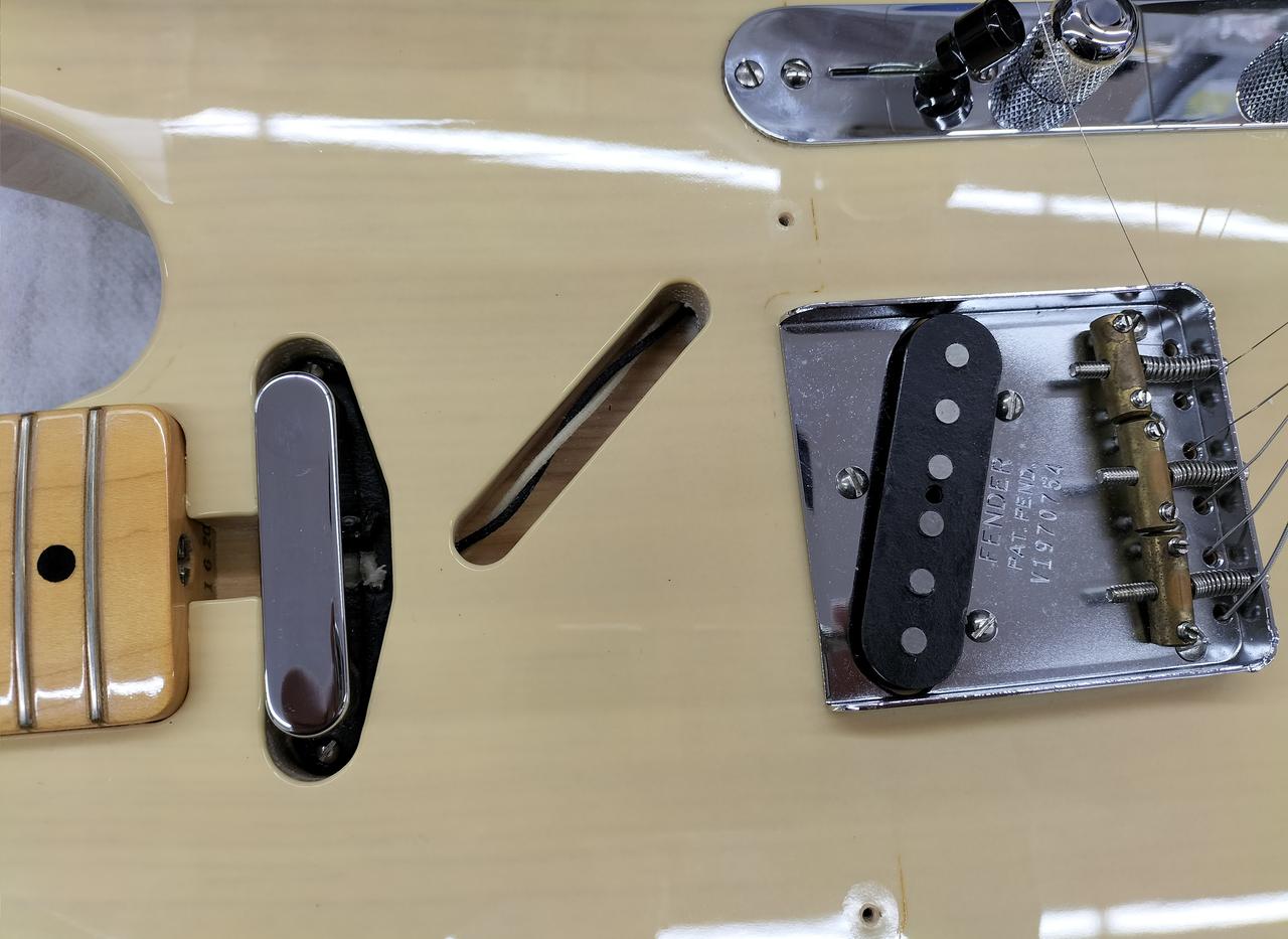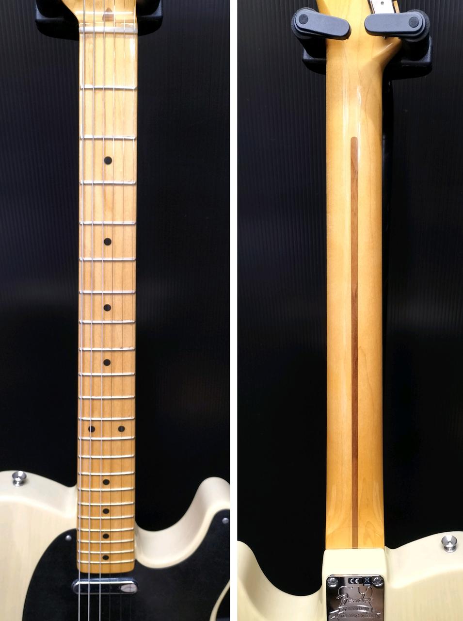 ブロンド・ラッカー・フィニッシュのアッシュ・ボディ、フェノール樹脂製“ブラックガード”、厚めのUネック・シェイプなど当時のスペックを忠実に再現 |