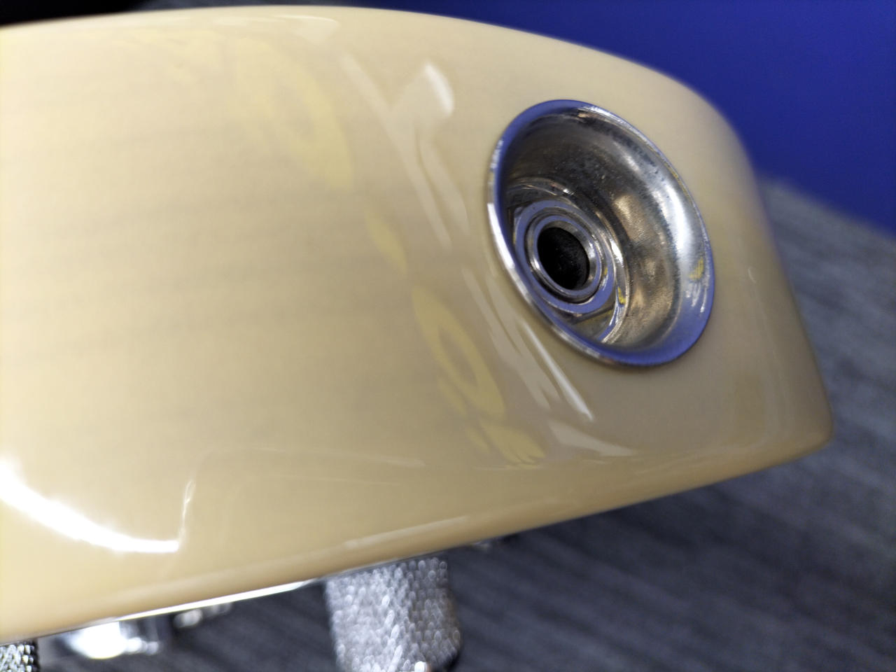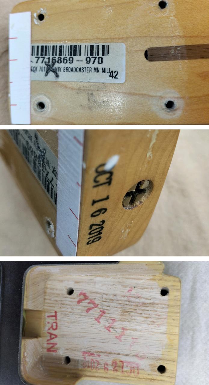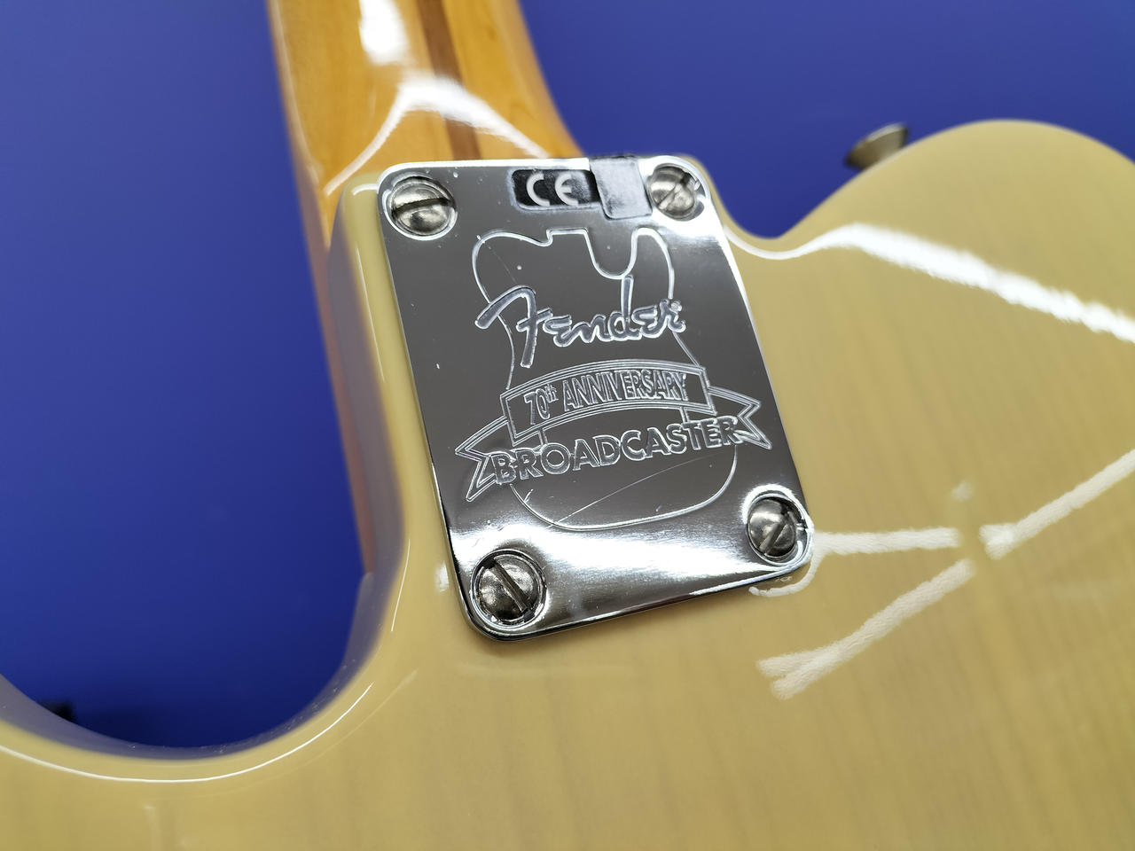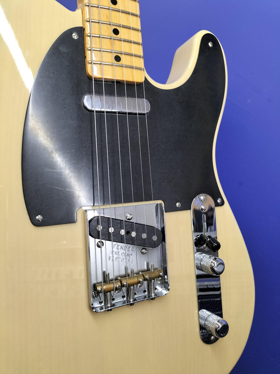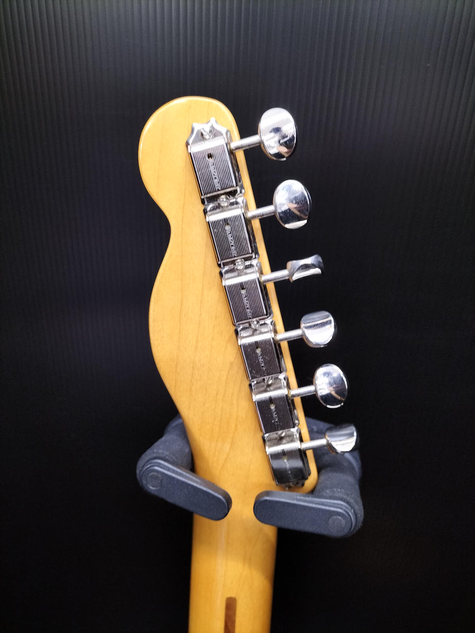 ブロンド・ラッカー・フィニッシュのアッシュ・ボディ、フェノール樹脂製“ブラックガード”、厚めのUネック・シェイプなど当時のスペックを忠実に再現 |