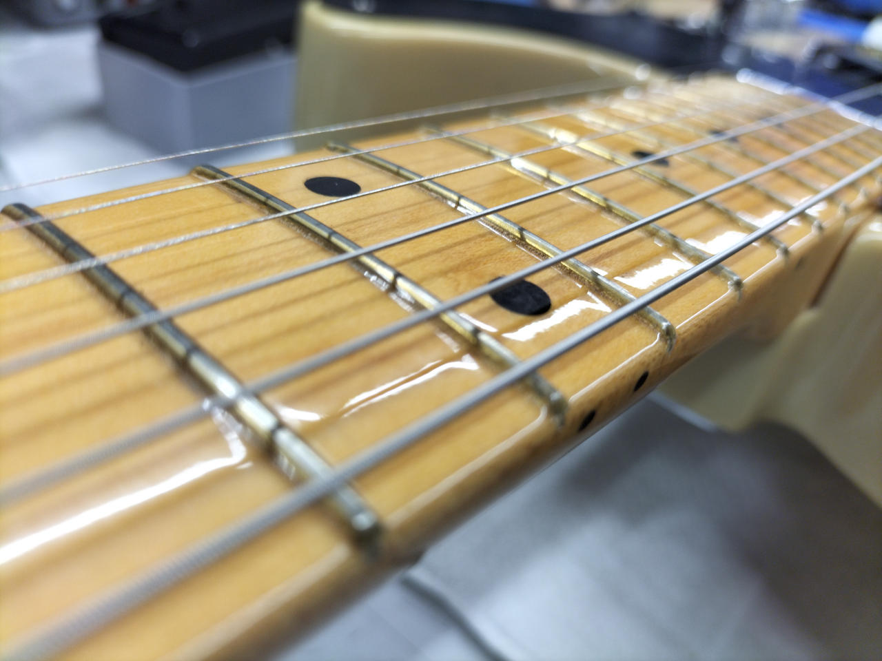 ネックはほぼストレート トラスロッドは左右共に90度余裕有(右回りのみ90度以上はキツイです。) 弦高:6弦/1弦12F:約1.5mm |