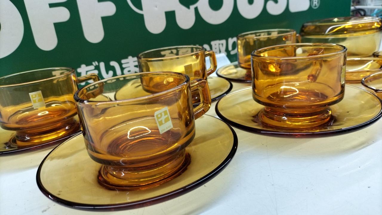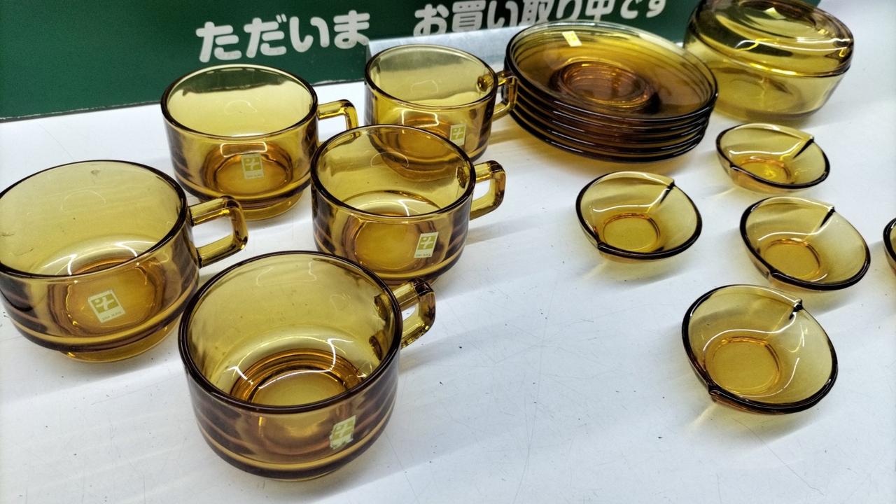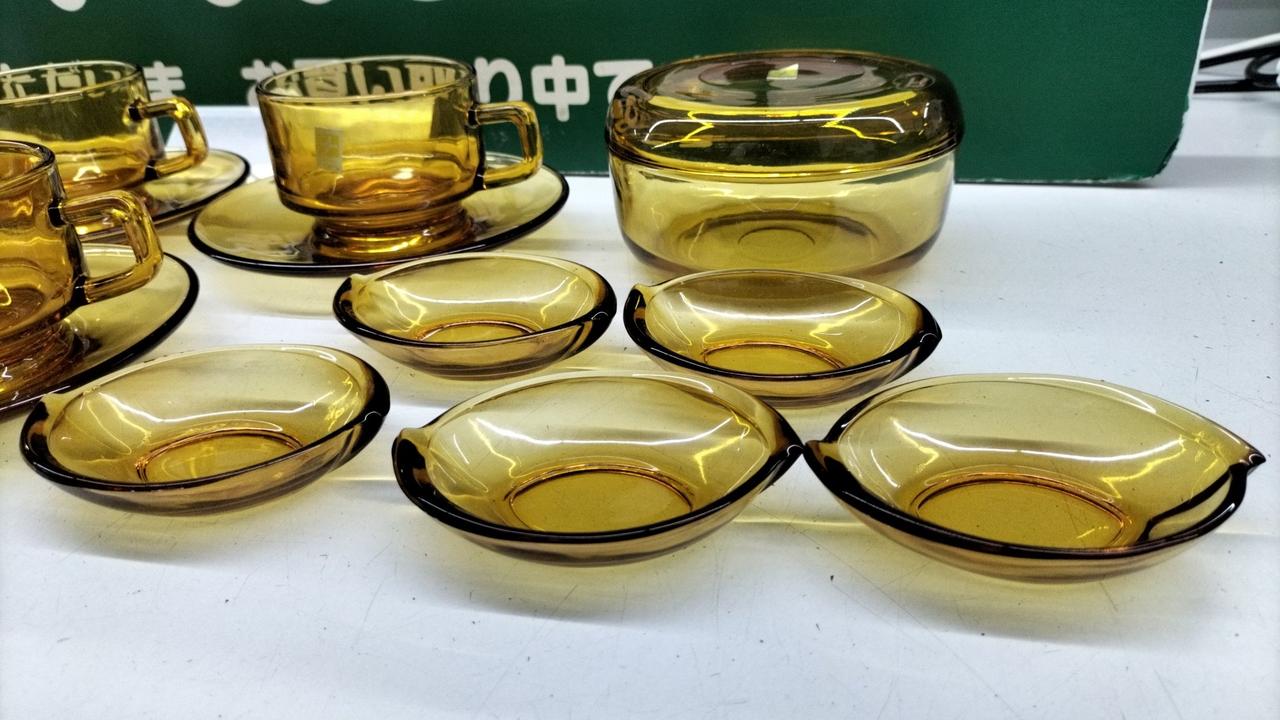 琥珀色が美しいティーカップセットです。箱が劣化でありません···緩衝材を巻いての発送となります。
