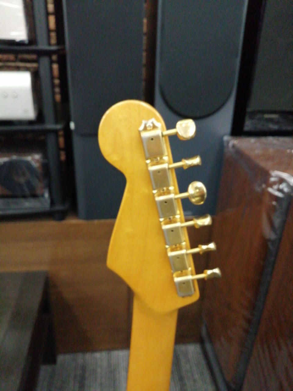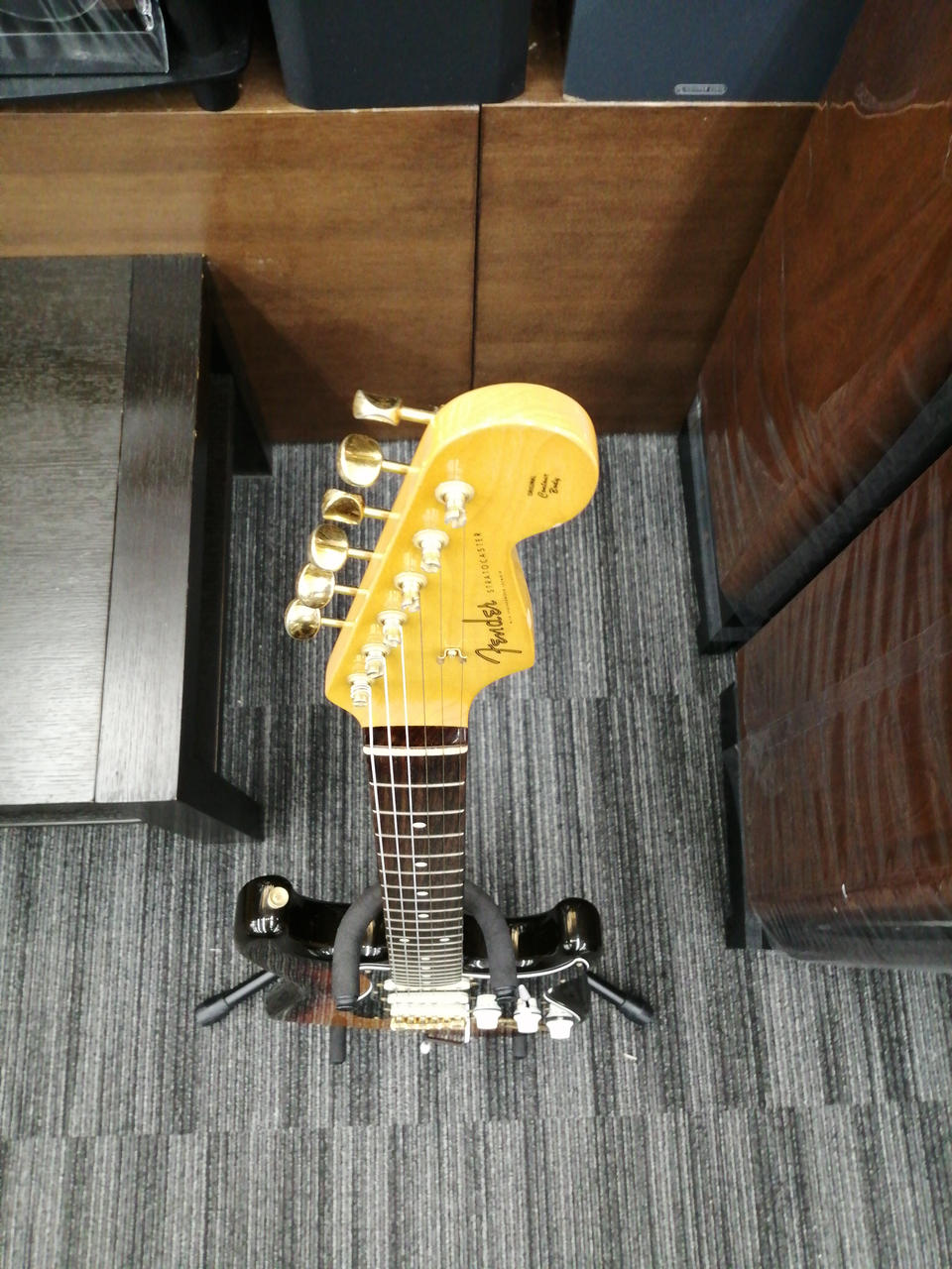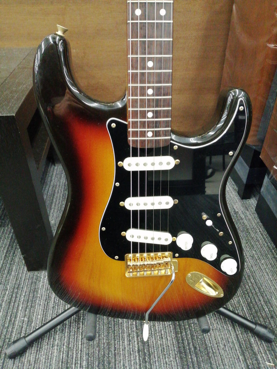 SRVを彷彿とさせるブラックピックガードにゴールドパーツストラトキャスター |
