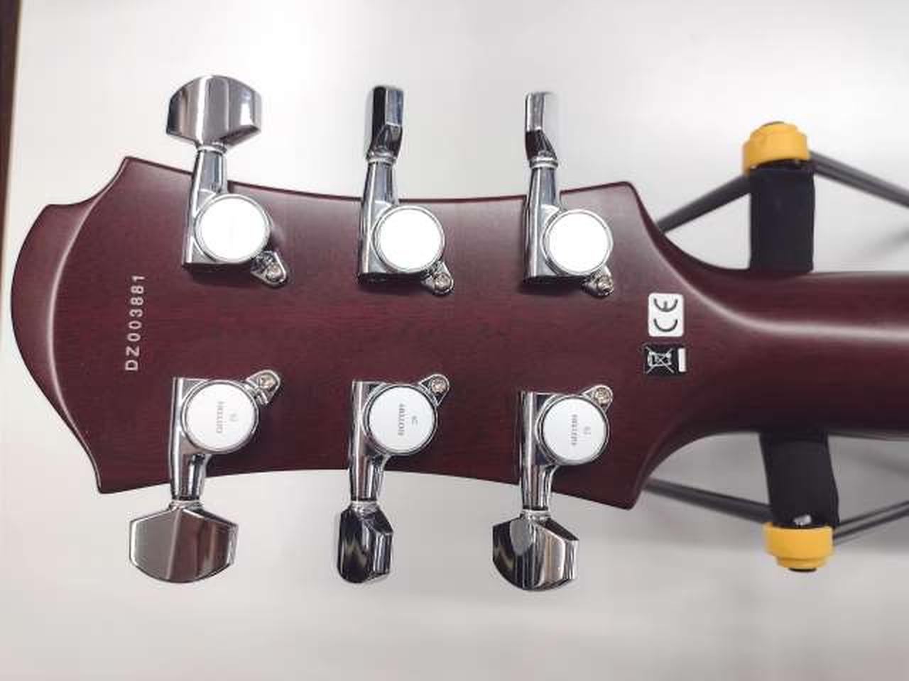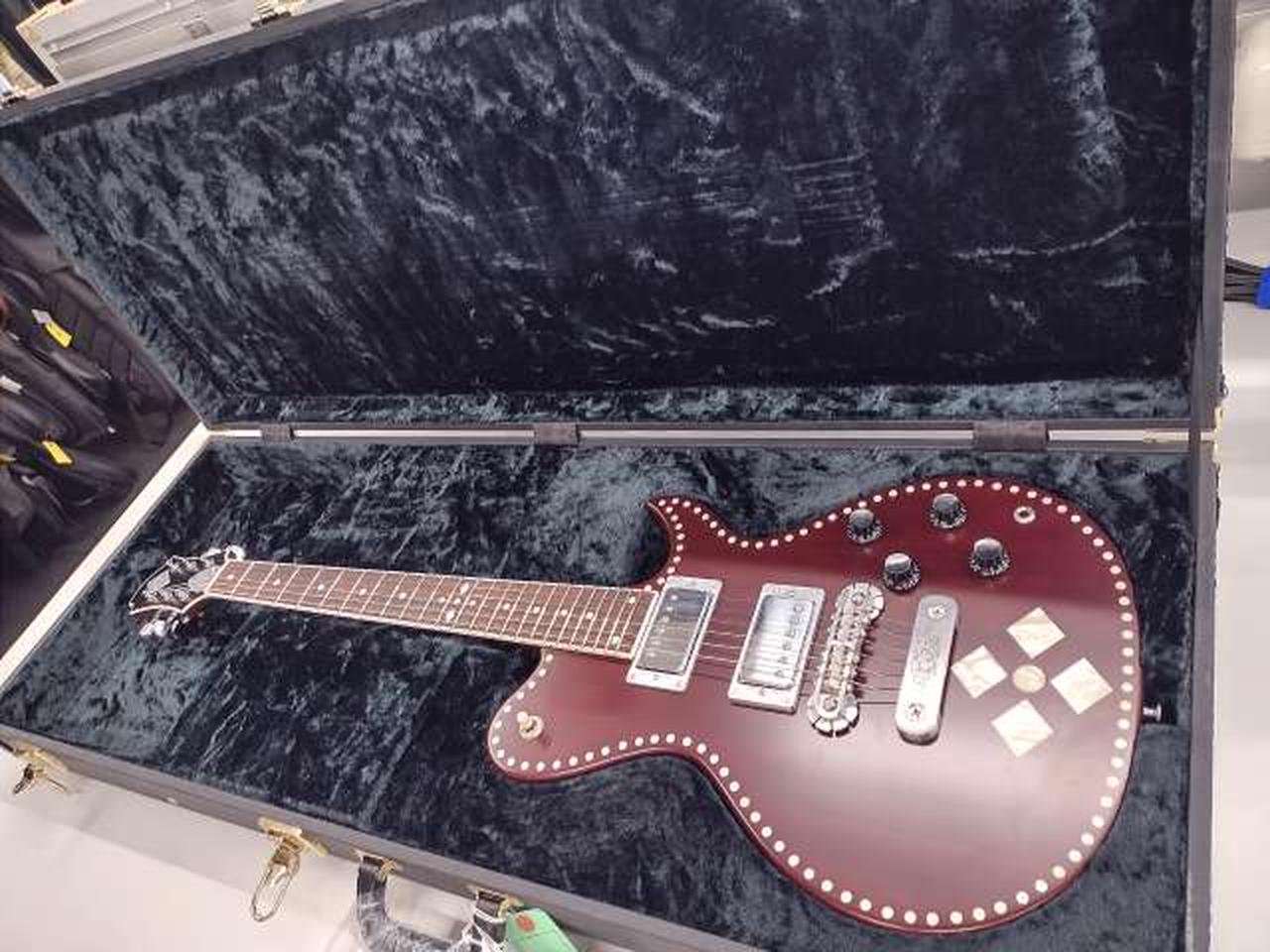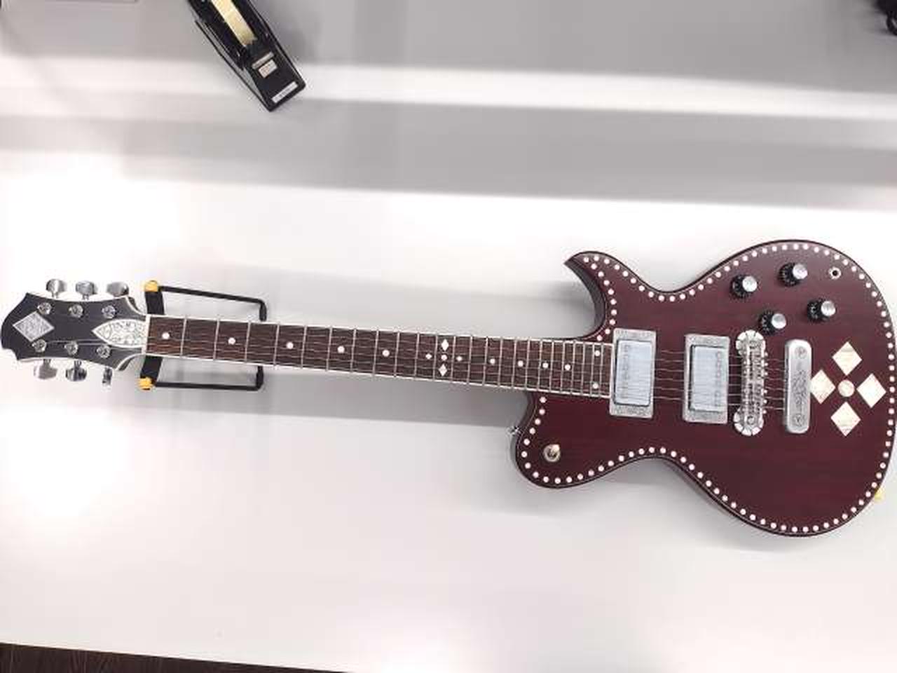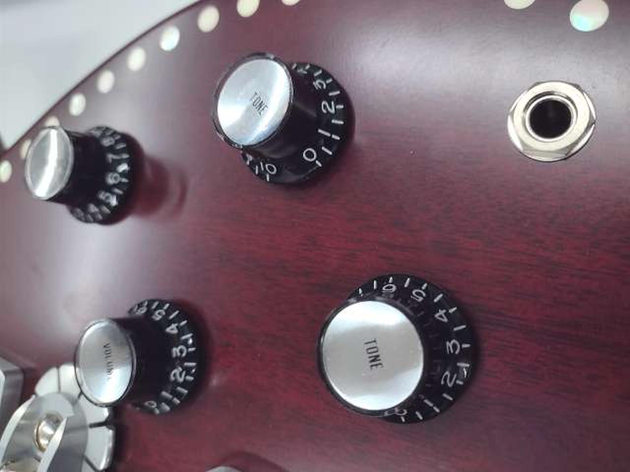 落ち着いたチェリーレッド・カラーのボディーに白蝶貝のドット・インレイを施し、ダイヤモンド・インレイ、リフレクター・ノブでレトロなルックスです。 |