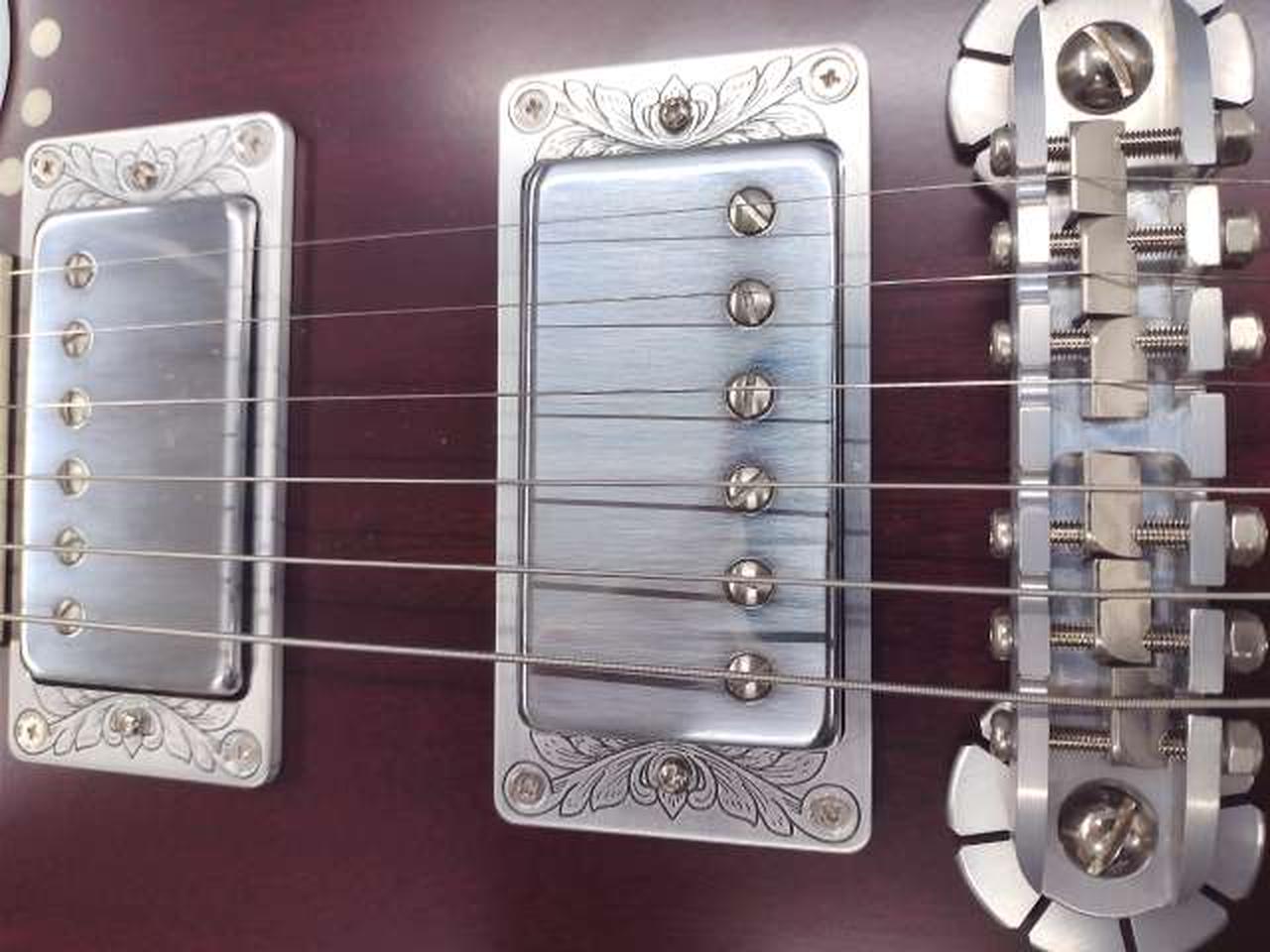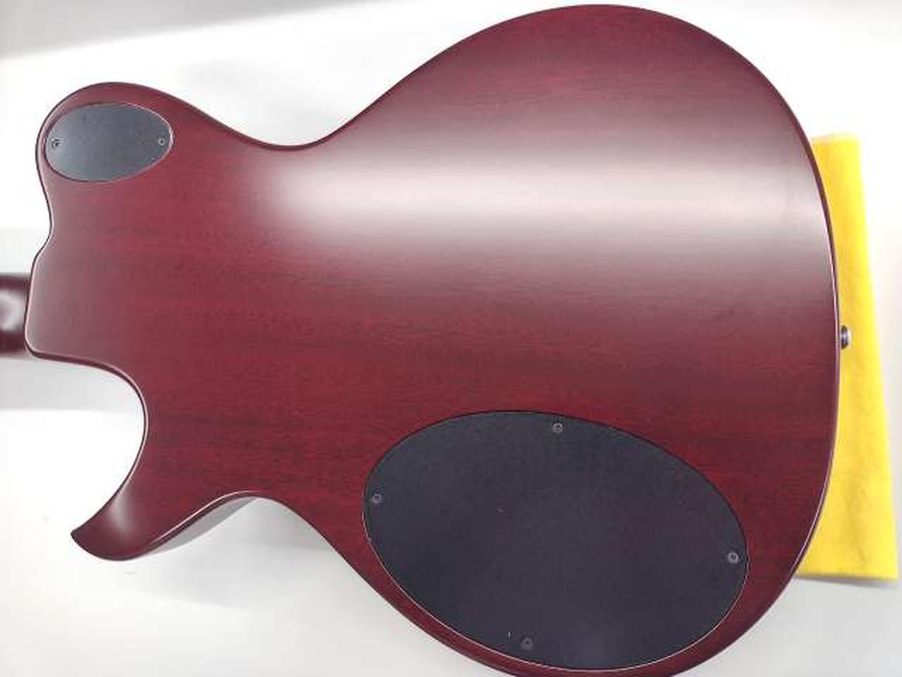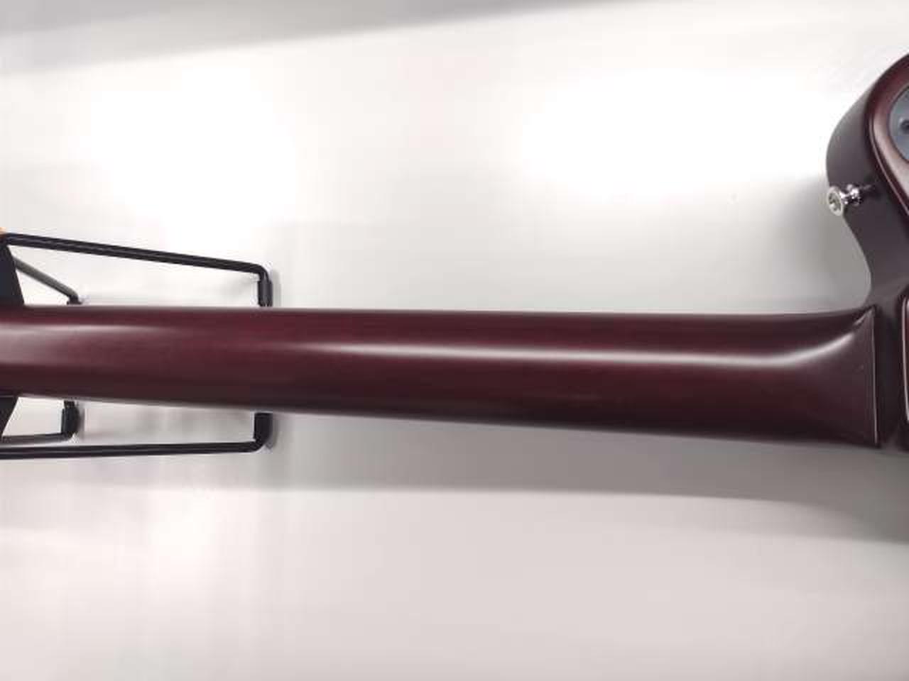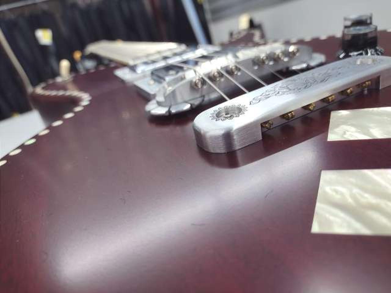 落ち着いたチェリーレッド・カラーのボディーに白蝶貝のドット・インレイを施し、ダイヤモンド・インレイ、リフレクター・ノブでレトロなルックスです。 |