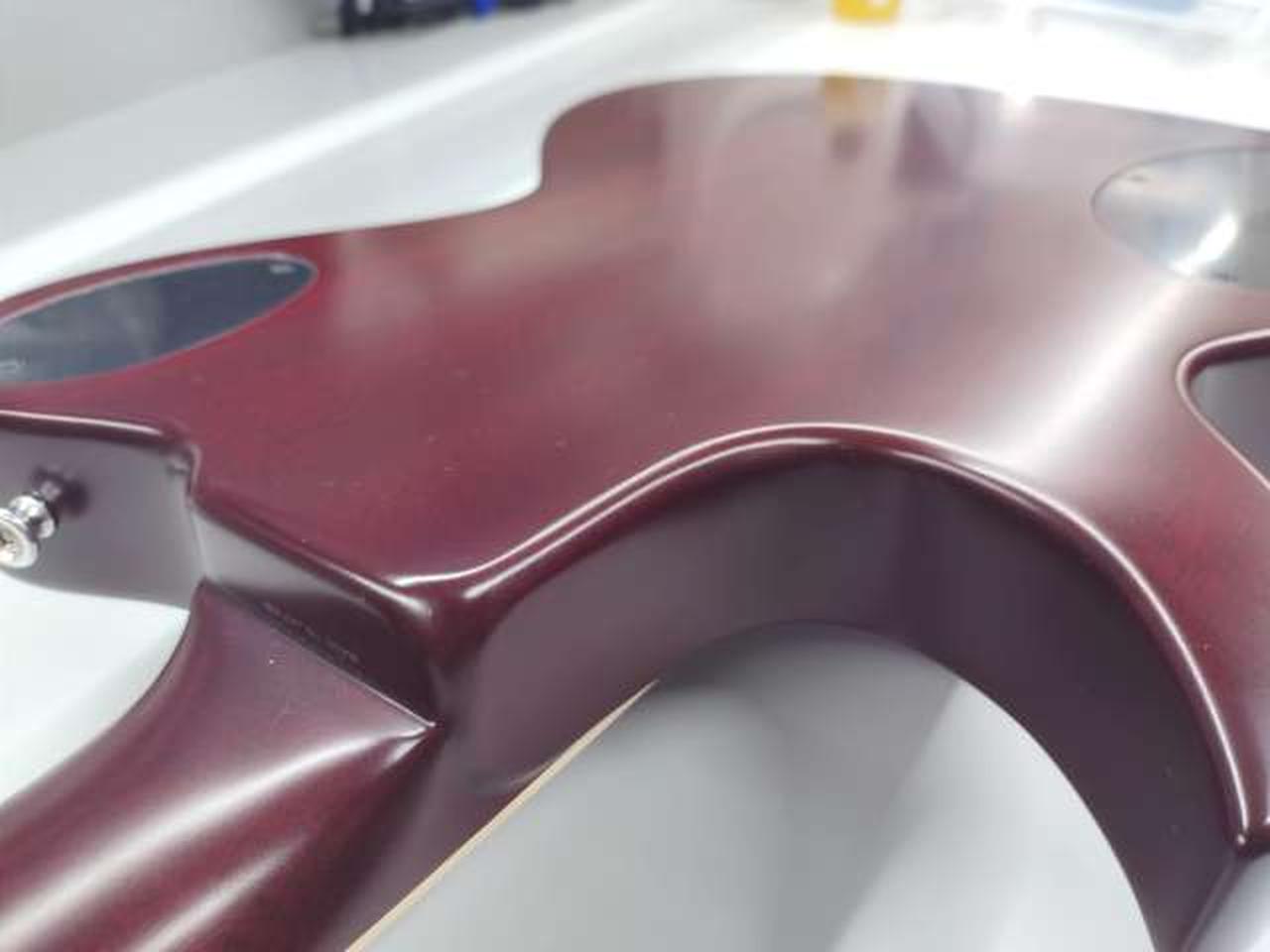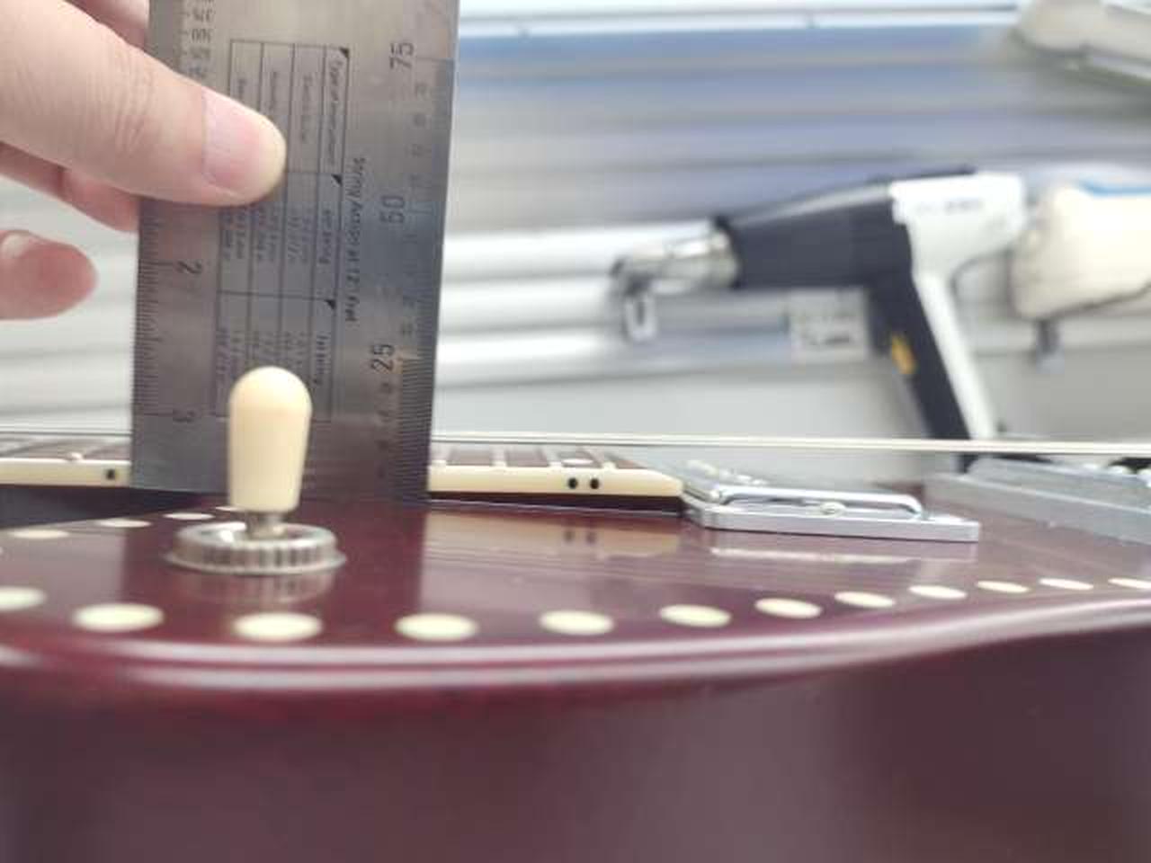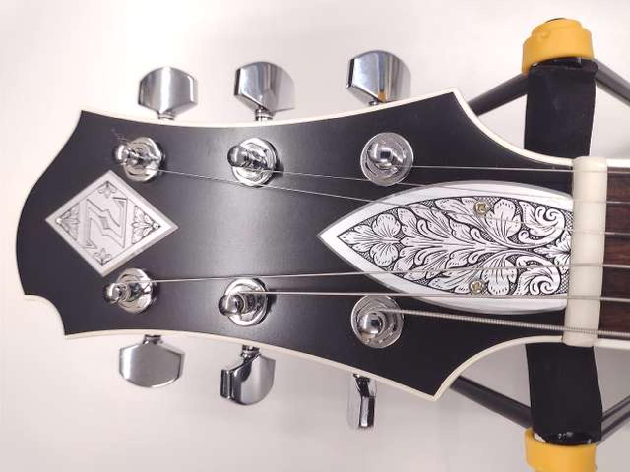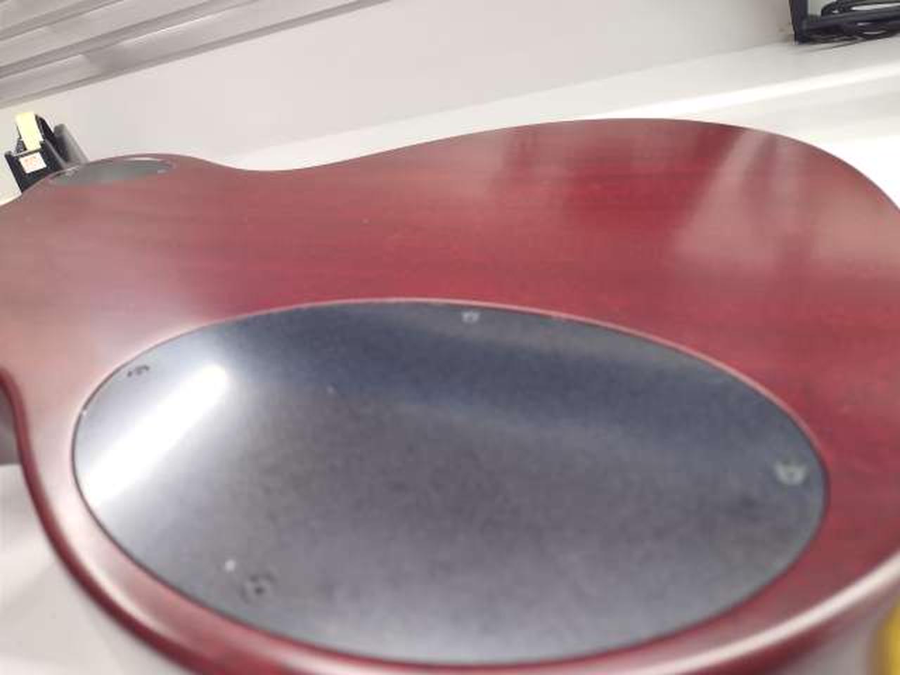 落ち着いたチェリーレッド・カラーのボディーに白蝶貝のドット・インレイを施し、ダイヤモンド・インレイ、リフレクター・ノブでレトロなルックスです。 |