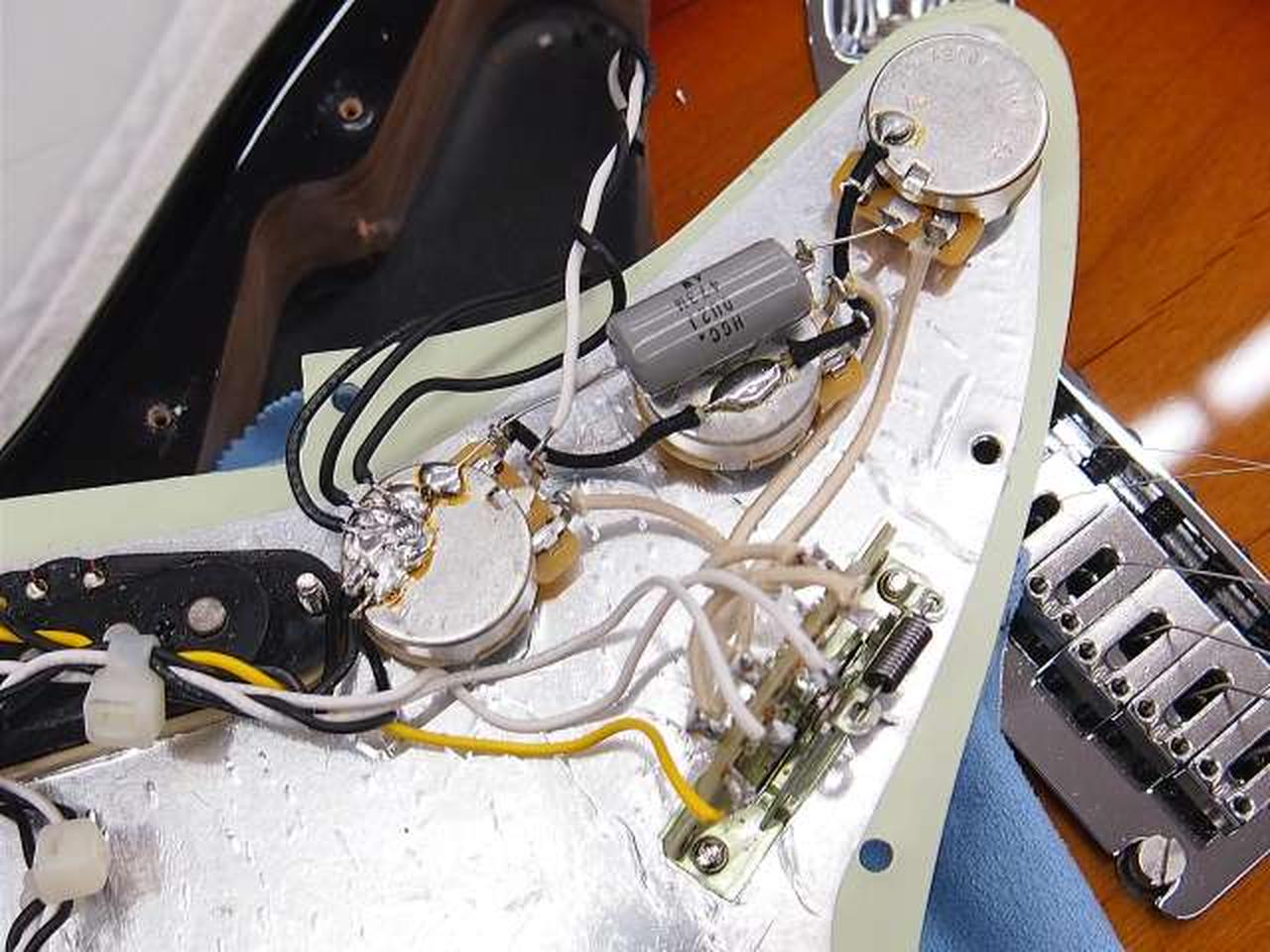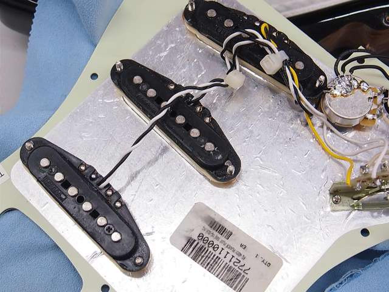 PUがFENDER/HOT NOISLESS PUに交換。ポットのスイッチ機能が取り除かれ、セレクターは通常の5WAYコントロールに変更 |