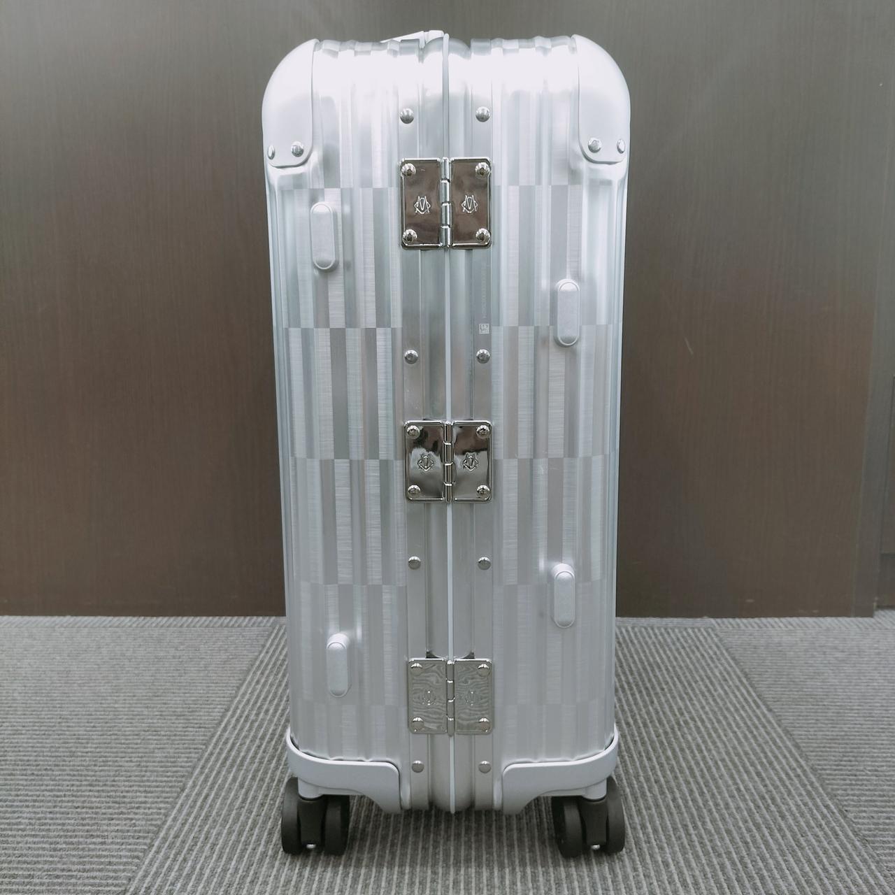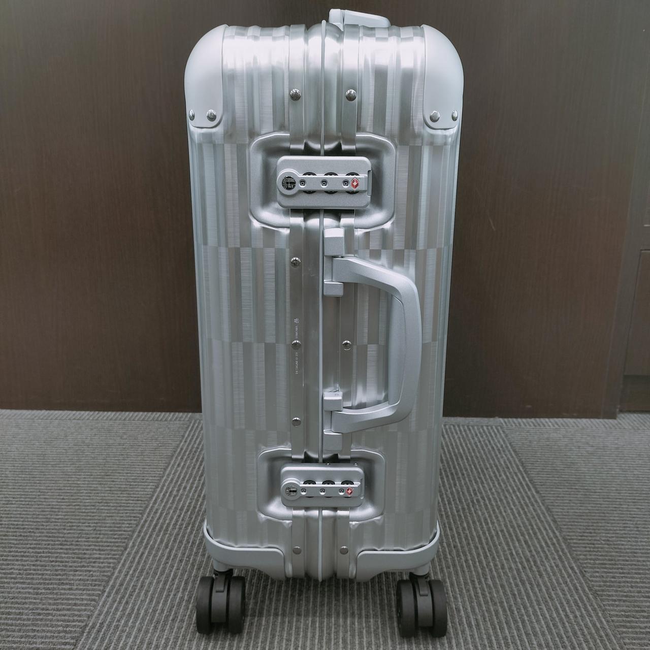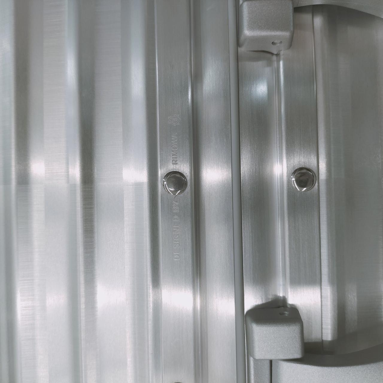 ボディ部分全面に配置された幾何学的なパターンによりリモワの象徴的なグルーヴが消えていくような目の錯覚を生み出しているのが特徴。このダイナミックなビジュアルを実現するために、ケルンの工場で製作されたブラッシュ仕上げのアルミニウムと未ブラッシュ仕上げのアルミニウムの2種類を効果的に使用しているお品物です。