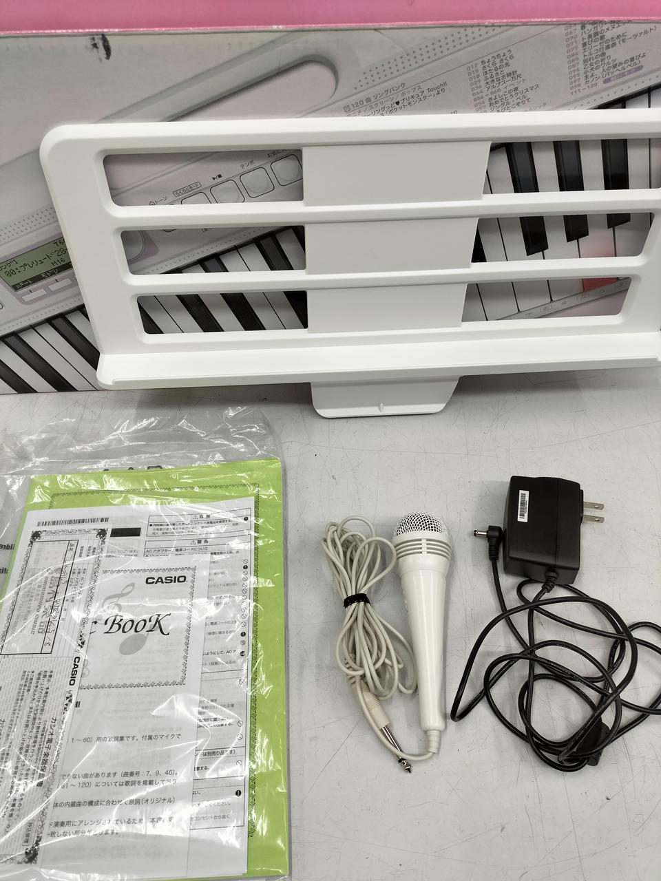 ACアダプタ、説明書、譜面台、マイク、マイクホルダー