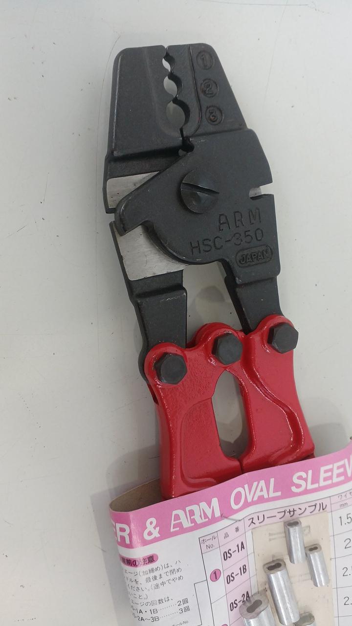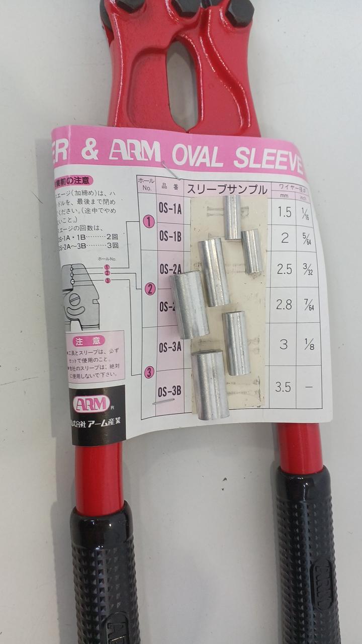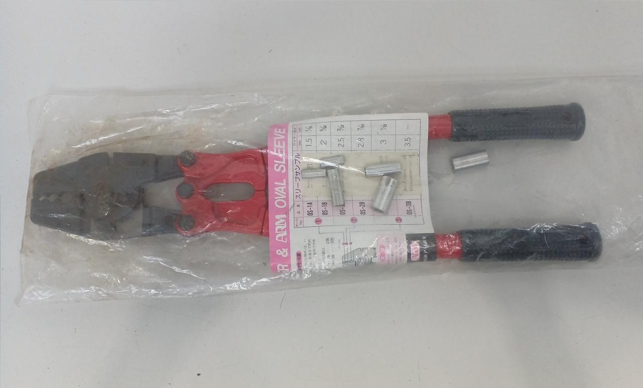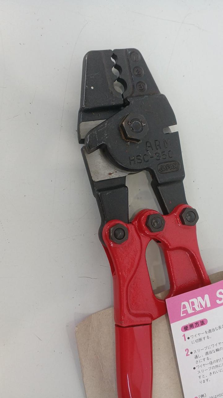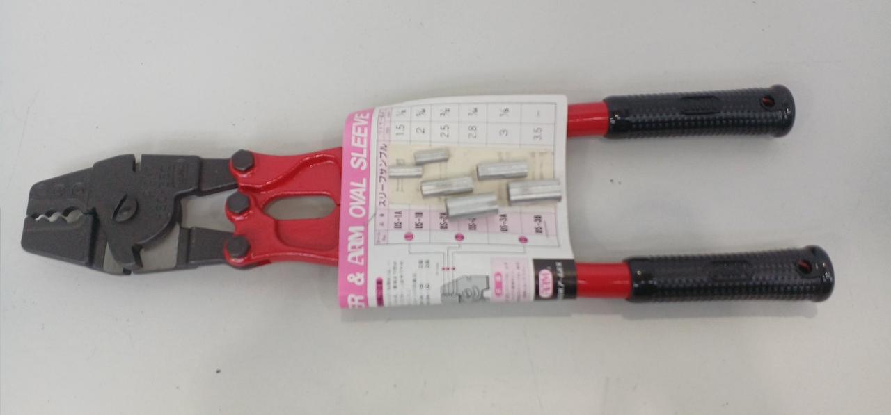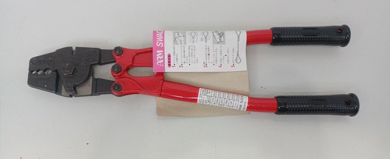 台付ワイヤーロープ製作の専用工具です。ワイヤーロープの切断・圧着(スエージ)ができる |