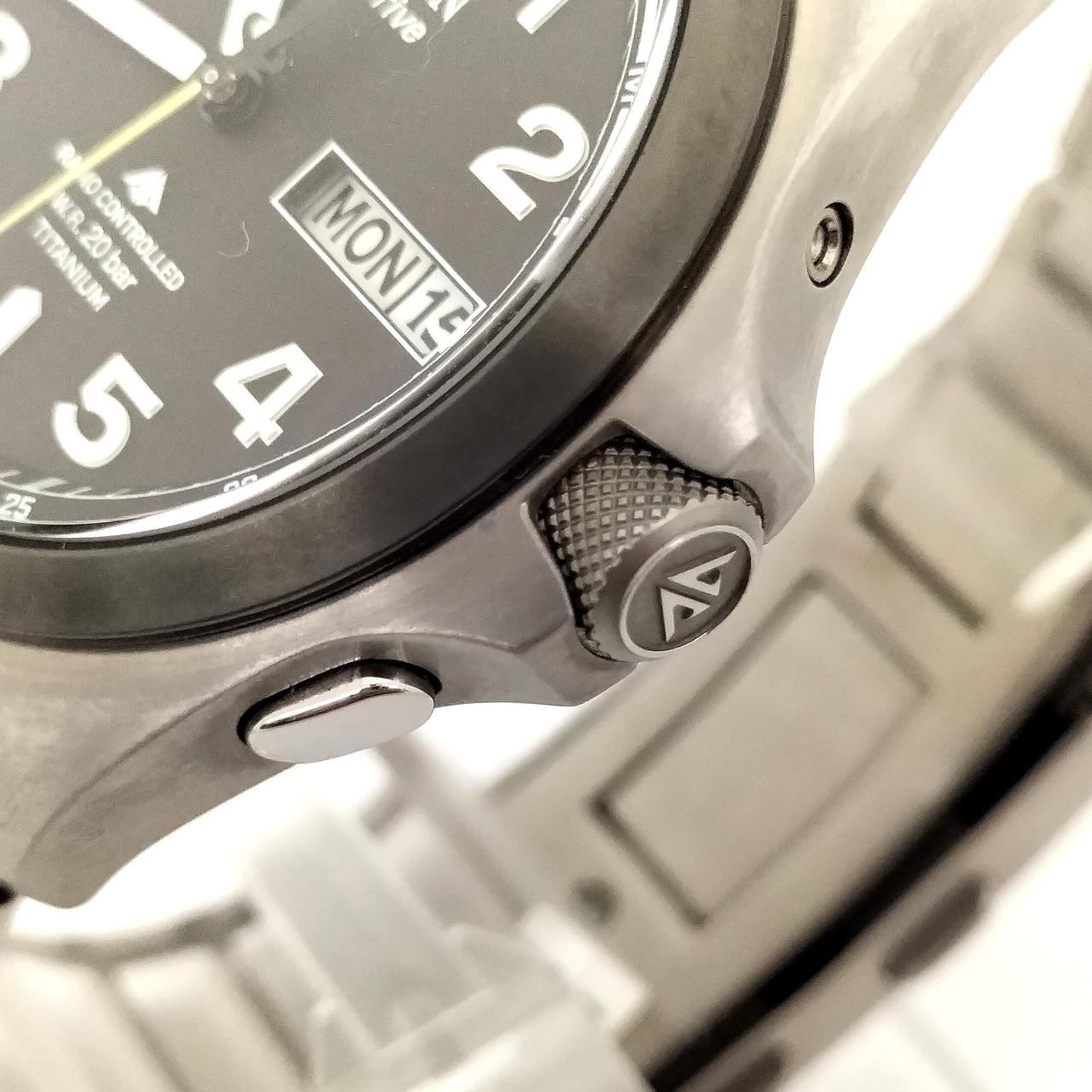 ケース、バンドの素材には、傷に強く、軽く、肌にやさしく、サビにくい「スーパーチタニウム」を採用。リズミカルに配置したアラビア数字のインデックスを採用することで視認性を確保。針やインデックスには暗い場所でも時刻表示が見やすい夜光処理を施しています✨️