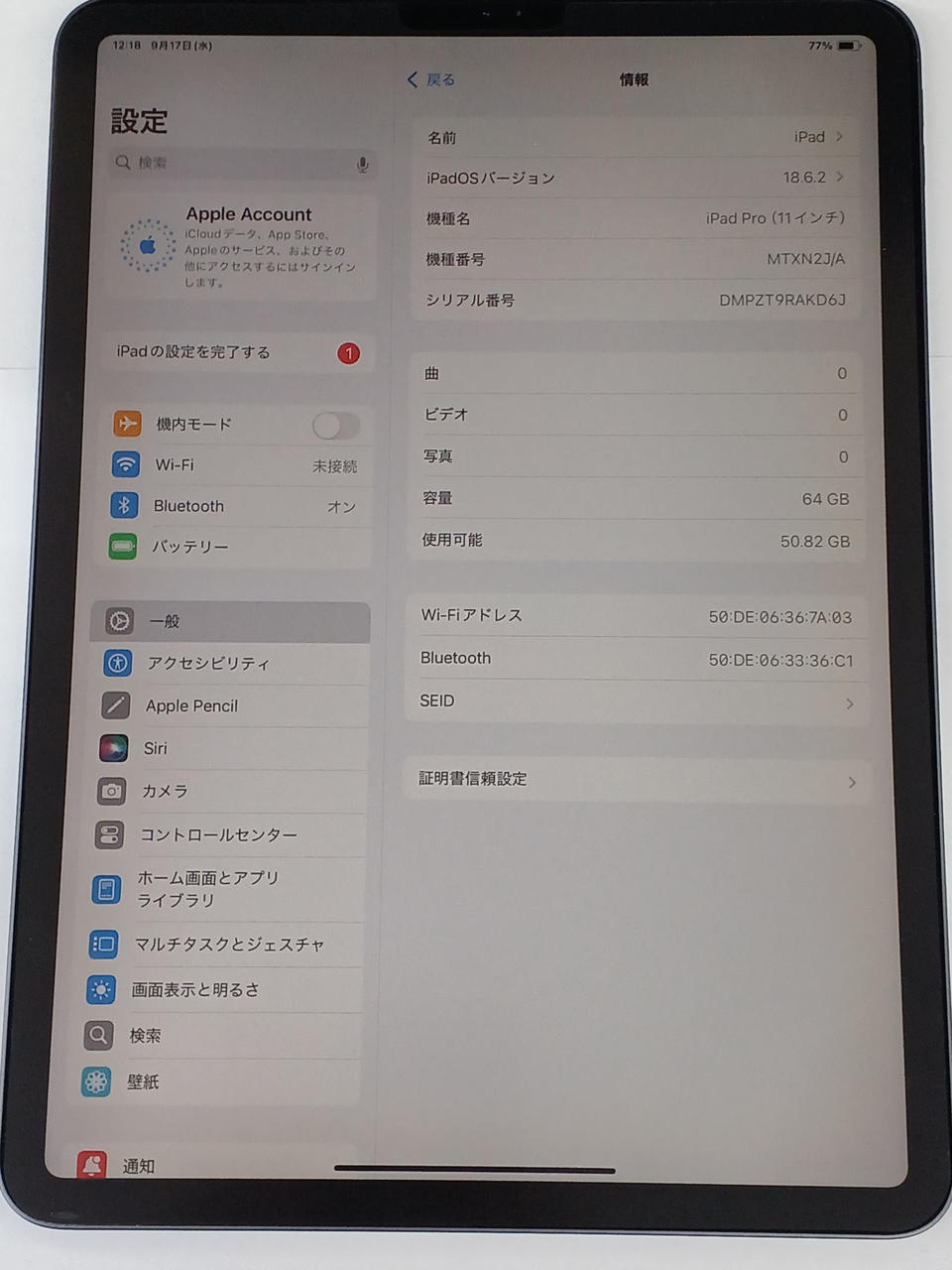 第1世代 IOS:18.6.2 CPU:APPLE A12Xストレージ容量:64GB WI-FIモデル 画面サイズ:11インチ 画面解像度:2388x1668付属品:透明なクリアカバーのみ。※液晶の右側とした部分、ふちの部分が若干黄色く変色しています。画面には液晶フィルムが貼ったままです。