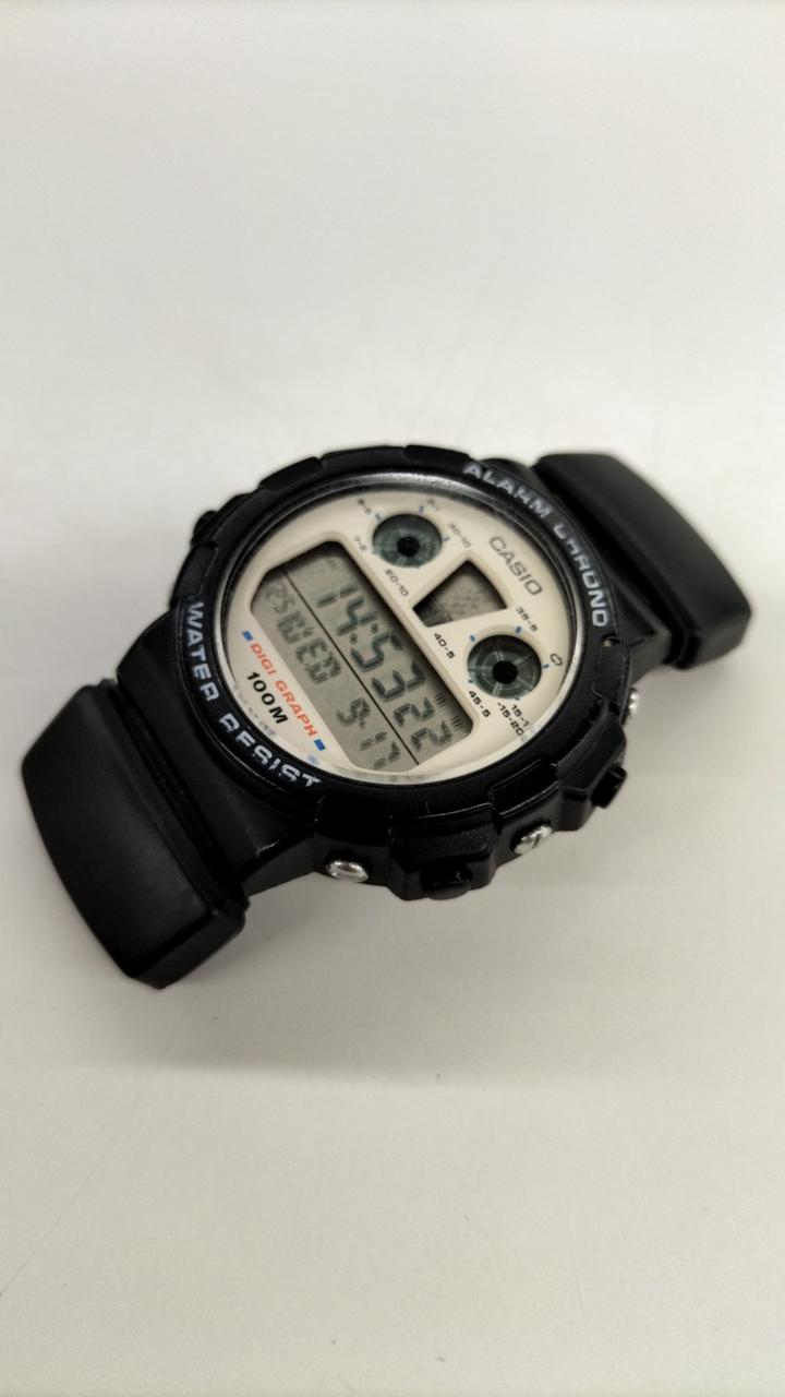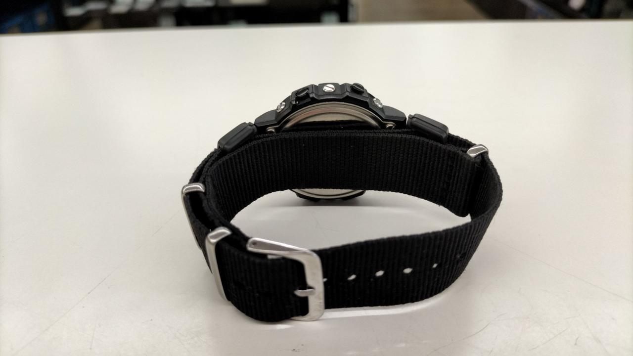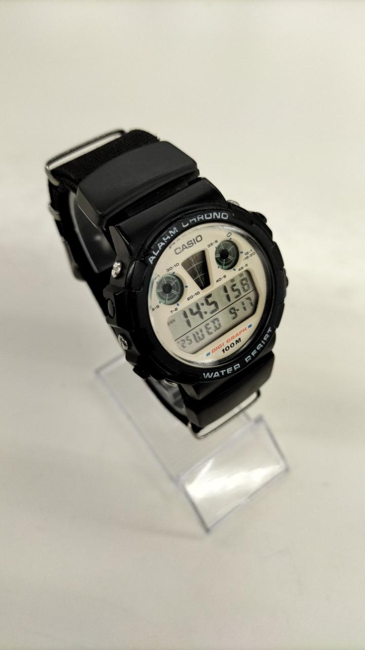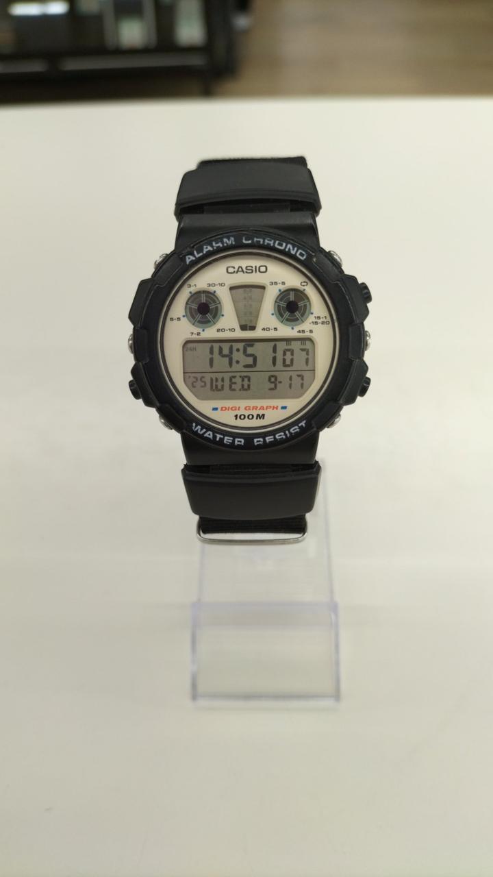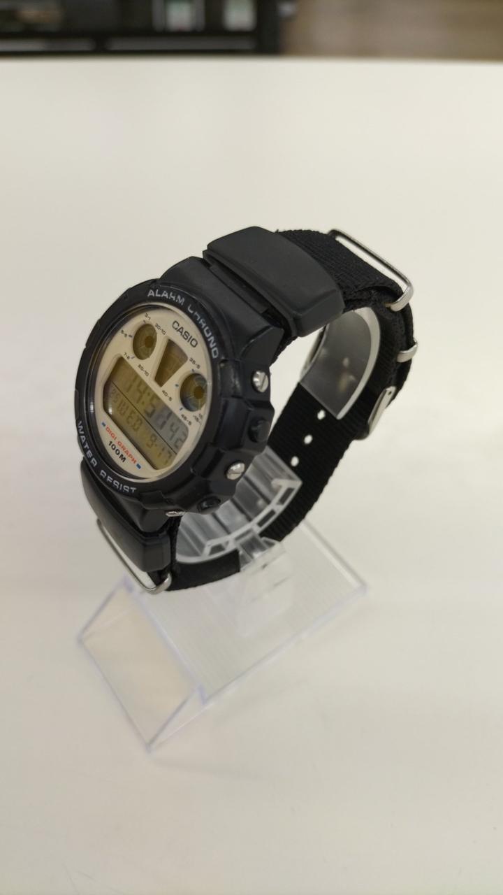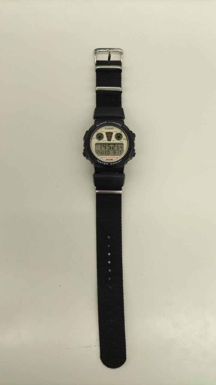 80年代のCASIO製品、ALARM CHRONO。キズ、汚れあり。ベルトは純正ではなくナイロンベルトになっています。 |