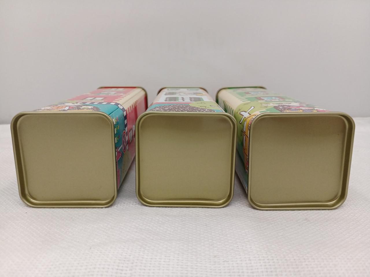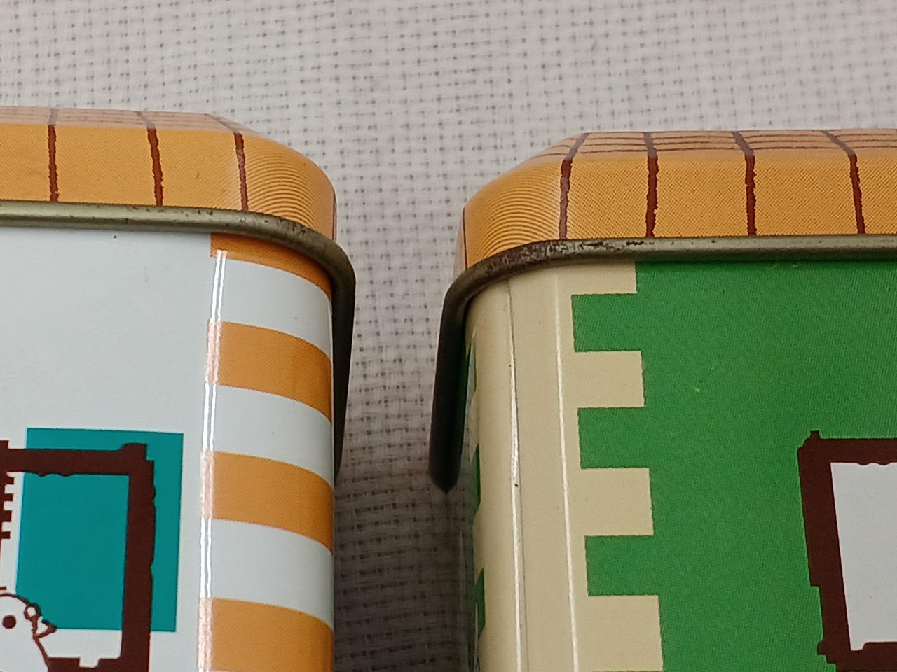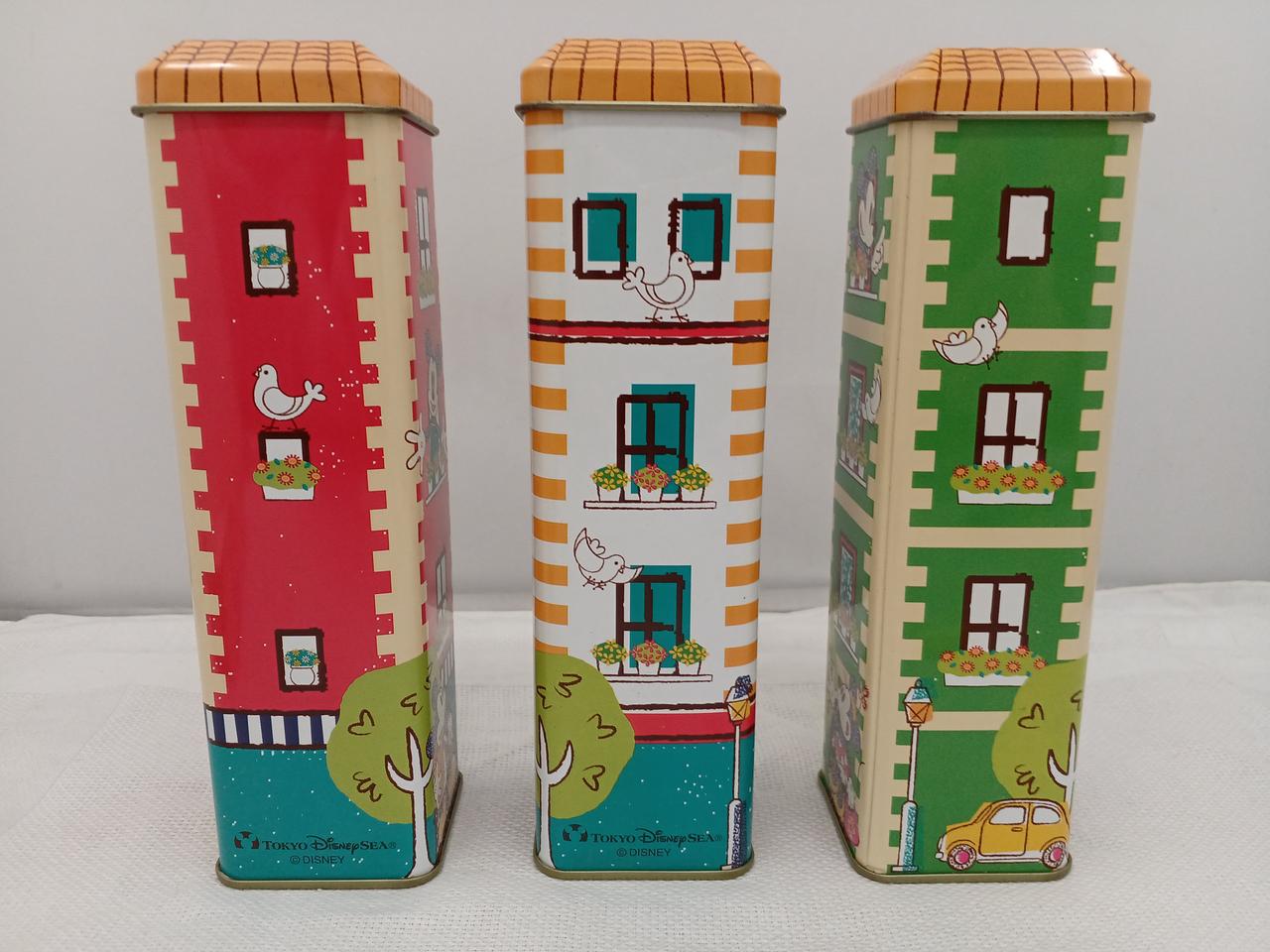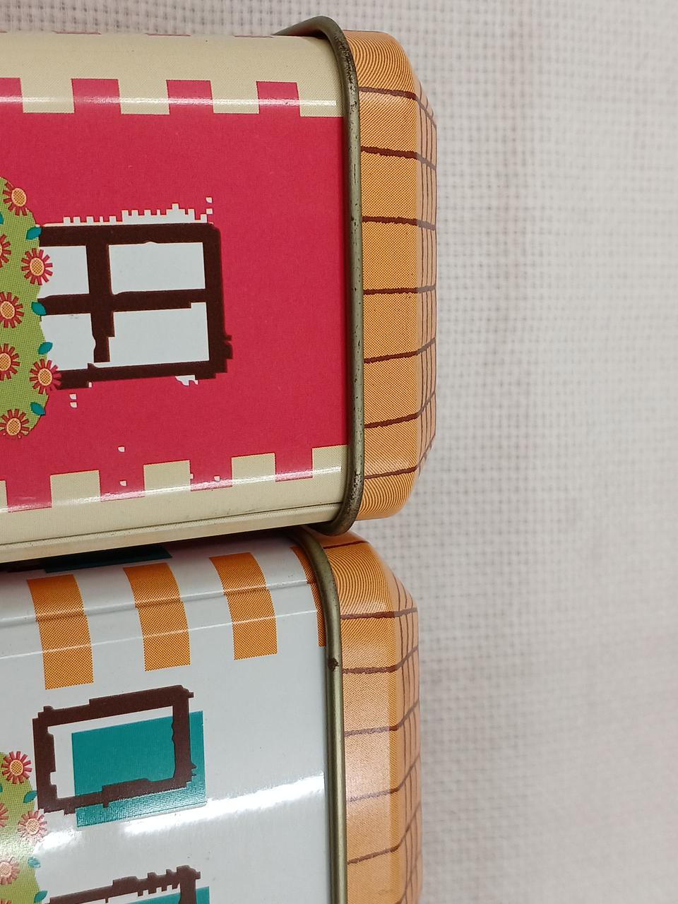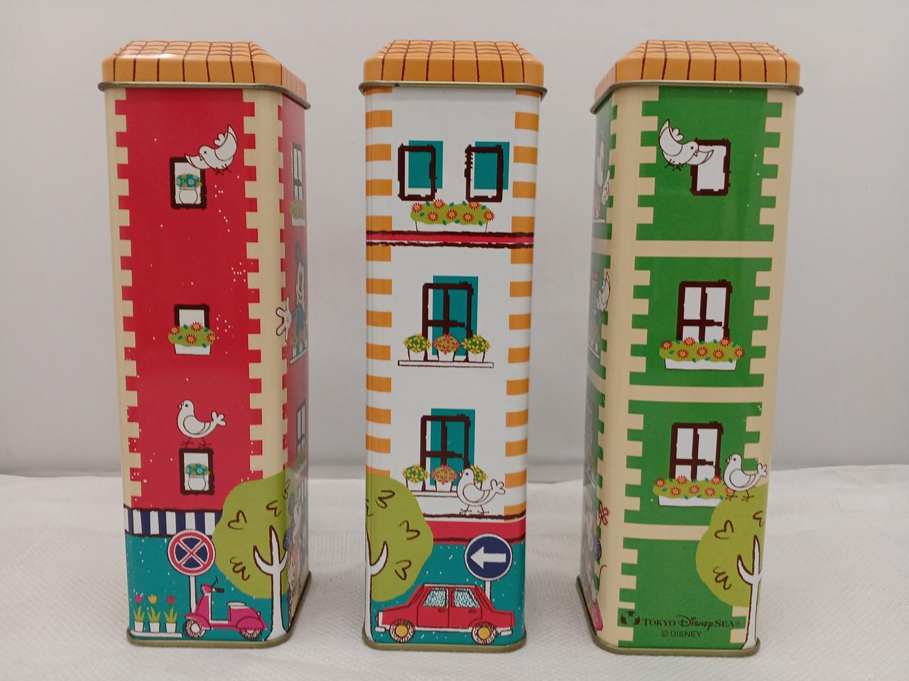 お菓子の缶だったようです。三色のアパート風のデザインがかわいい♪