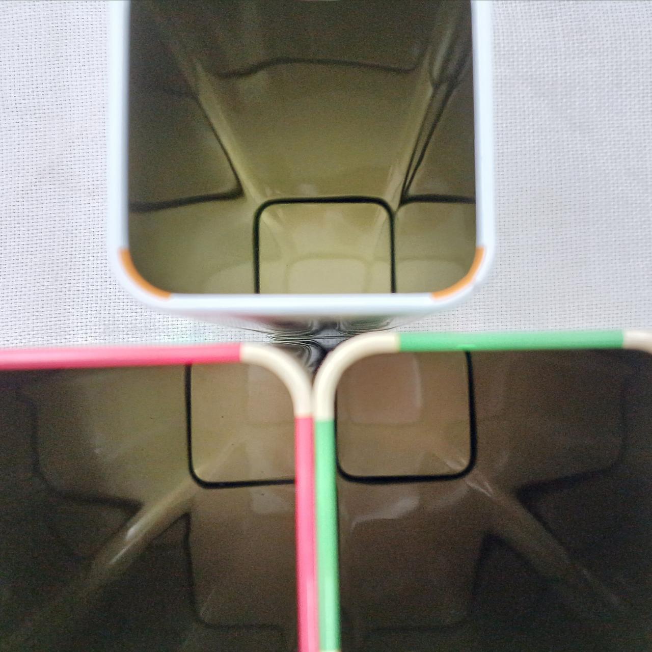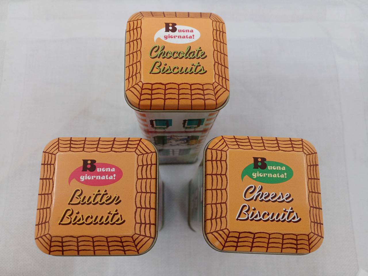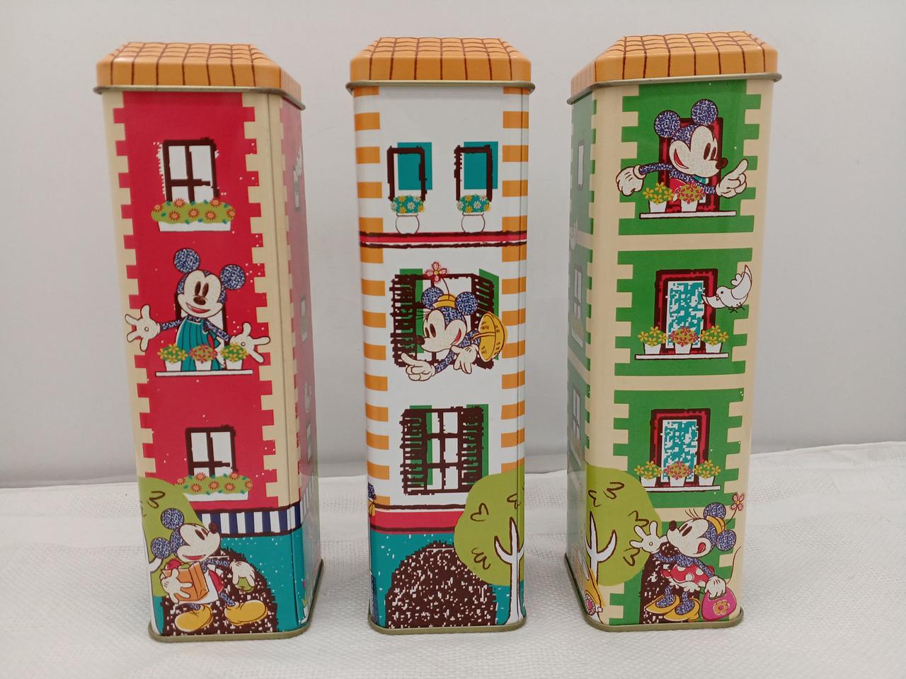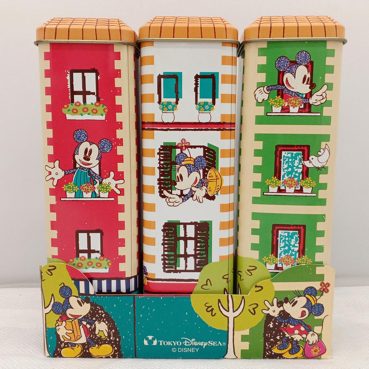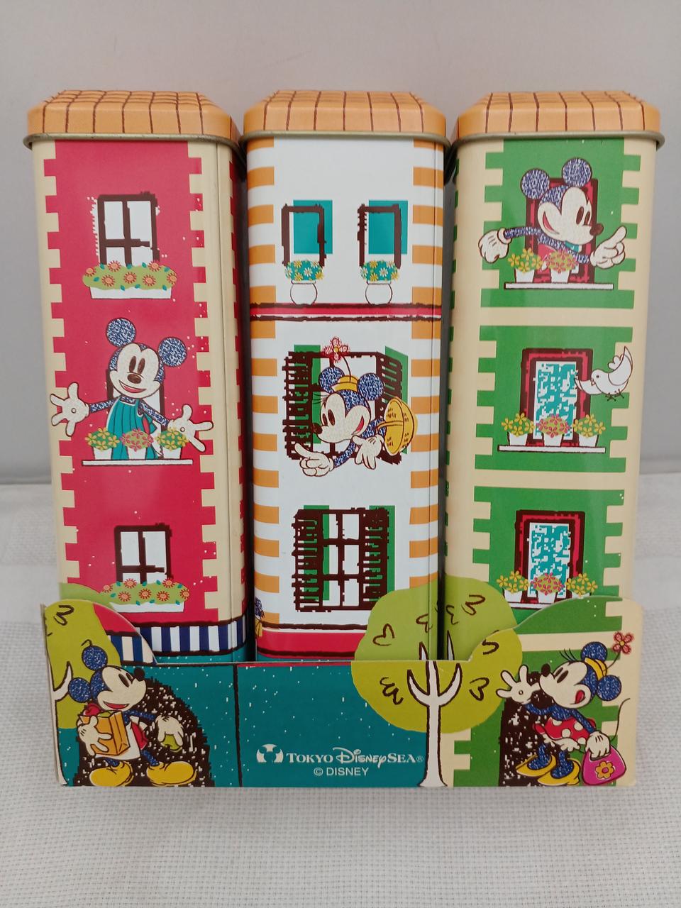 お菓子の缶だったようです。三色のアパート風のデザインがかわいい♪