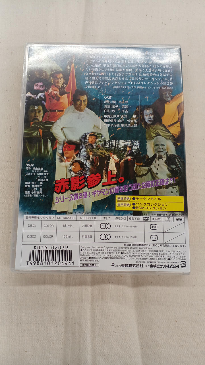 我らの赤影たちが陸海空の大冒険。特撮を駆使して描く大忍術合戦に加え、今回は巨大なUFO兵器まで登場する。 |