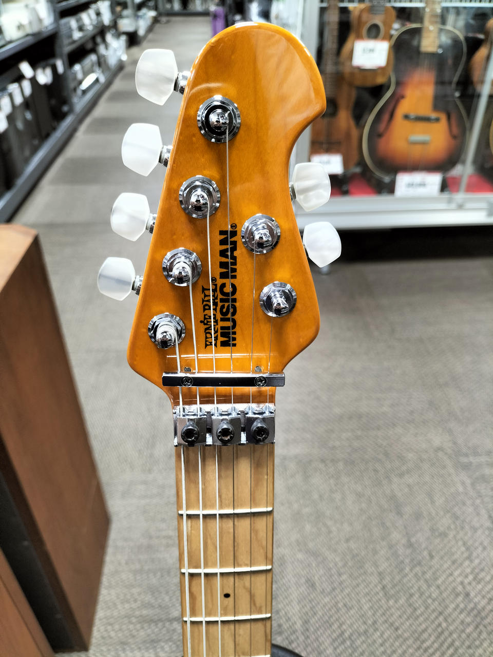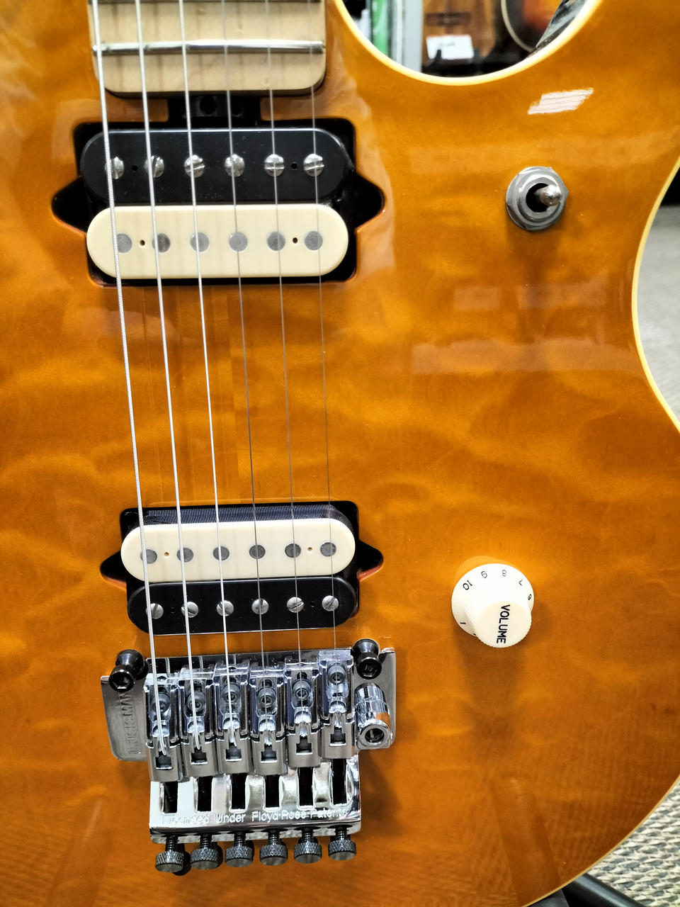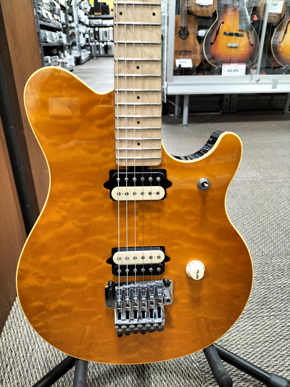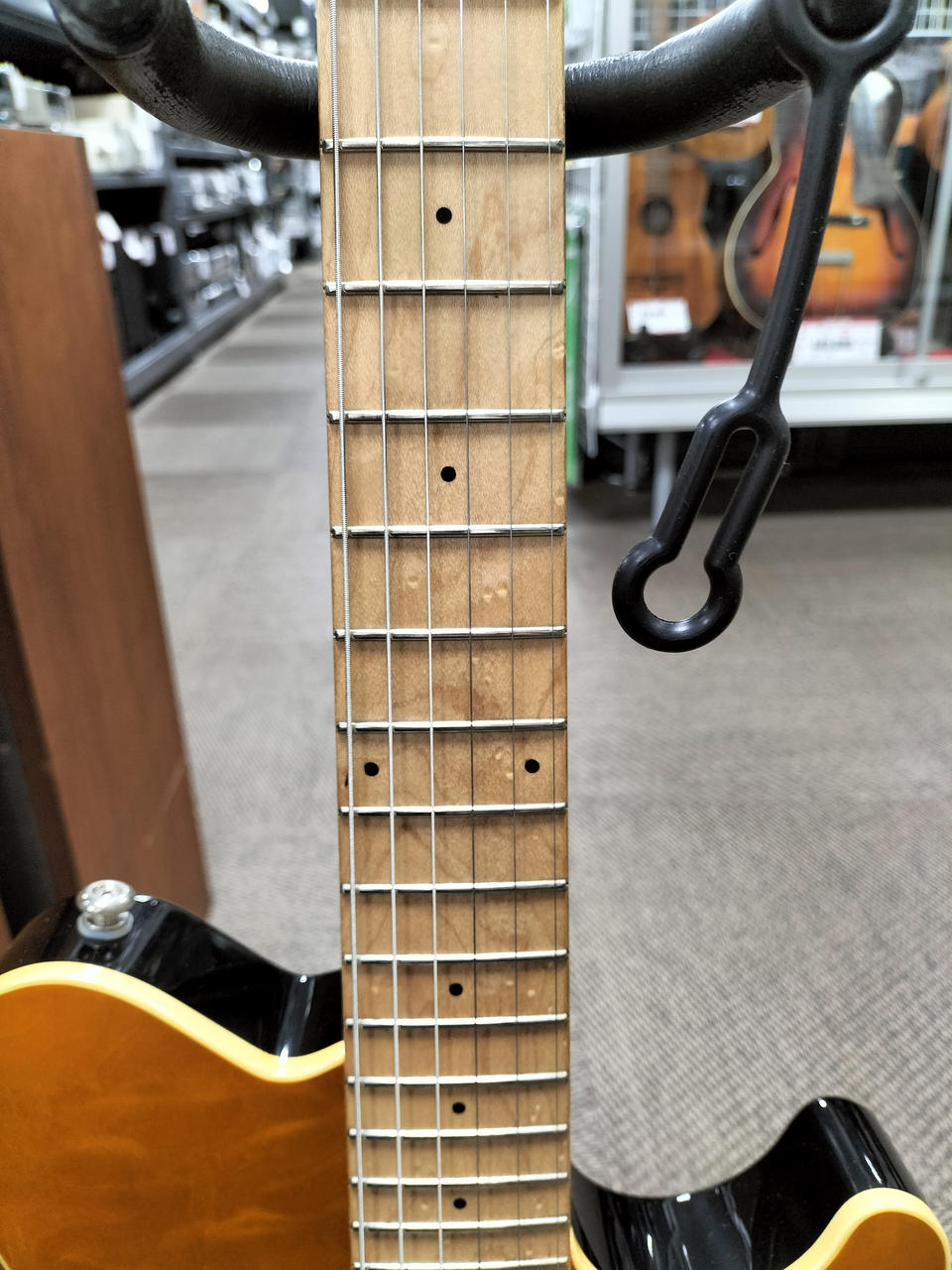 トップ材にキルテッドメイプルを採用したスタイリッシュなボディとメイプルネックと指板。 |