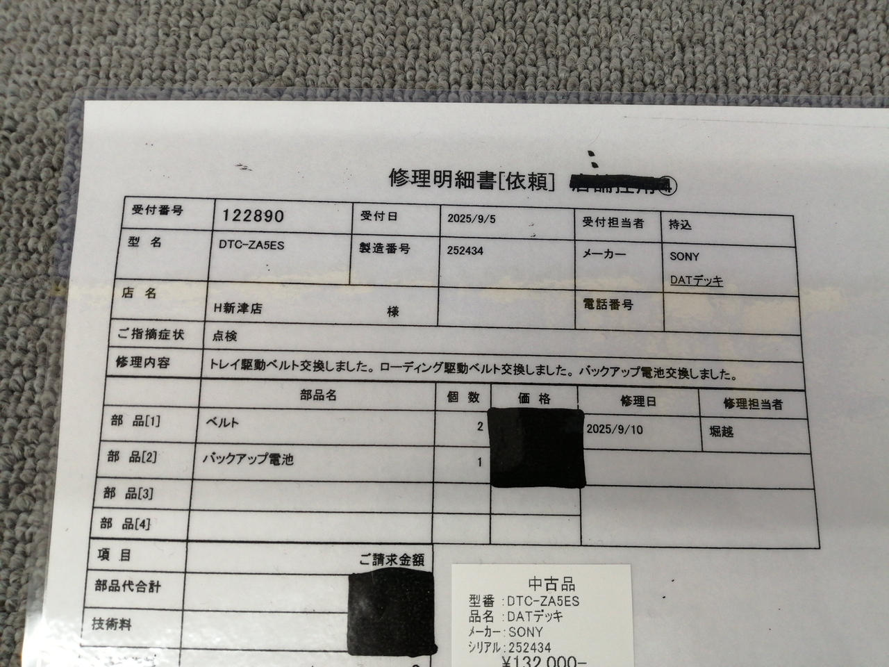 メンテナンス内容:トレイ駆動ベルト交換しました。ローディングベルト交換しました。バックアップ電池交換しました。 |
