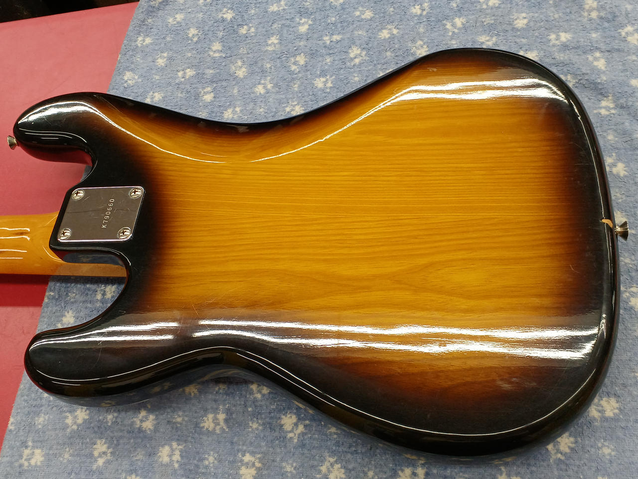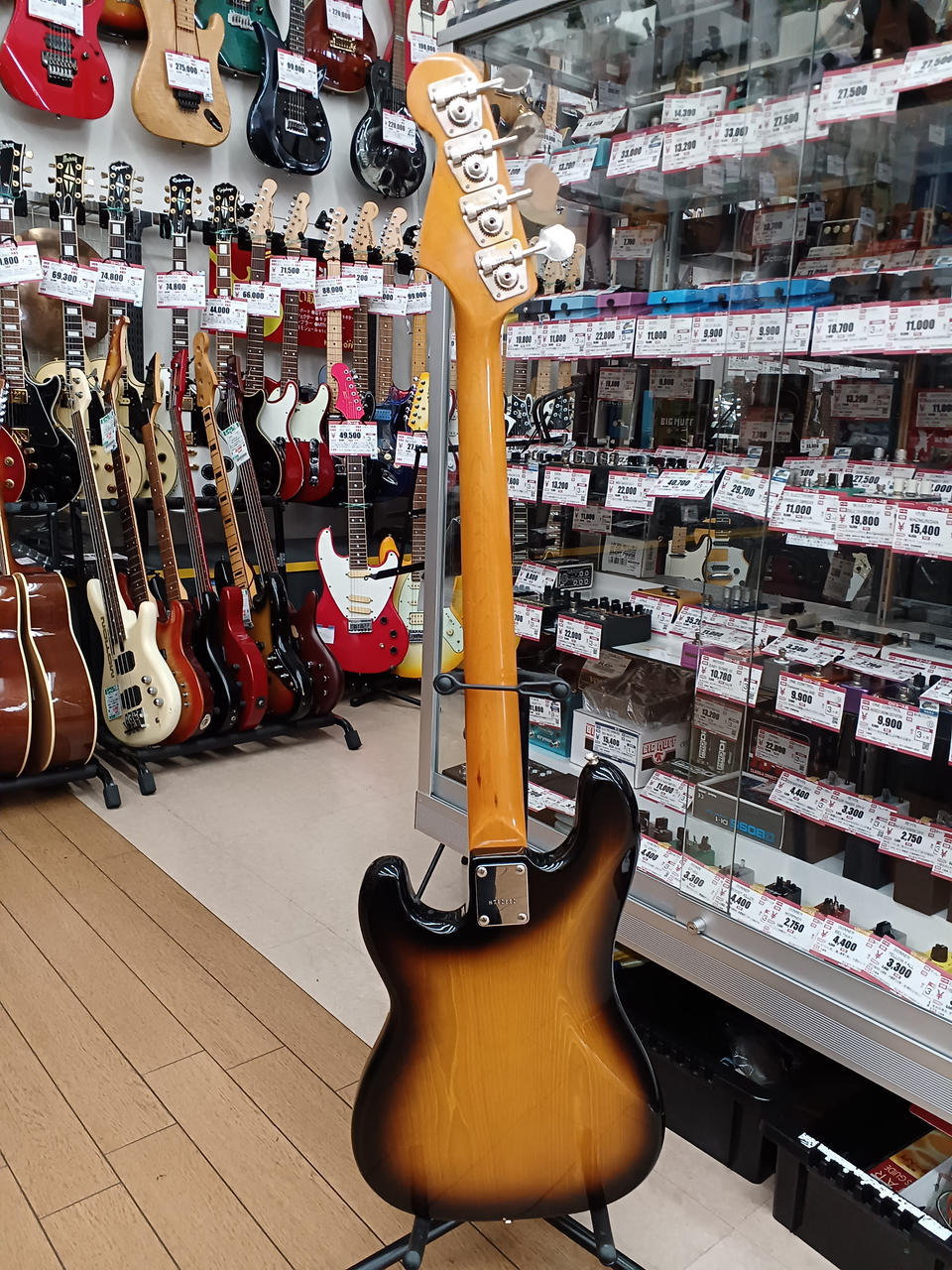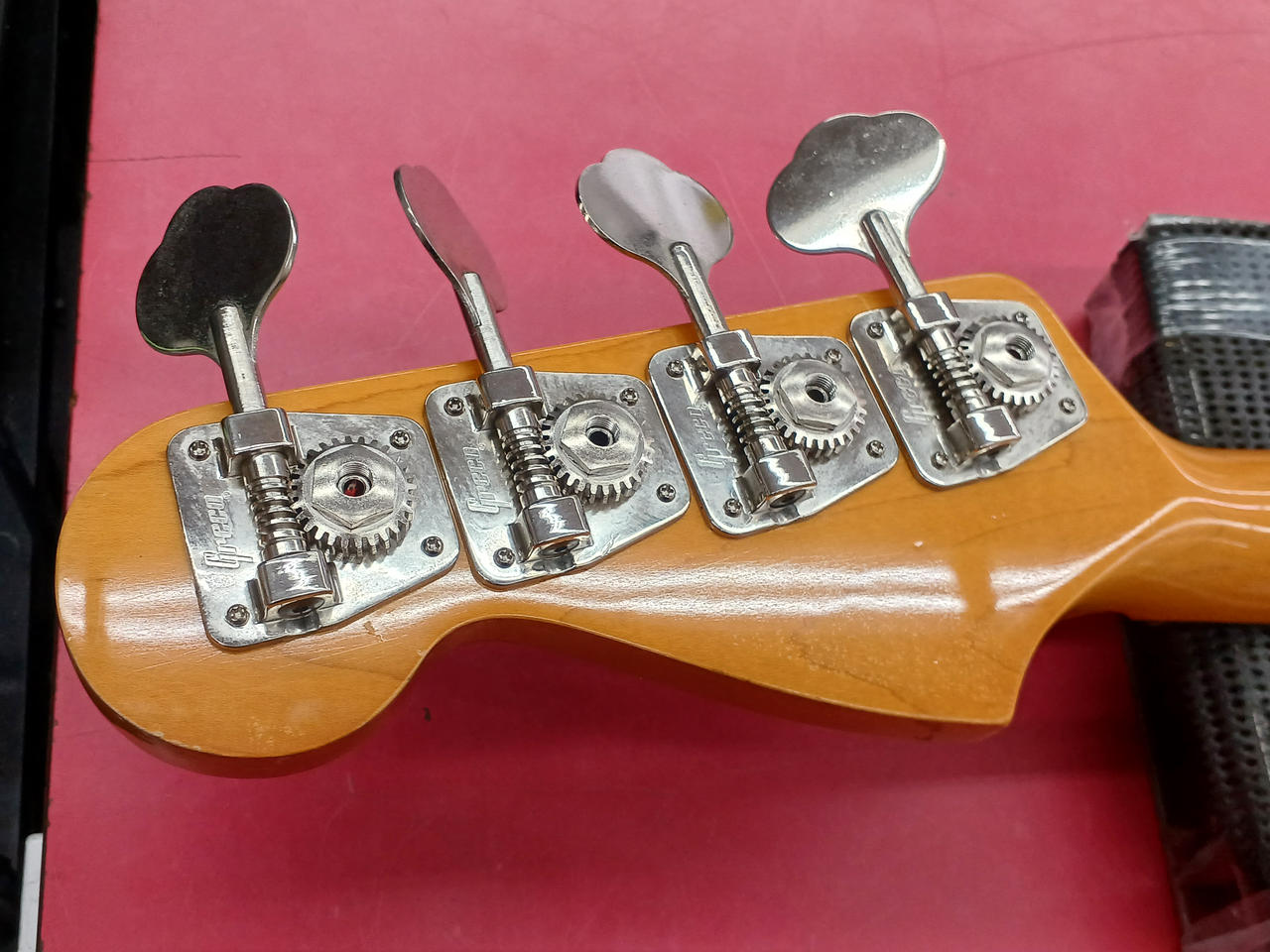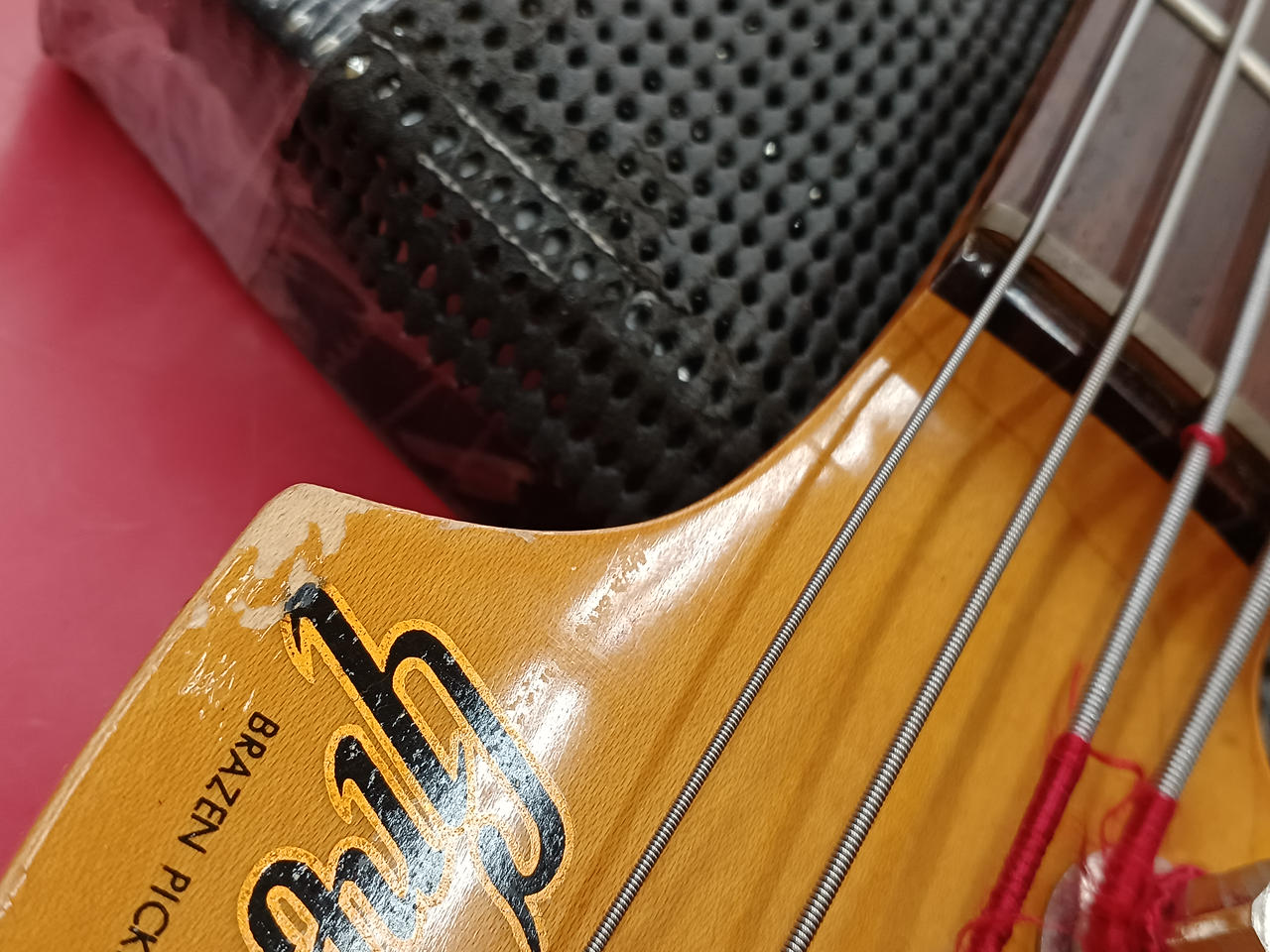 アルミピックガード & ブラスナット が特徴的な当時の上位モデルの、更に珍しいローズウッド指板の個体です。 それら、ハードウェア類の組合せにより、ドッシリした質感で落ち着きのある、大人な低音 の一本です。 |
