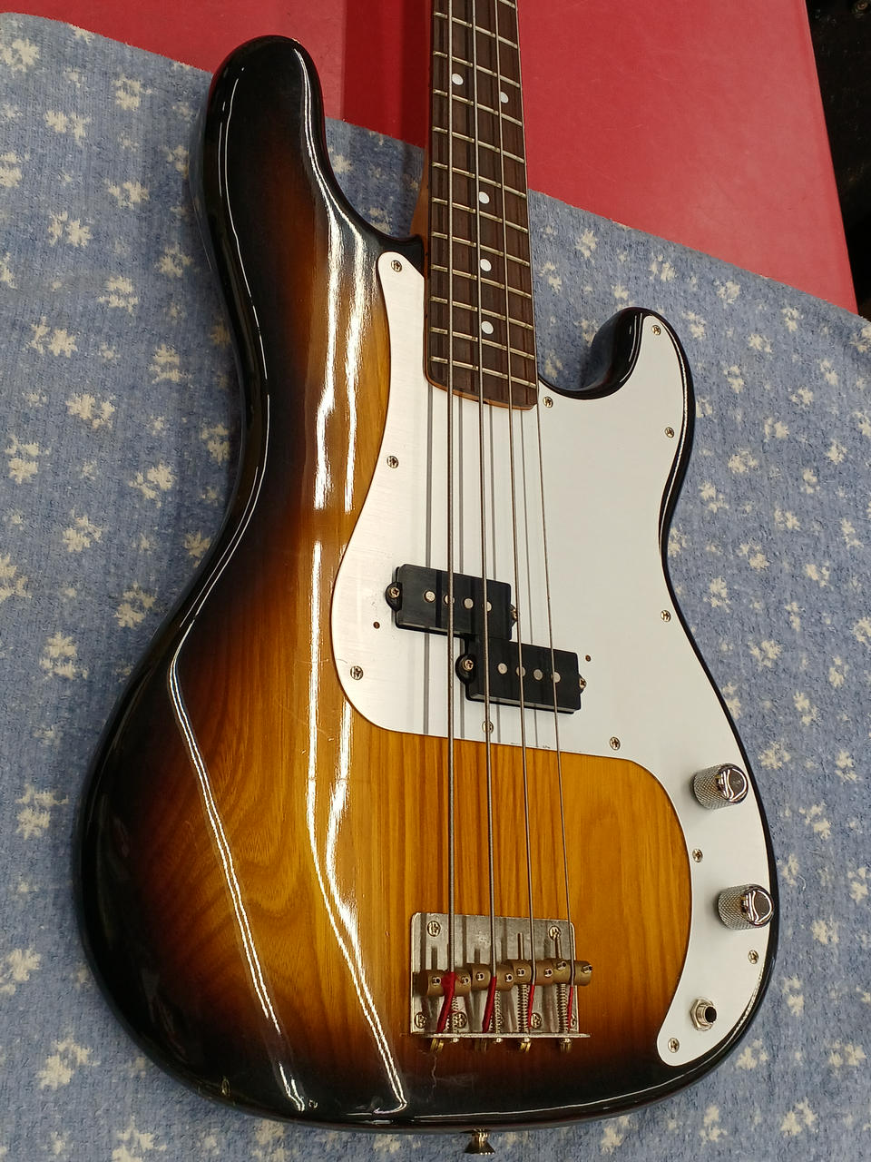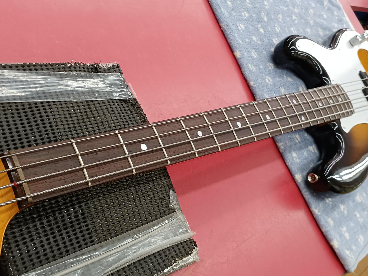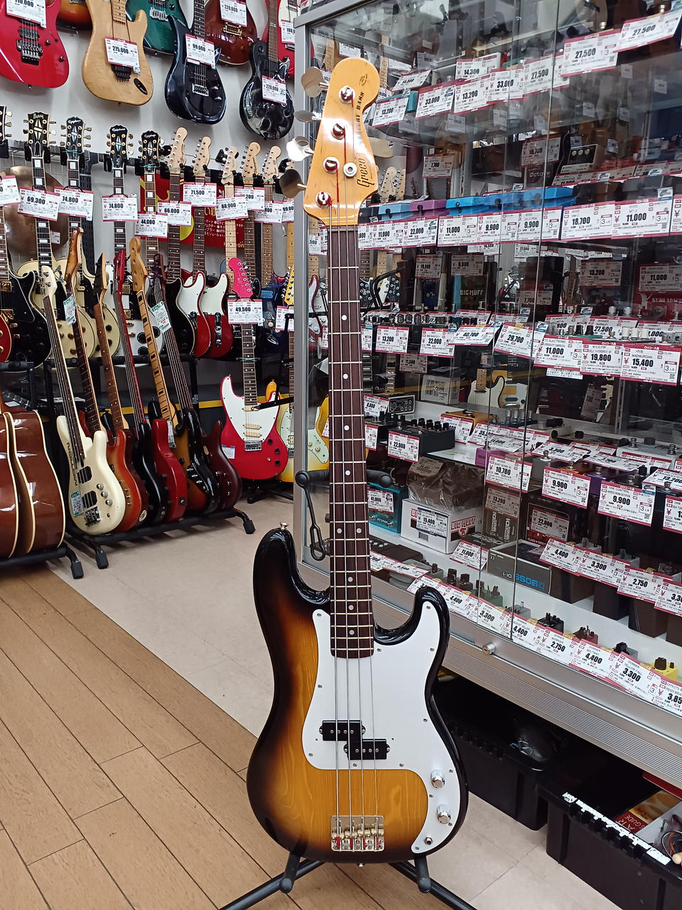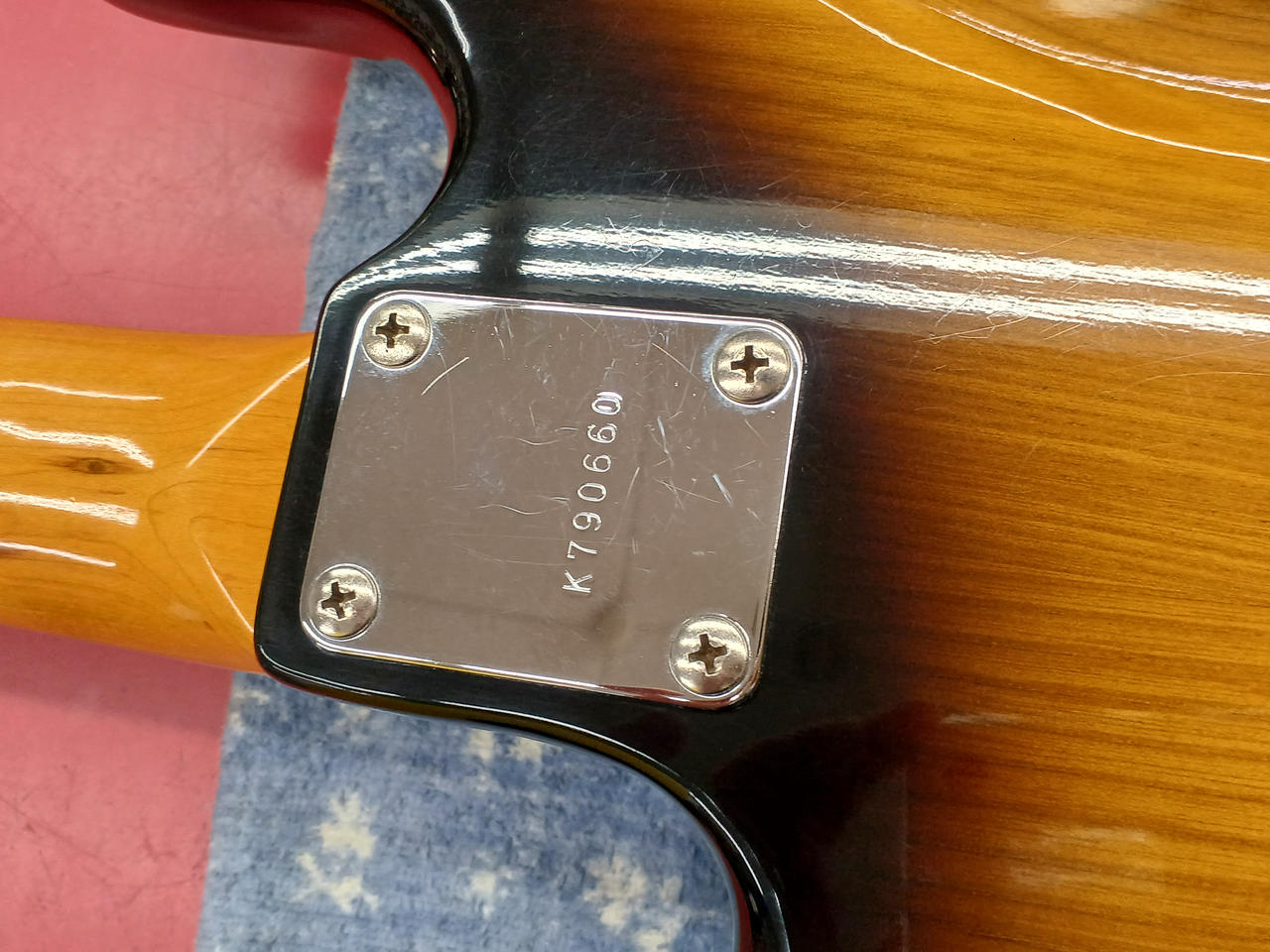 アルミピックガード & ブラスナット が特徴的な当時の上位モデルの、更に珍しいローズウッド指板の個体です。 それら、ハードウェア類の組合せにより、ドッシリした質感で落ち着きのある、大人な低音 の一本です。 |