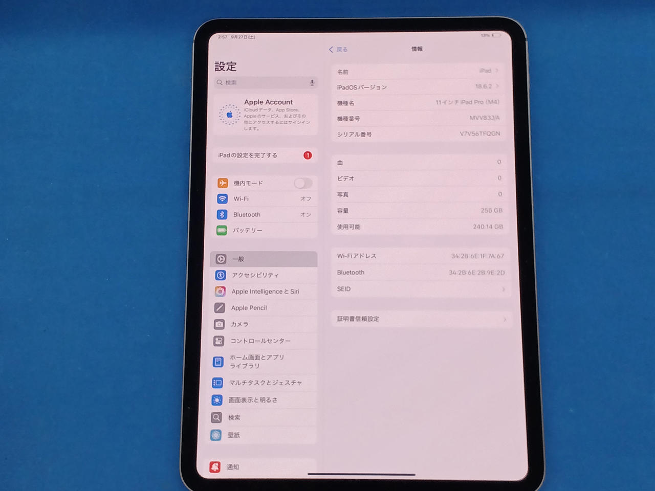 ios:18.6.2ストレージ容量:256GB WI-FIモデル画面サイズ:11インチ |
