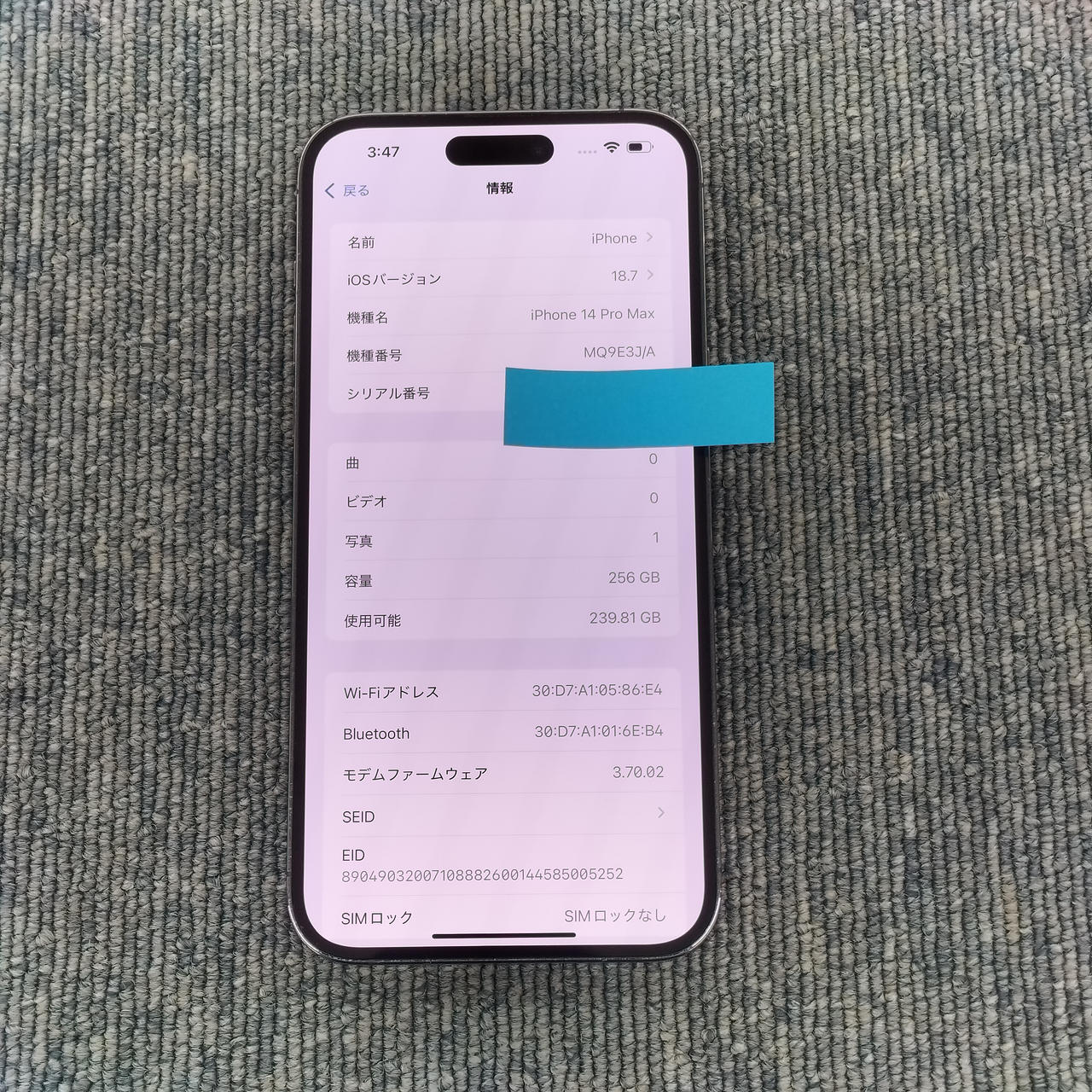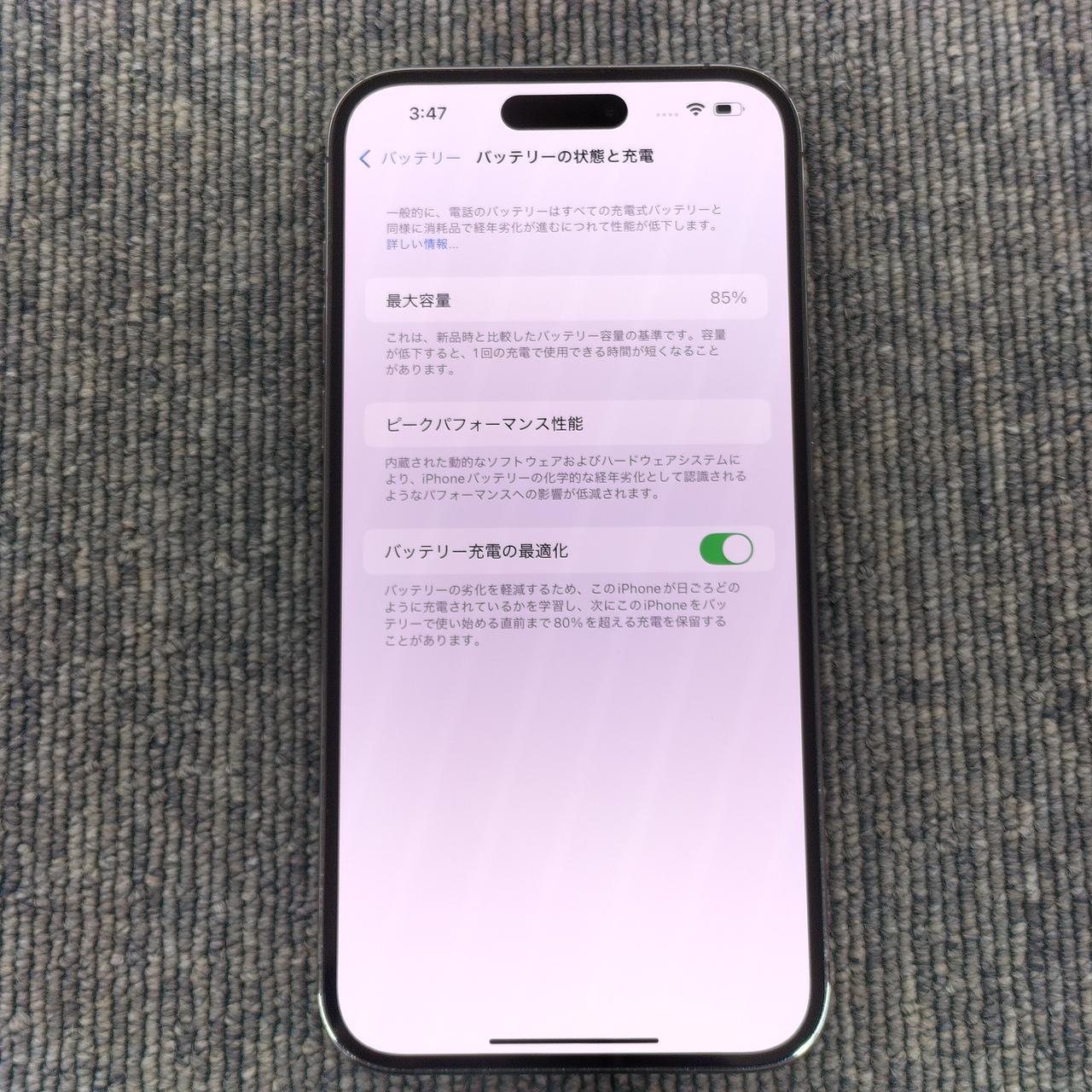 256GBモデル iOS18.7 バッテリー最大:85% |