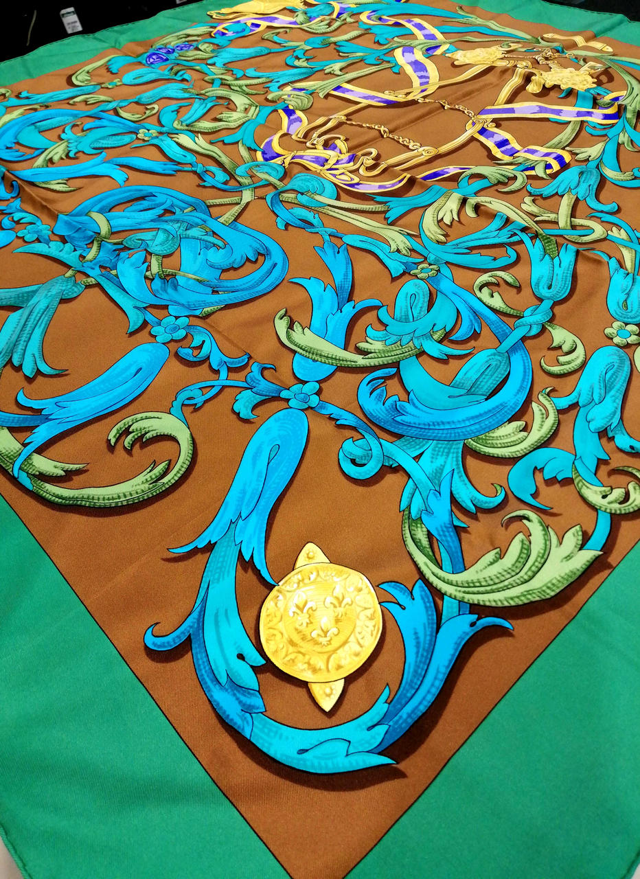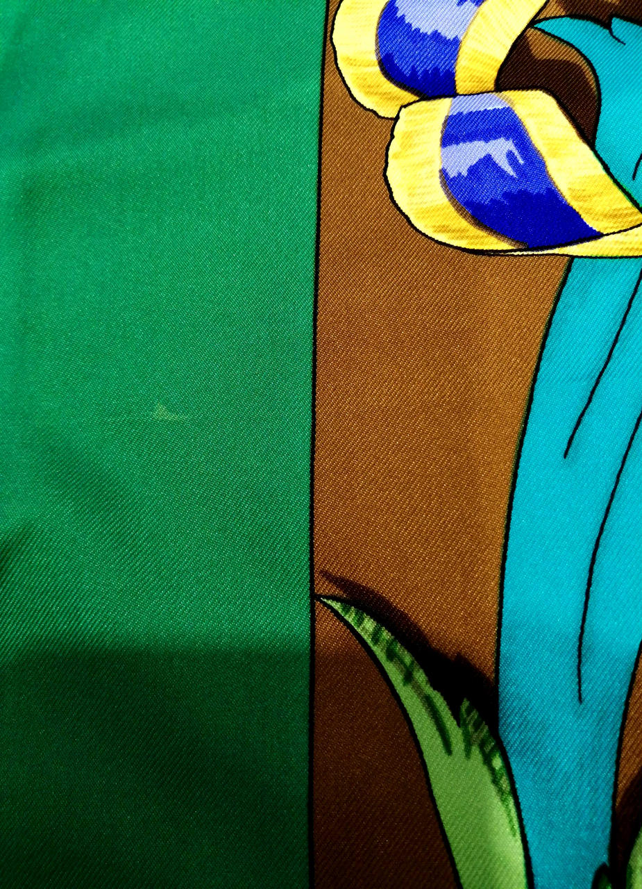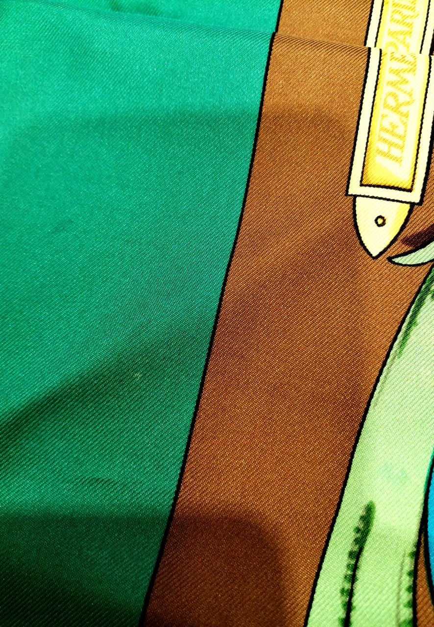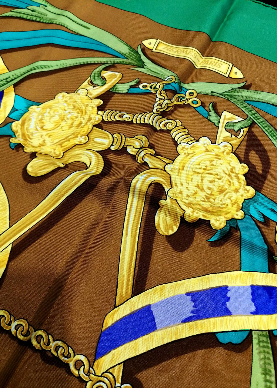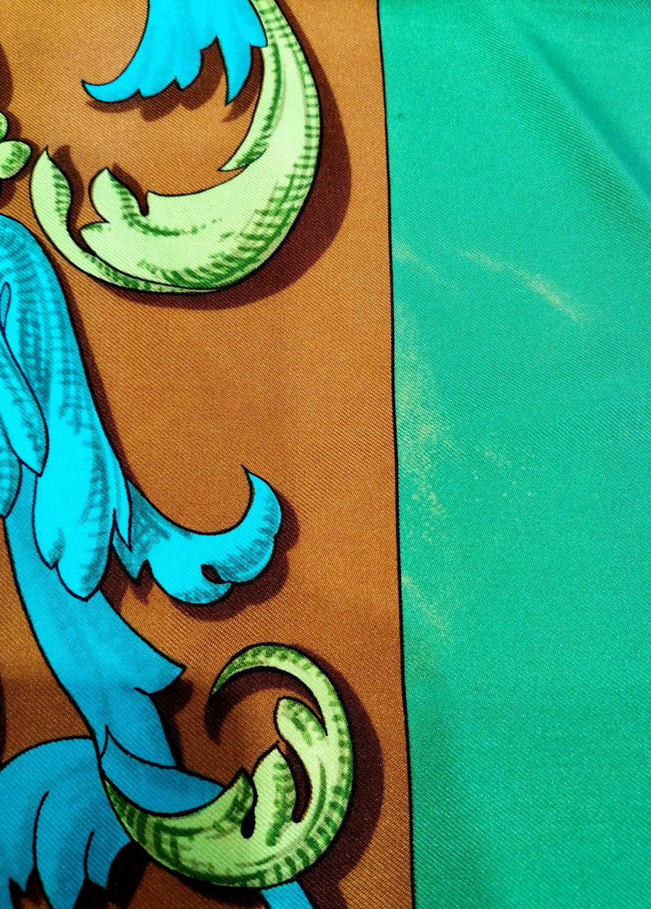 鮮やかなグリーンとブラウン色のおしゃれなスカーフです!緑の部分、うっすらシミありますが全体的には綺麗なお品物です。普段遣いにどうぞ!画像参照。