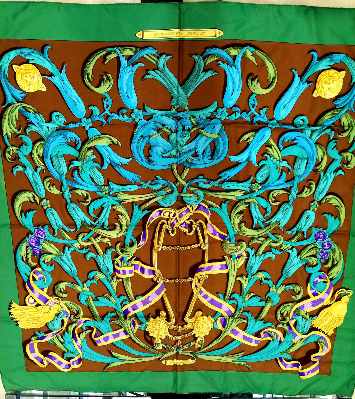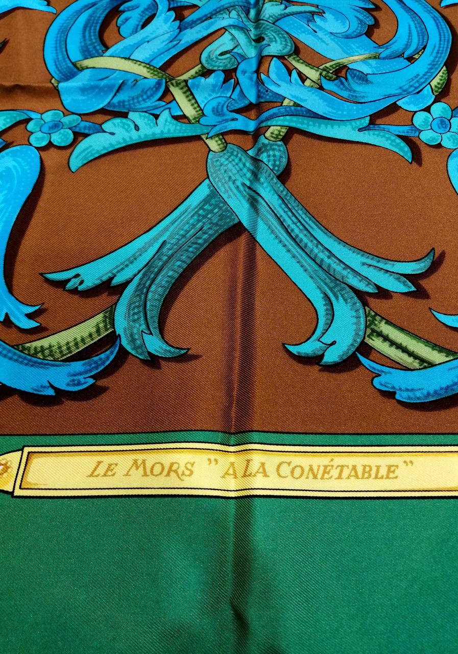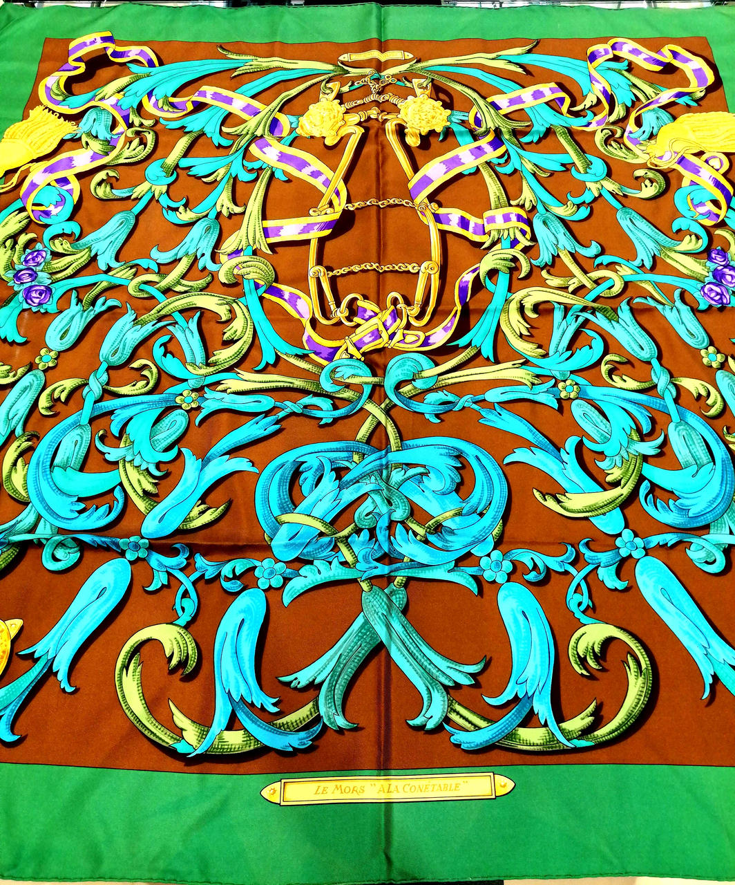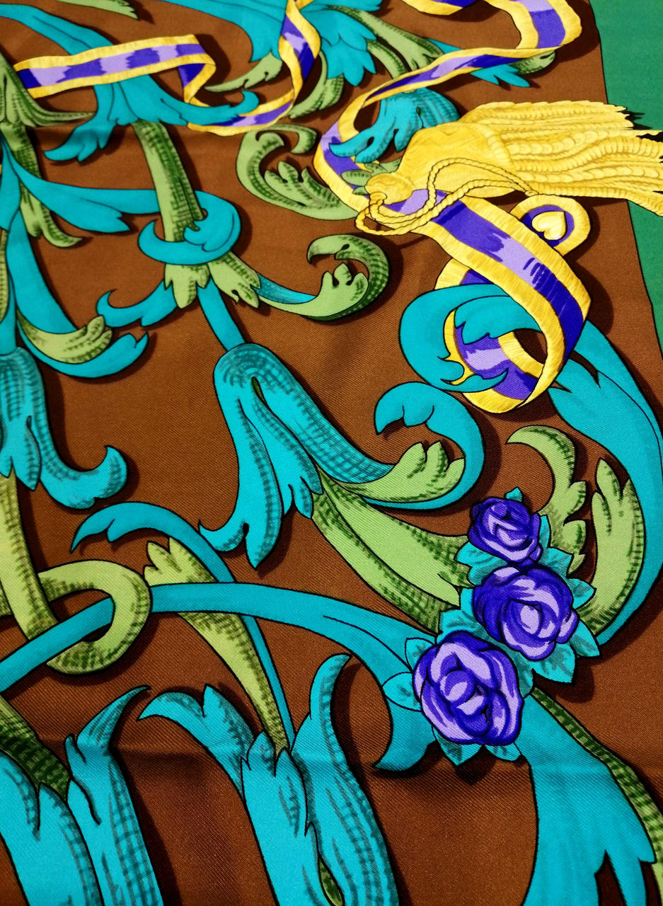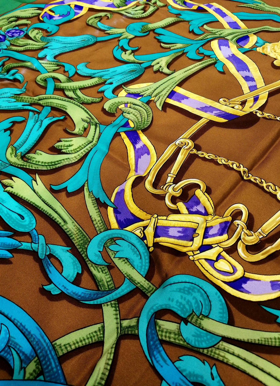 鮮やかなグリーンとブラウン色のおしゃれなスカーフです!緑の部分、うっすらシミありますが全体的には綺麗なお品物です。普段遣いにどうぞ!画像参照。