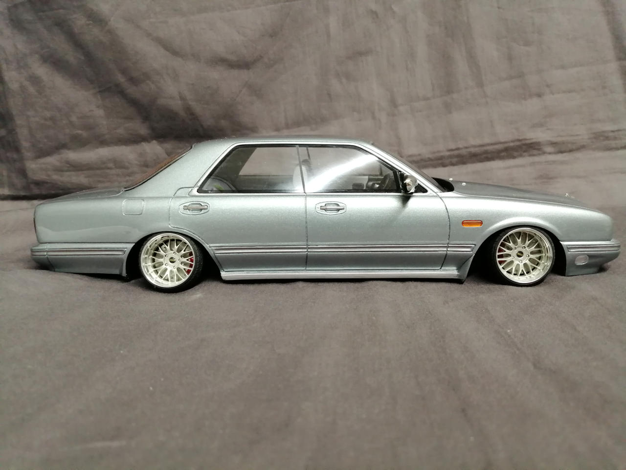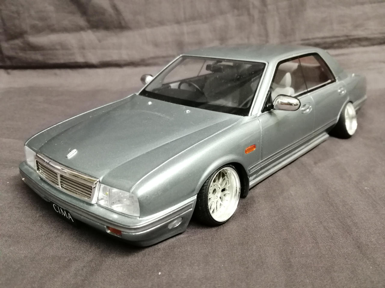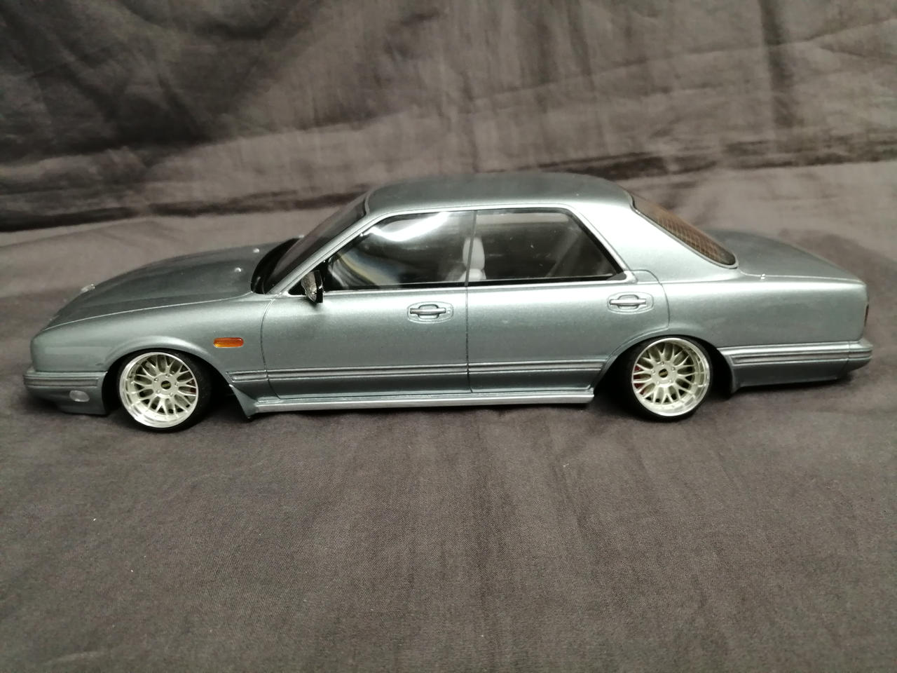 車輪を一度切って鬼キャン仕様に加工してあります。塗装の一部に溶けたような跡があります。車体色はブルーですがホワイトの箱に入っています。箱に傷み多数あり。 |