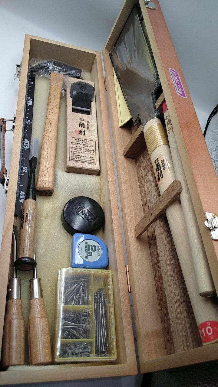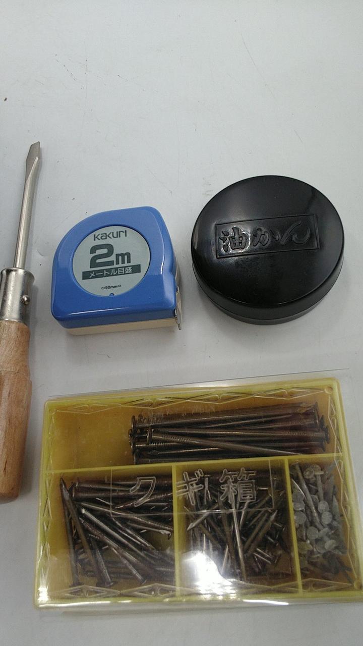 ノコギリ、キリ、油かん、コンベックス、釘箱、ハンマー