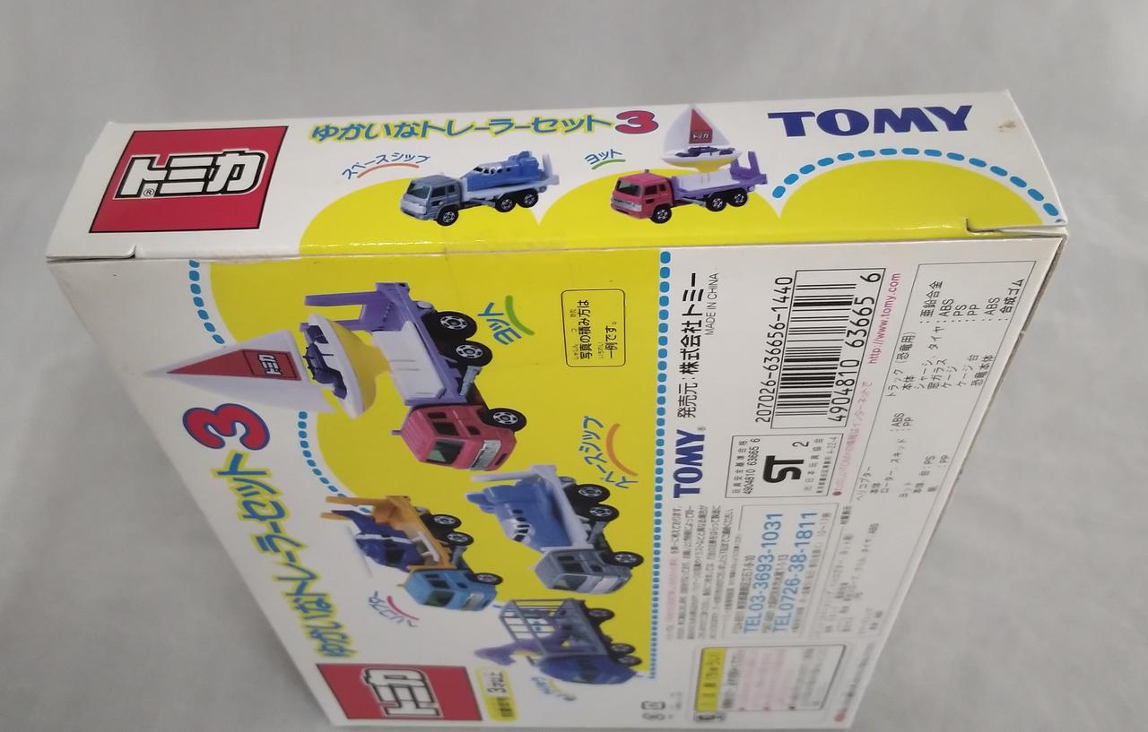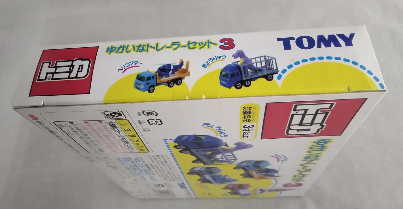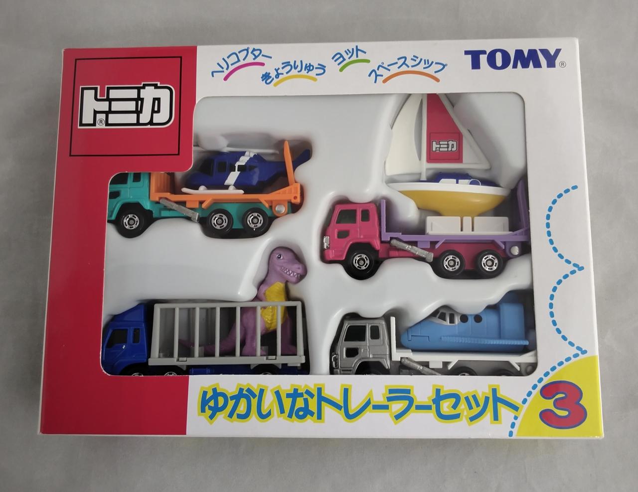 恐竜運搬トラック、ヘリコプター運搬トラック、スペースシップ運搬トラック、ヨット運搬トラックの4台セットです!