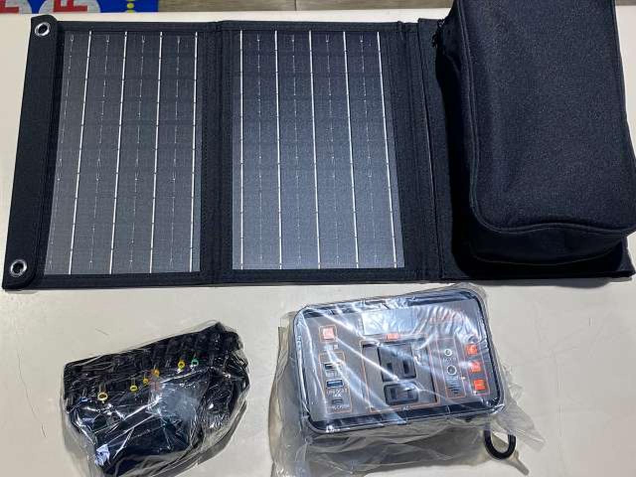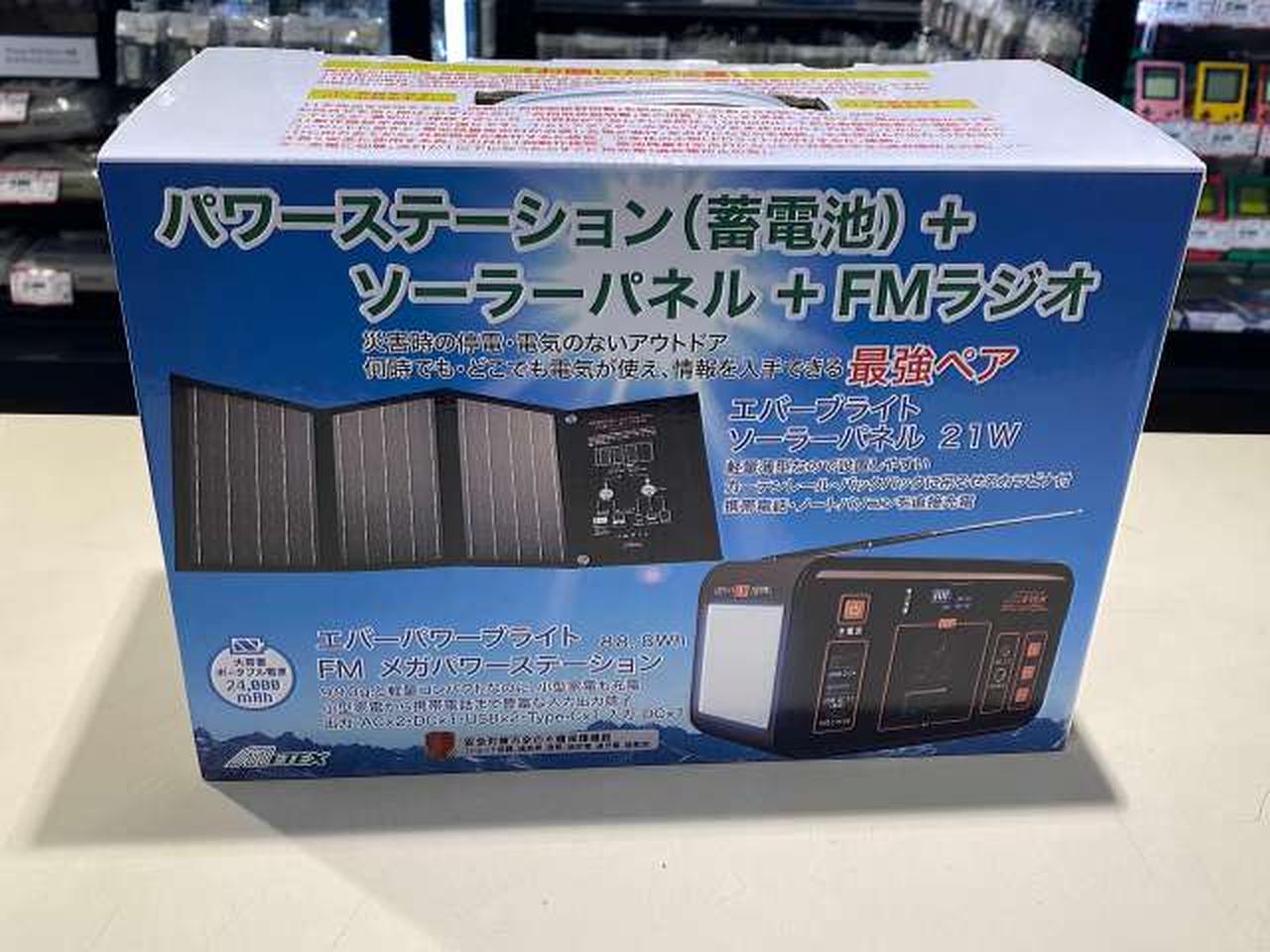 コンセントもついているので小型家電も使える! 最大ワット数:80Wソーラーパネルセット、自動選局ワイドFMラジオ機能付き |