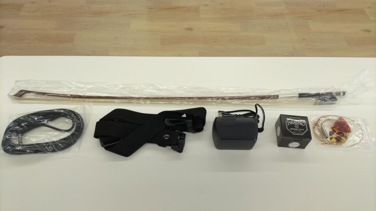 ・取扱説明書・電源アダプター・ケース・付属品(弓、松脂、ピックなど) |