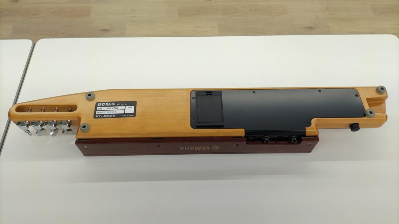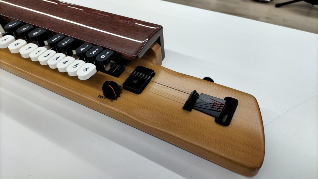 バイオリンのように弓で奏でたり、大正琴のように指やピックで奏でたりと多彩な表現が可能。練習時はヘッドホン、パフォーマンス時はアンプに出力してと使い分け可能。 |