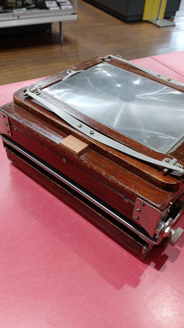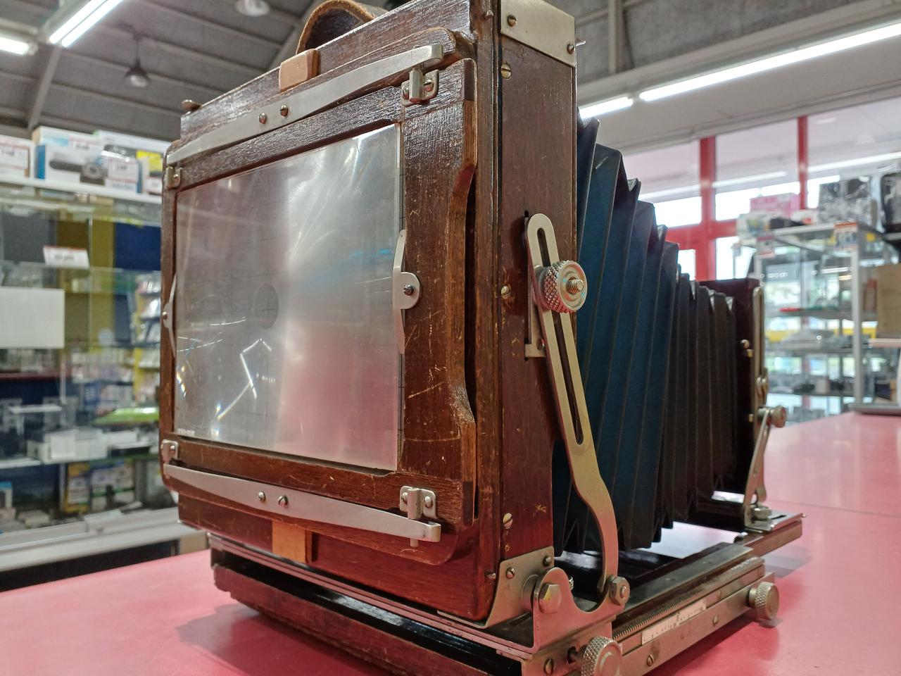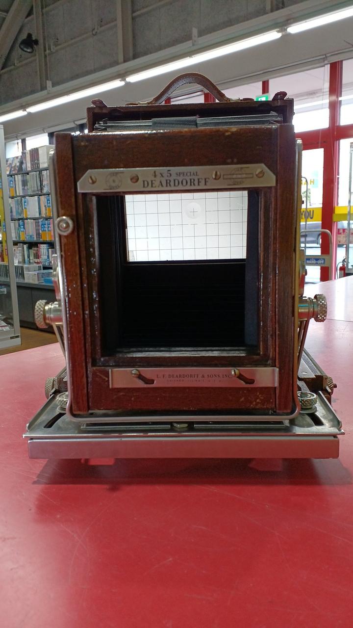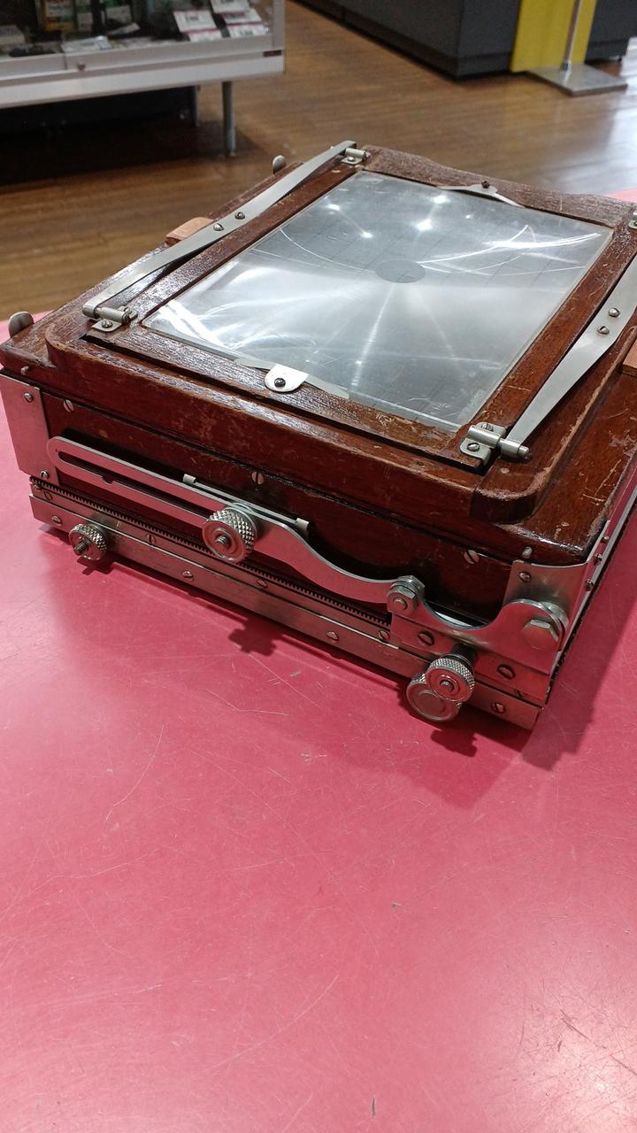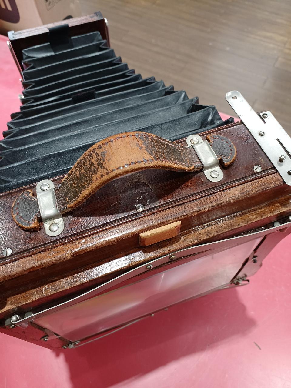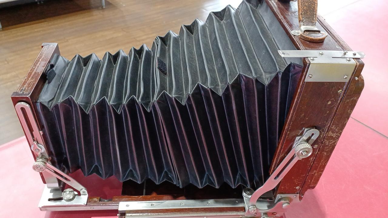 各部分が年代以上に傷んでいるように見えます。蛇腹に穴は空いていないですが劣化しています。前オーナーが使い易いように加工してある箇所が見られます。動かせる部分が正常なのか判断ができず、傷みも大きいためジャンク品です。