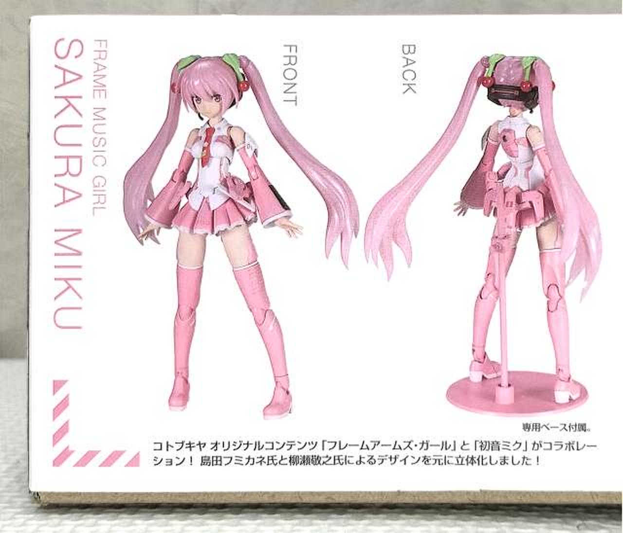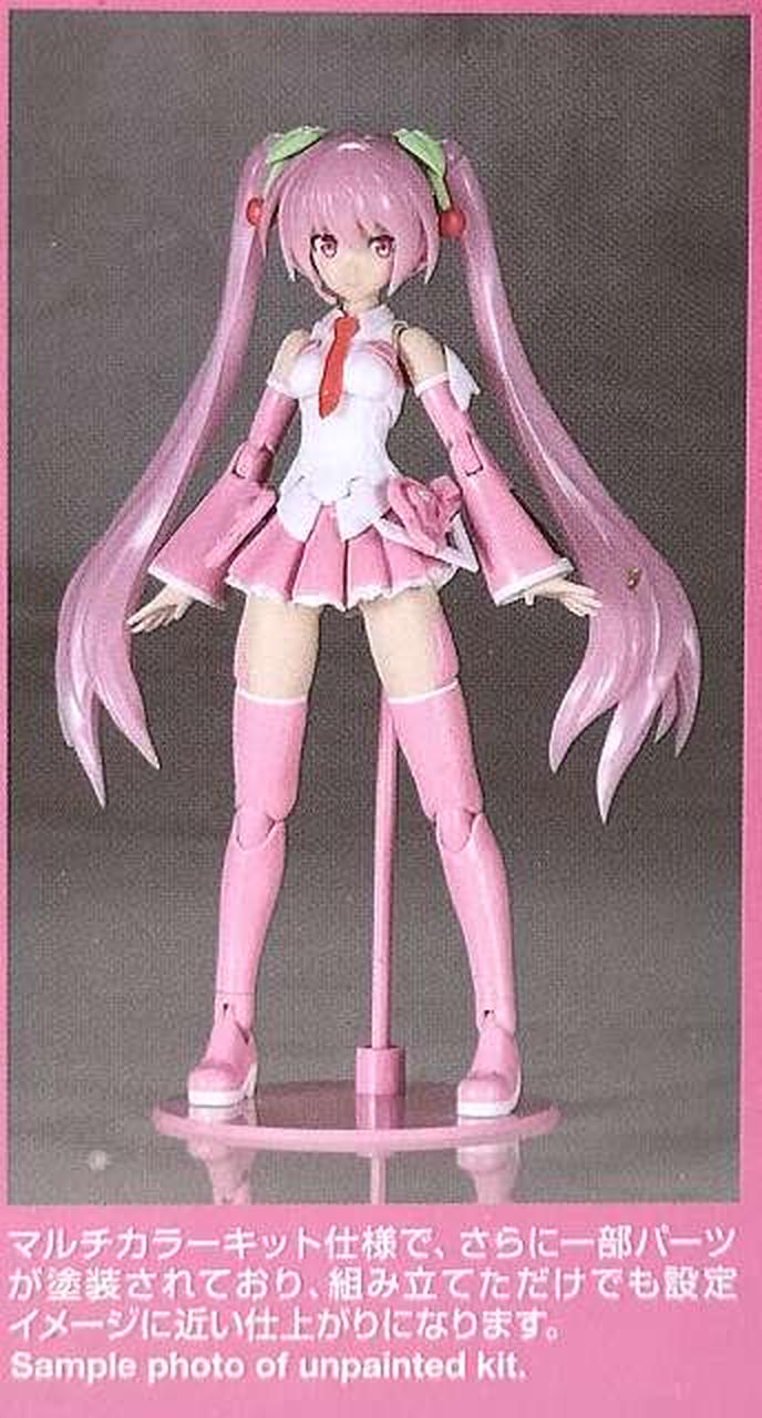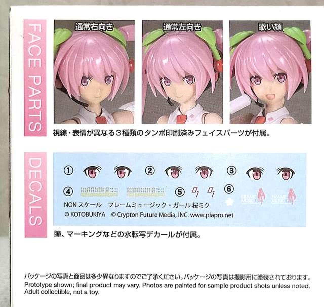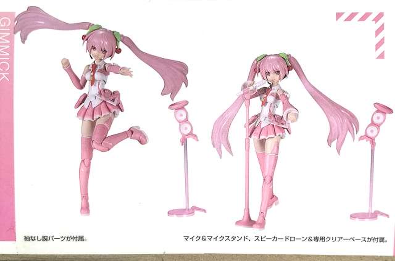 特徴的な桜カラーに全身の成形色を変更 / 髪飾りのさくらんぼを新規造形で再現 / 表情パーツは特徴的な「歌い顔」「通常左向き」「通常右向き」の3種が付属 / 表情パーツは塗装済みなので組み上げただけでも設定に近い仕上がりに / マイク&マイクスタンド、スピーカードローン&専用クリアベース、初音ミク用ベースが付属 / 初音ミクVer.4モチーフの袖なし腕パーツも付属 / PVC製の手首が左右それぞれ5種付属。手首は関節を含め、既存のフレームアームズ・ガールシリーズの手首と組換えが可能 / 瞳などのデカールが付属 / スカートが可動し、脚部の可動範囲が拡大 / 背中、腰、ふくらはぎなどに配置された3mm径の穴により既存M.S.Gシリーズ、フレームアームズ各シリーズのパーツの併用が可能 |
