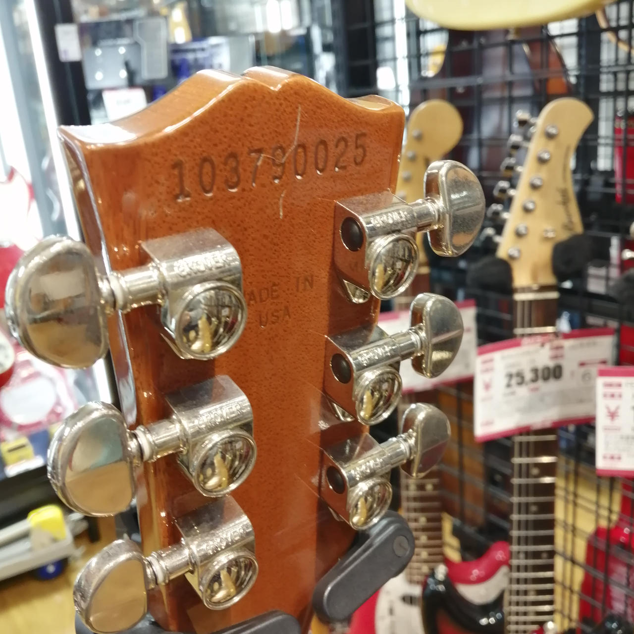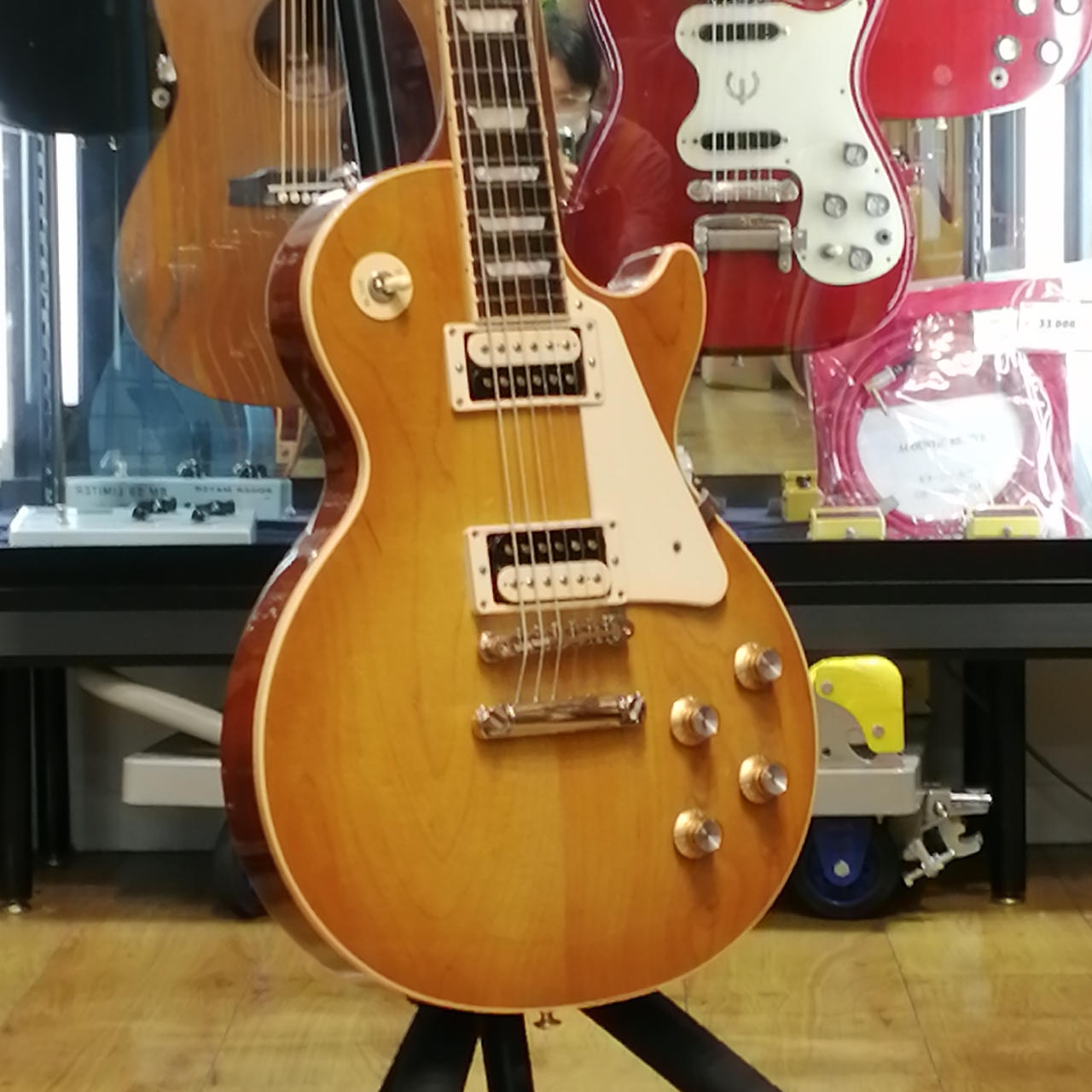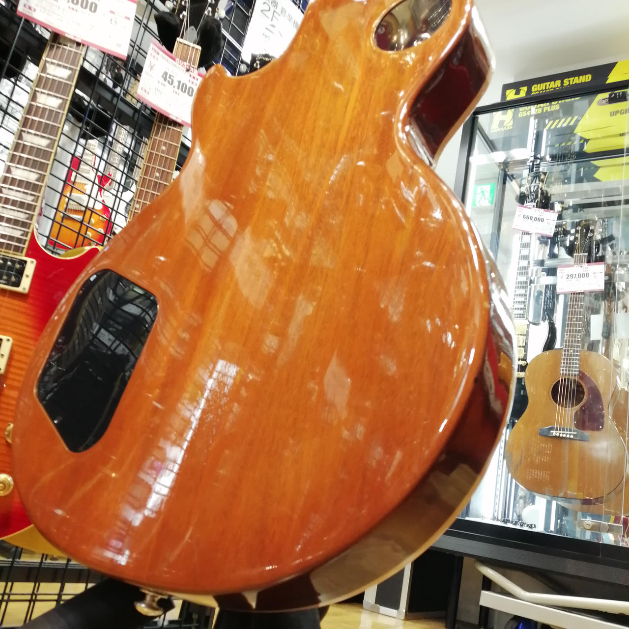 マホガニーボディ、メイプルトップ、マホガニーネック、ローズウッド指板、Weight Relief加工、43.05mmナット幅。 |