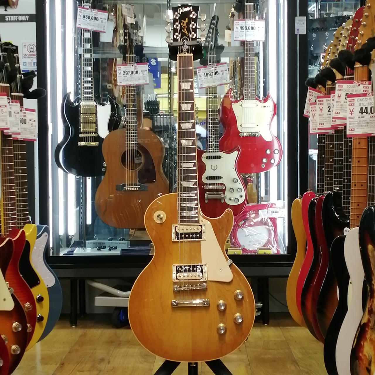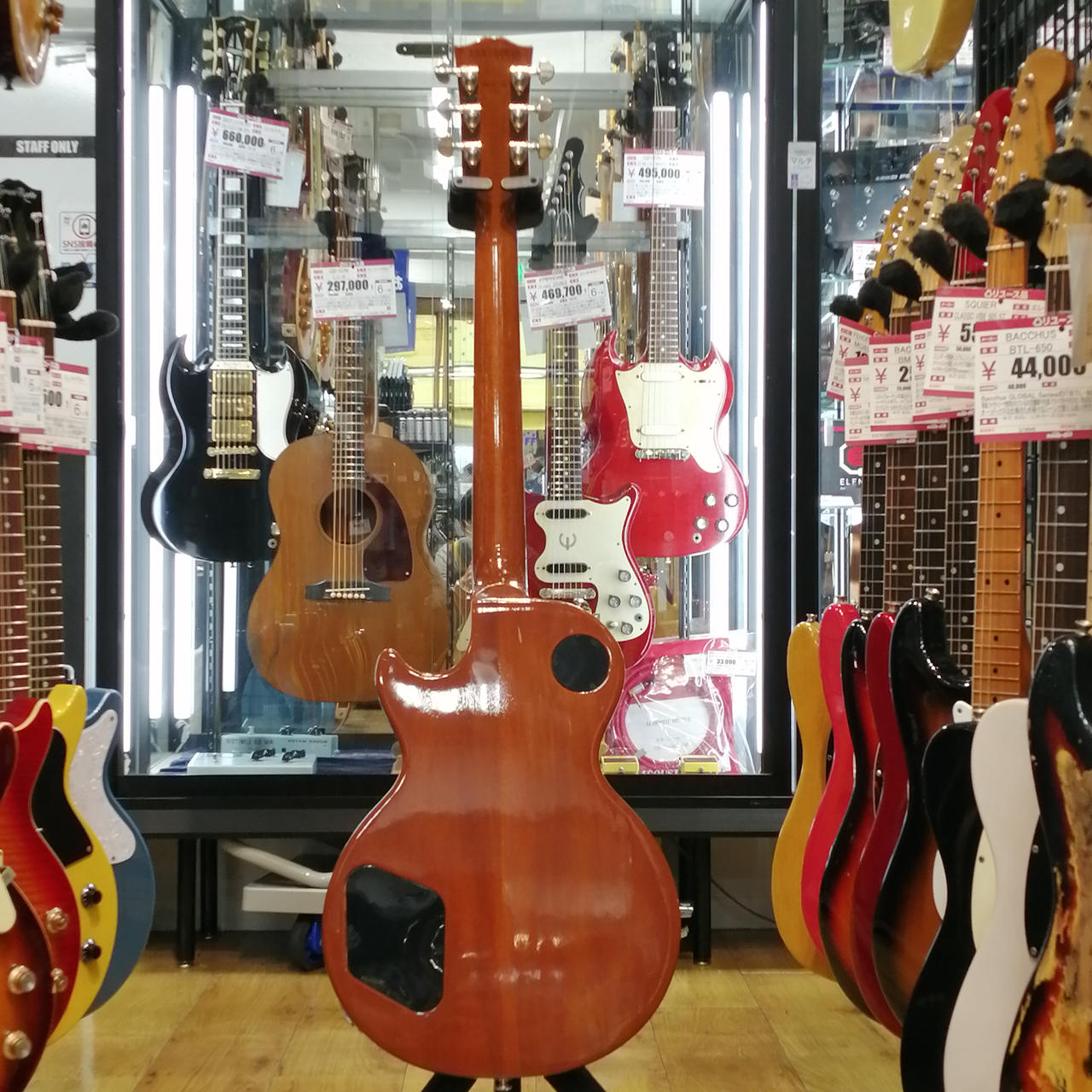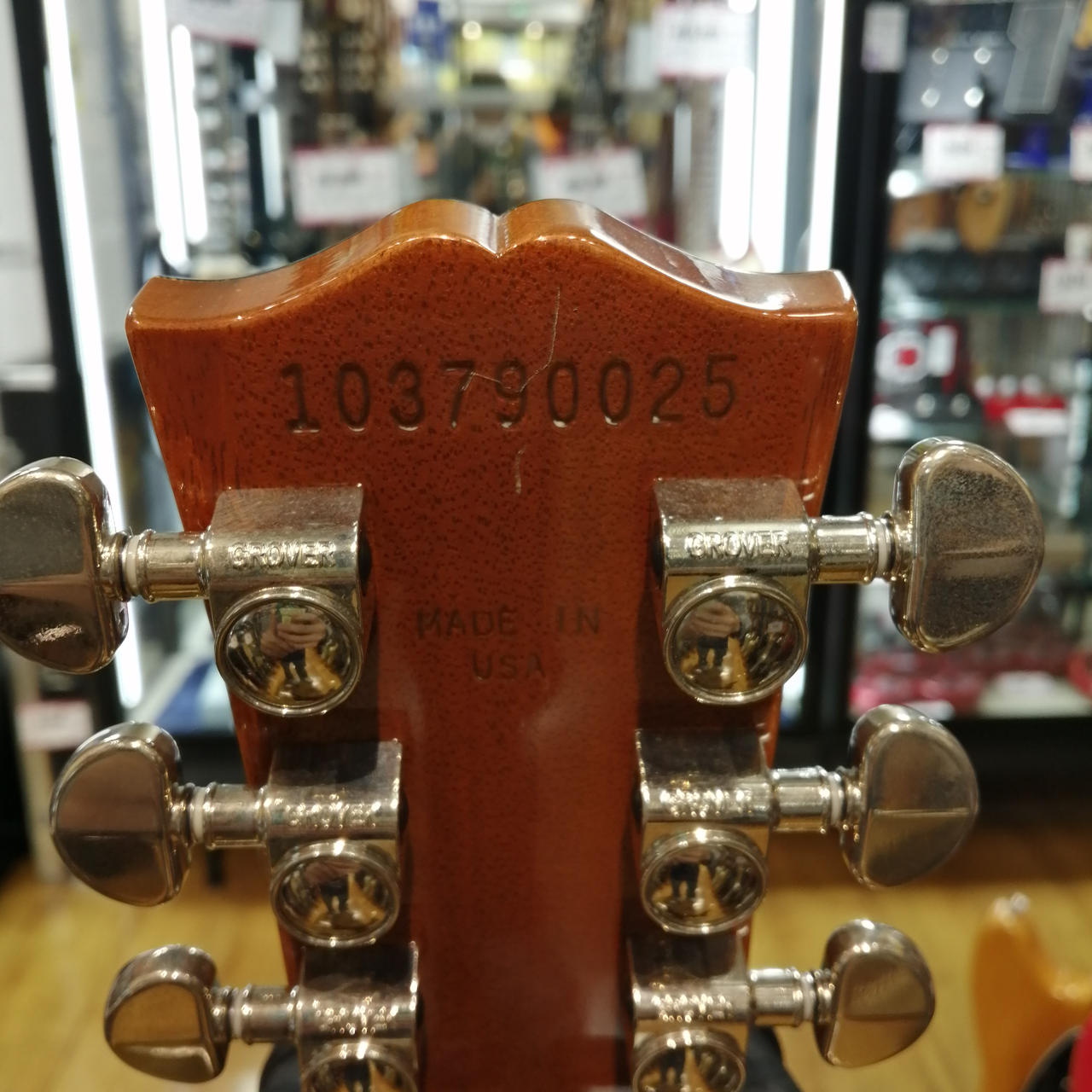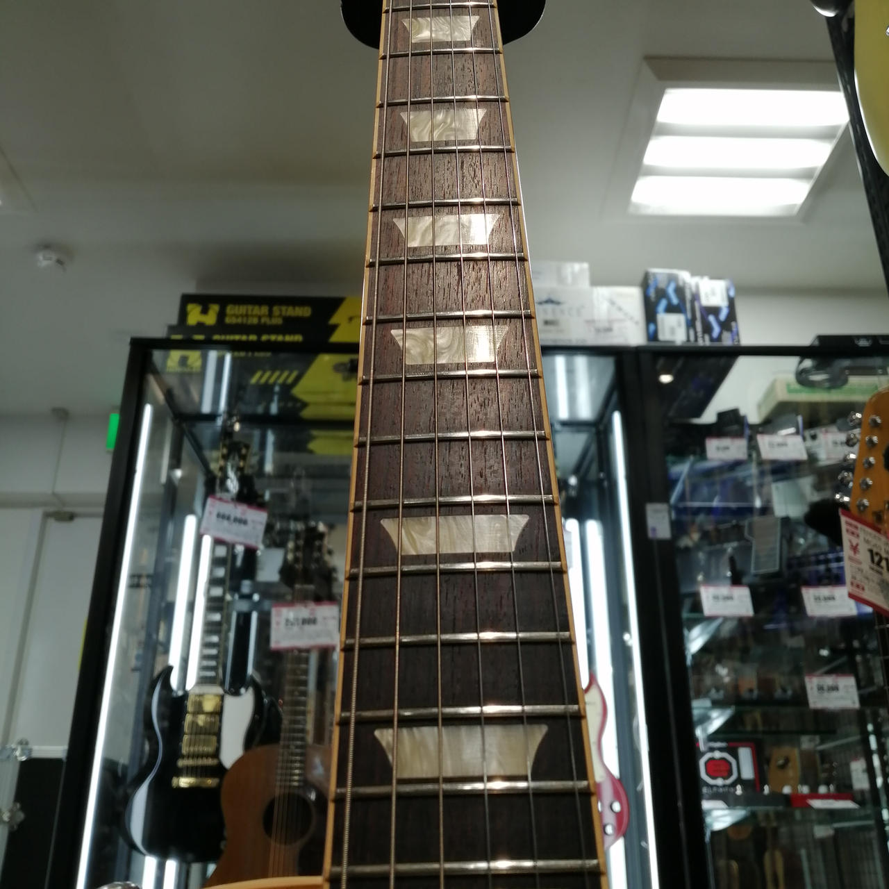 マホガニーボディ、メイプルトップ、マホガニーネック、ローズウッド指板、Weight Relief加工、43.05mmナット幅。 |