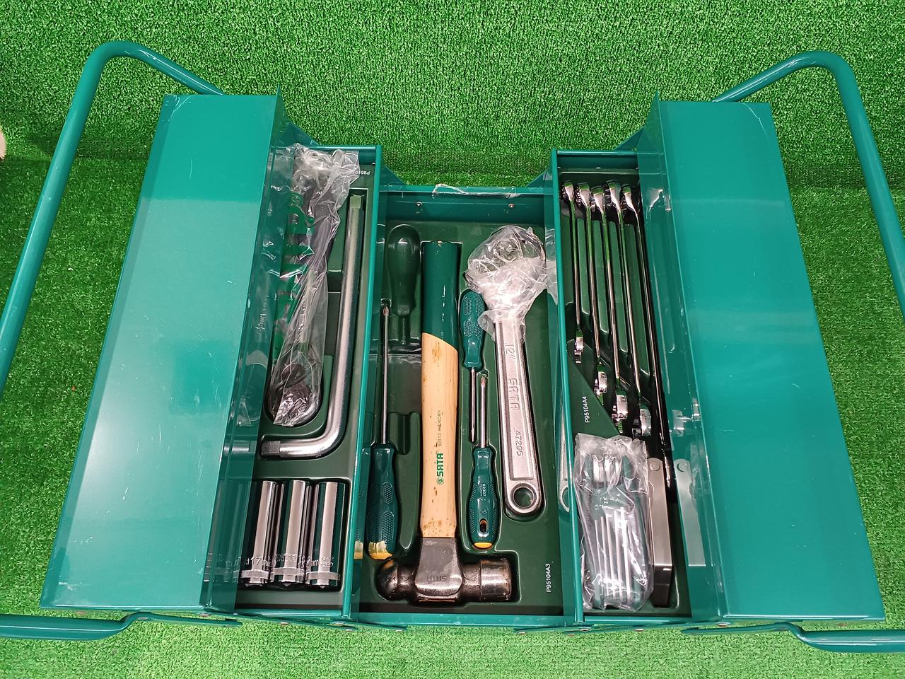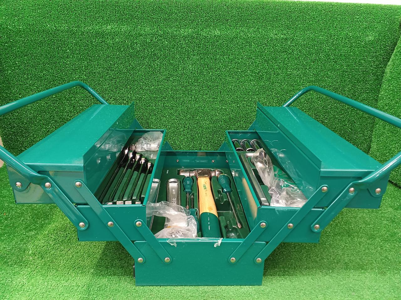 マイナスドライバー(5.0mm×75mm、プラスドライバー(#1×75mm、#2×150mm)、ラジオペンチ(150mm)、ニッパ(150mm)、ペンチ(175mm)、片手ハンマー(1 1/2ポンド) |