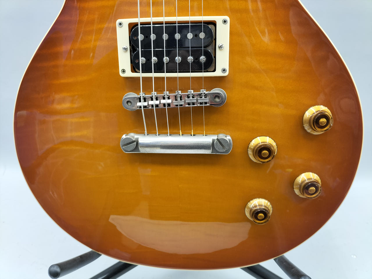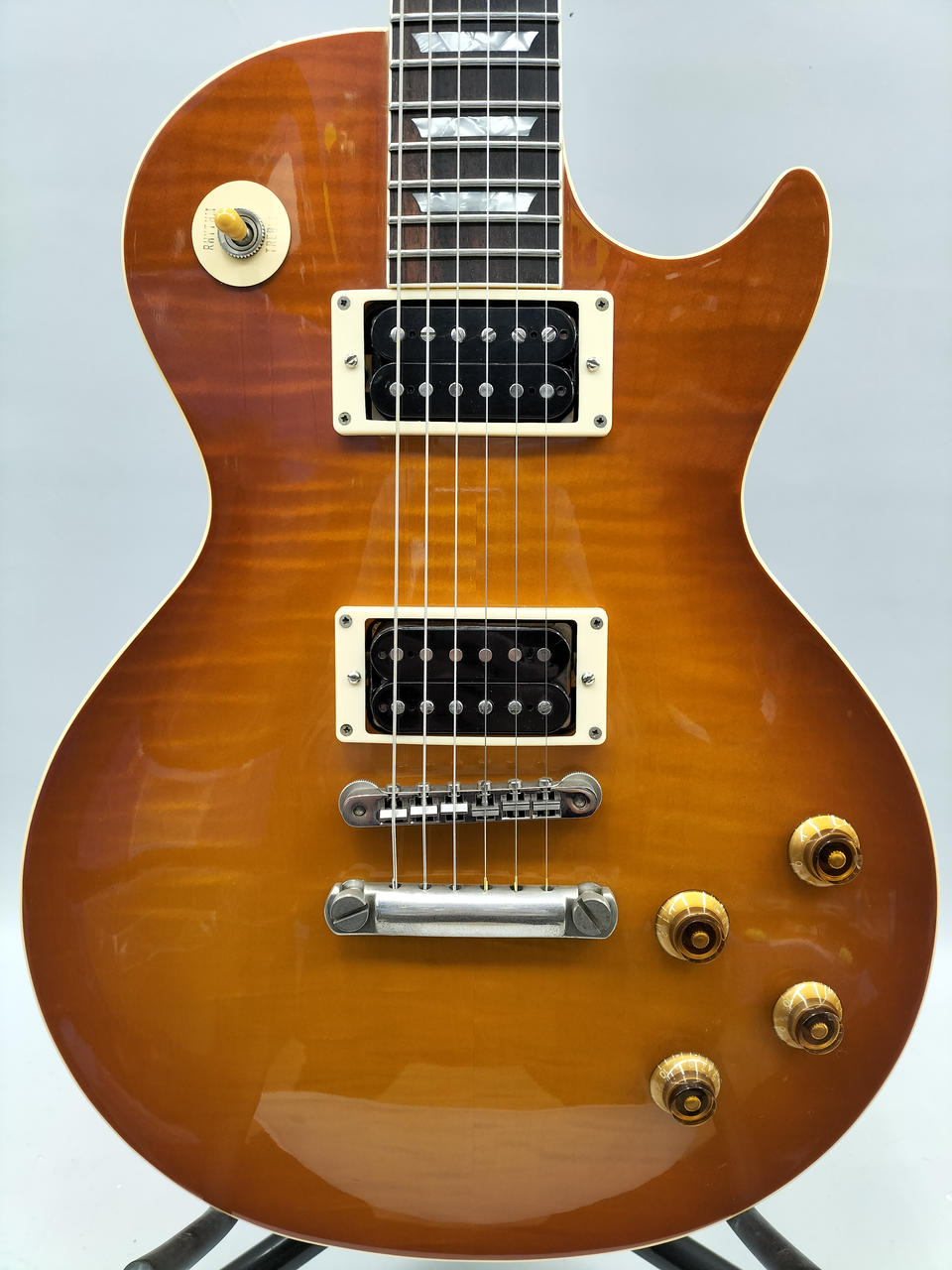 フジゲン製で生産本数が少なかったものの、作りの良さで評価の高い、BURNY「LG-75GR」を有名ギタリストの仕様にモディファイした1本。 |