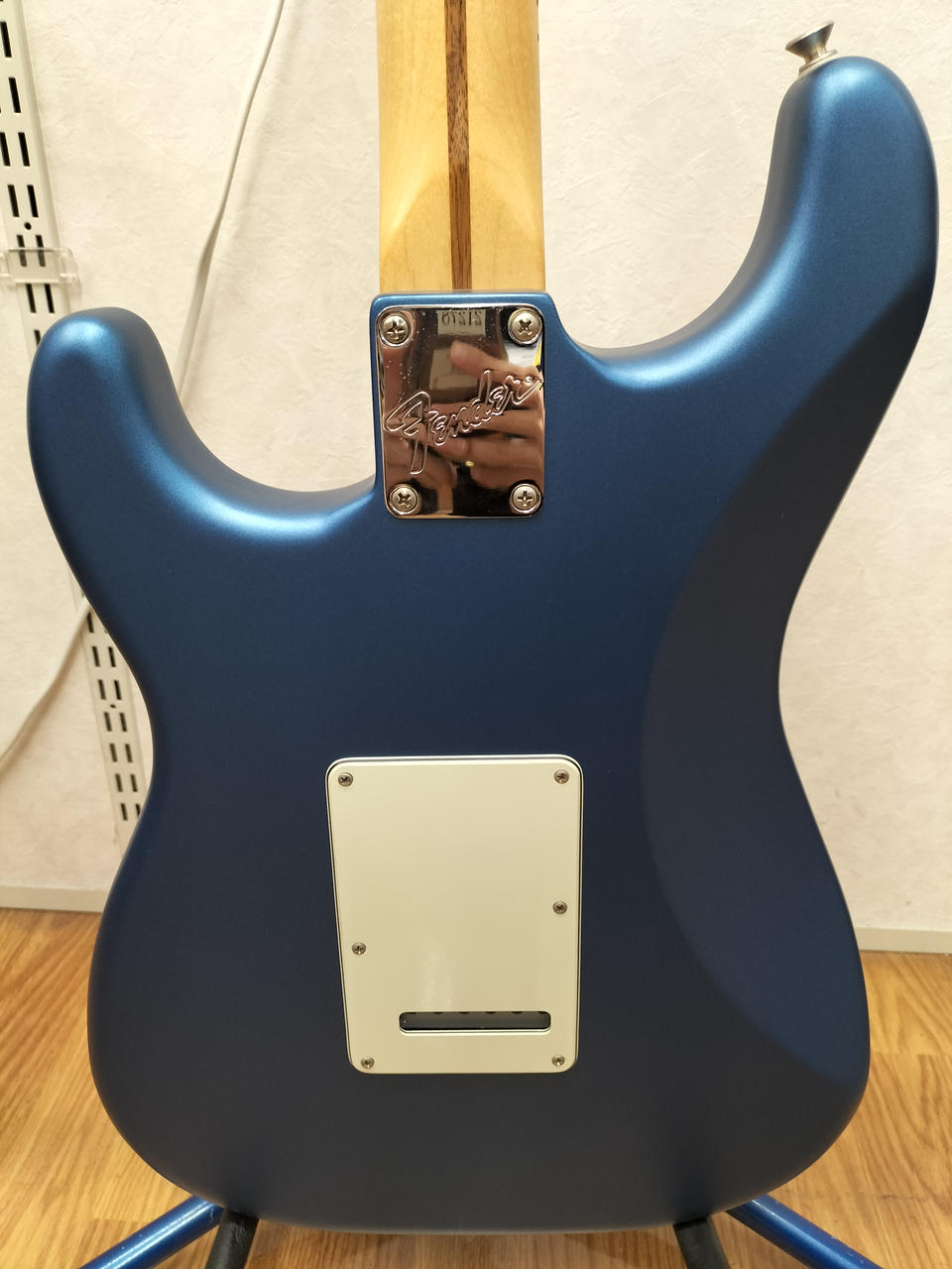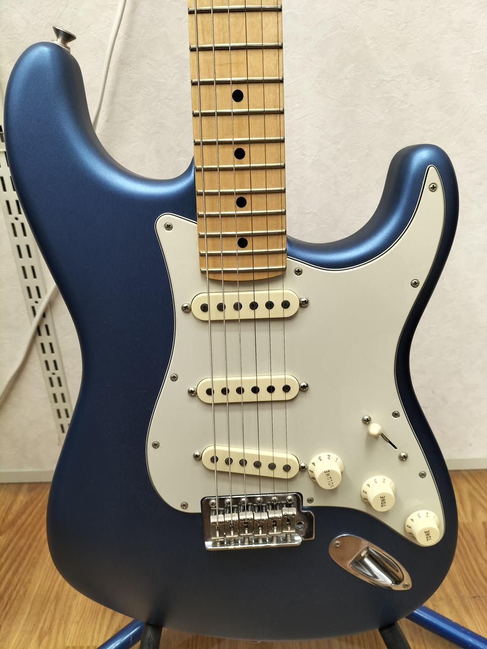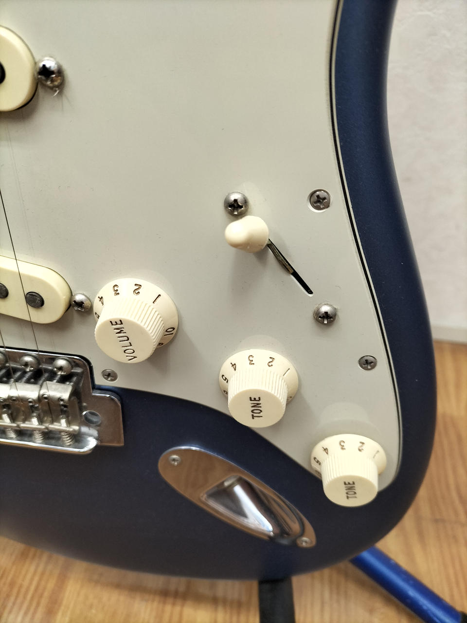 マットな質感の青い塗装のギターです!離れたピックアップ同士を選択できるので、ジャズマスターやテレキャスターのようなミックスサウンドを使用することができます!