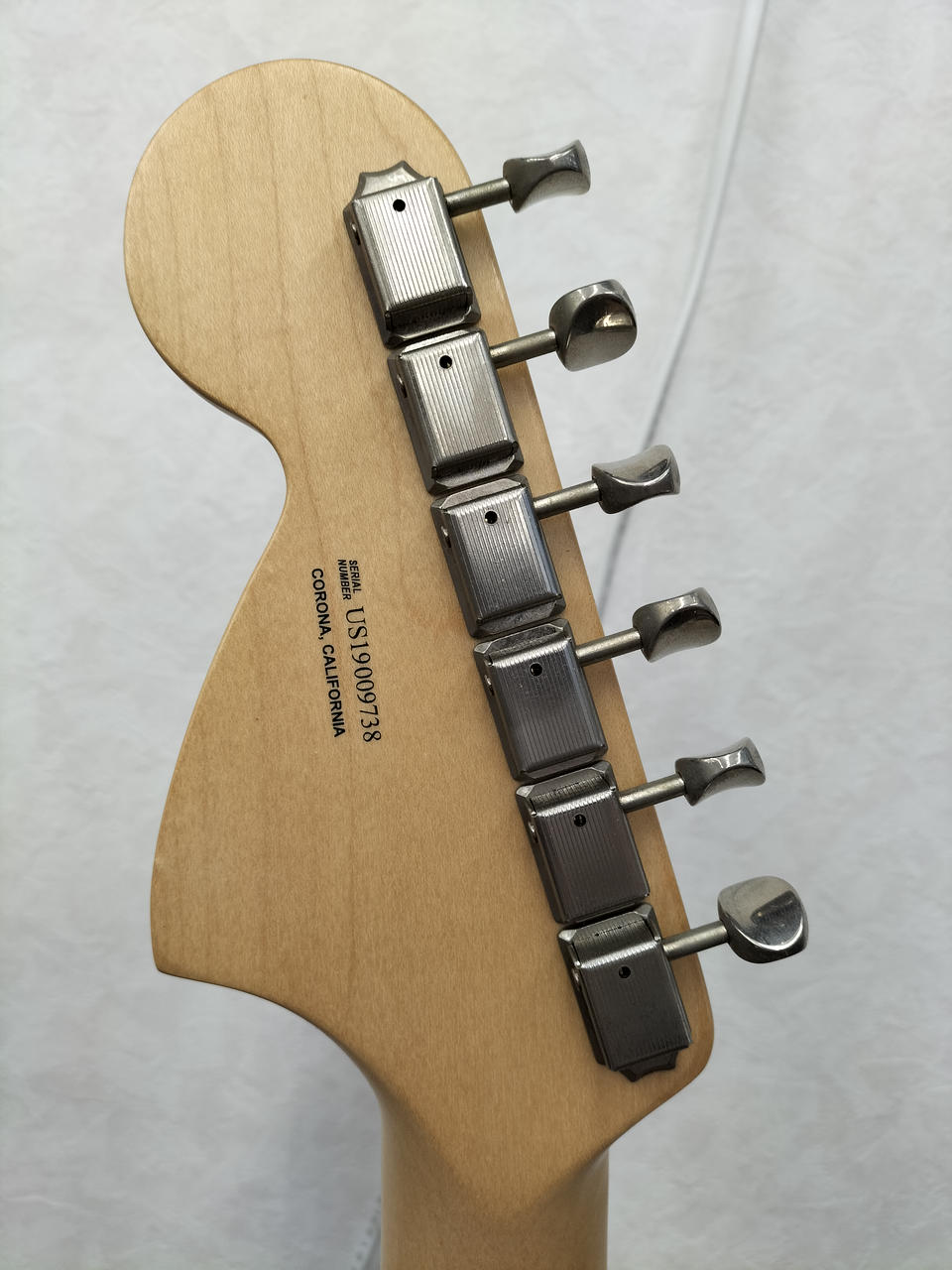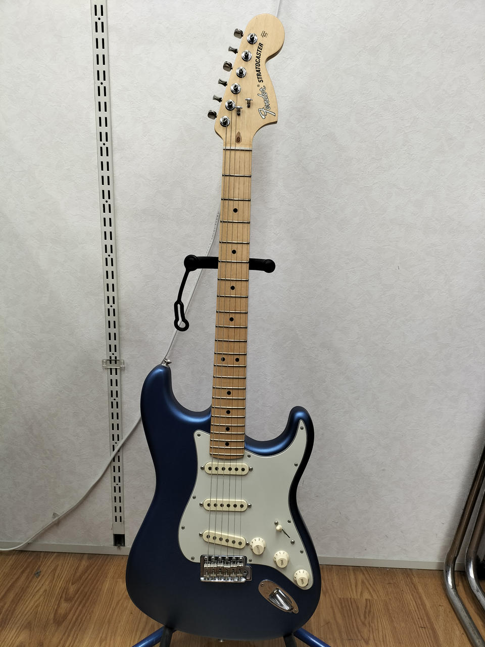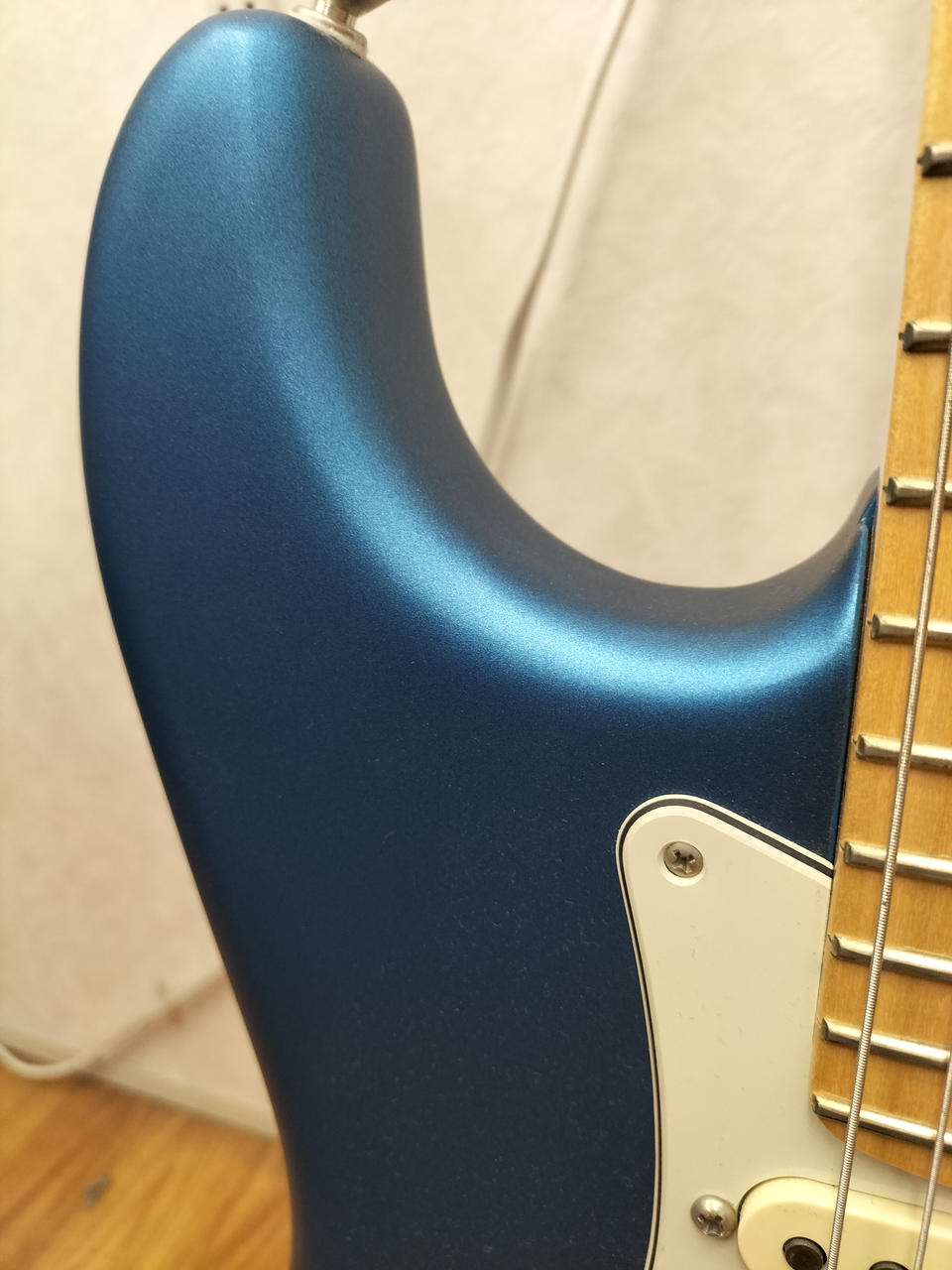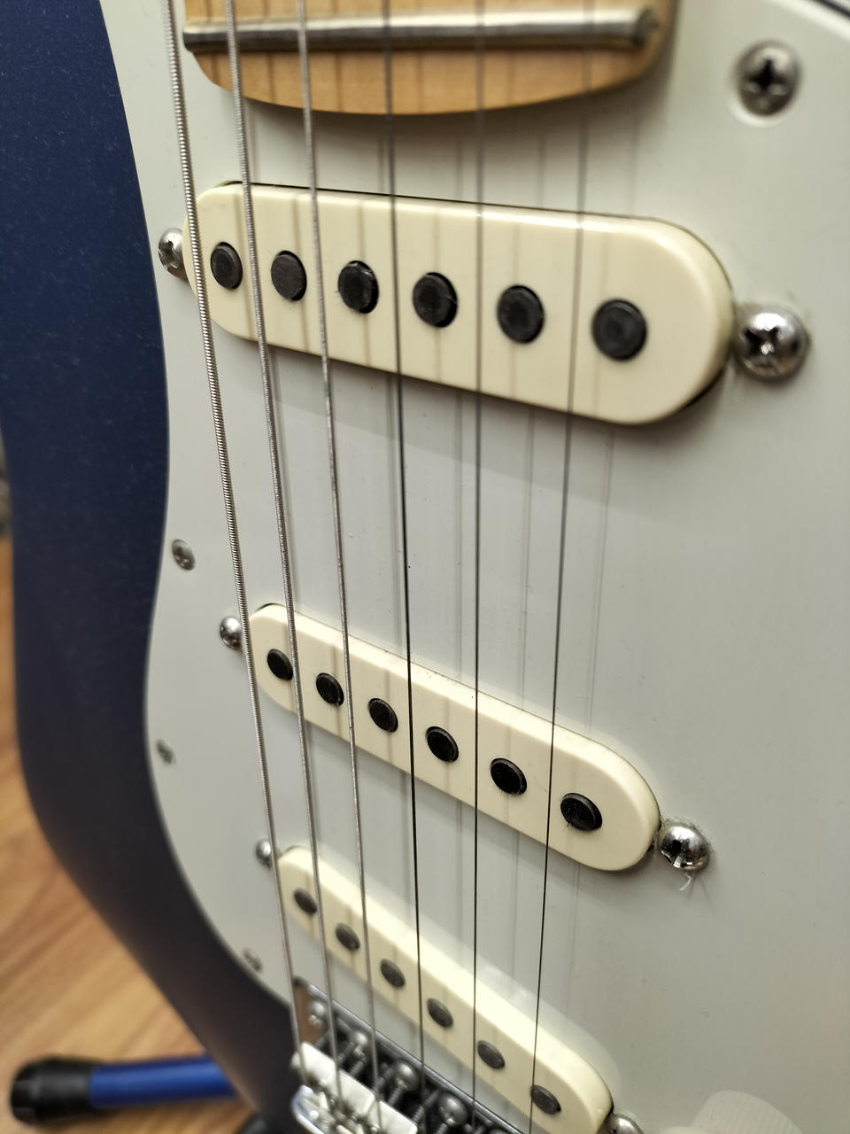 マットな質感の青い塗装のギターです!離れたピックアップ同士を選択できるので、ジャズマスターやテレキャスターのようなミックスサウンドを使用することができます!