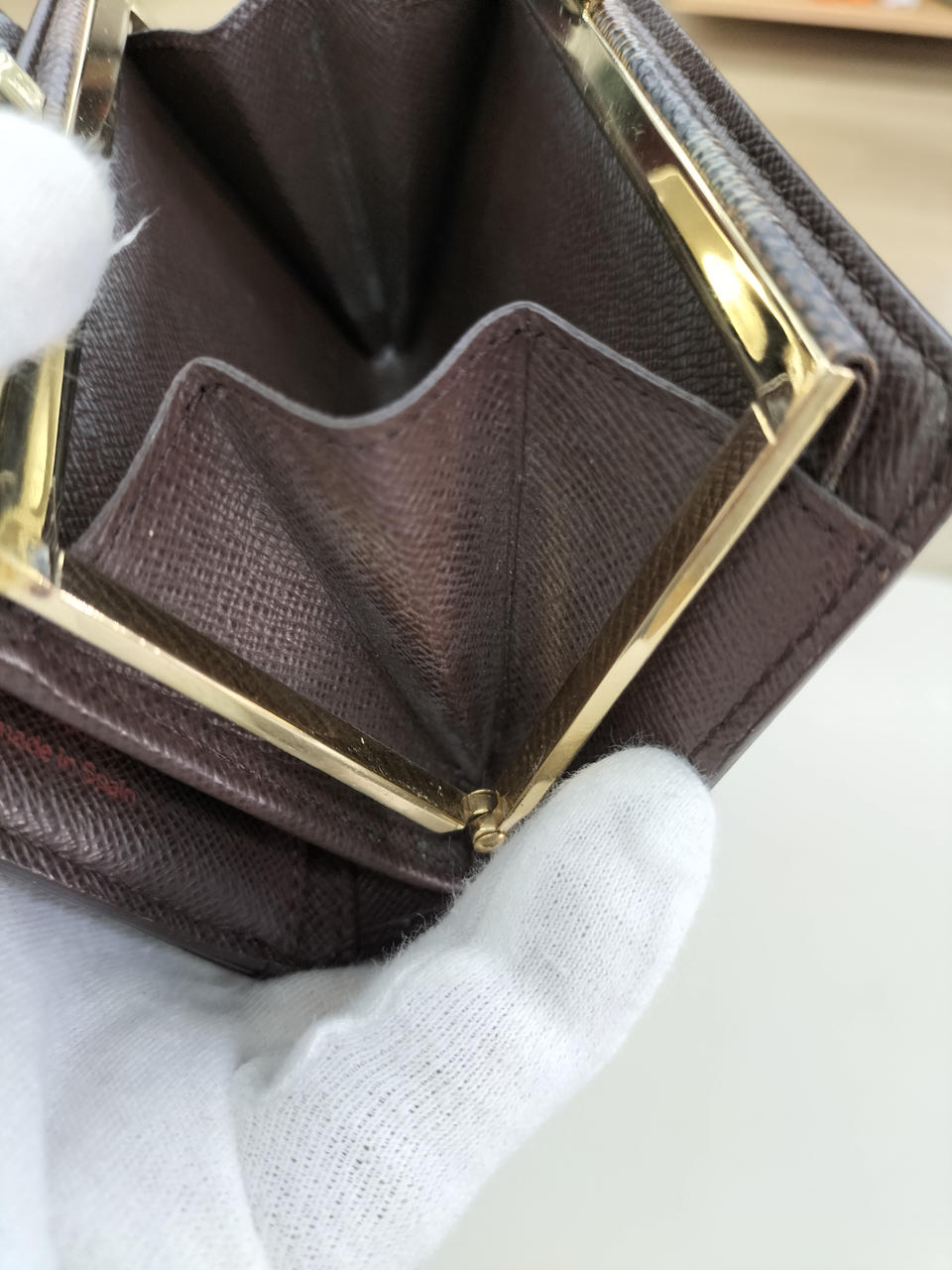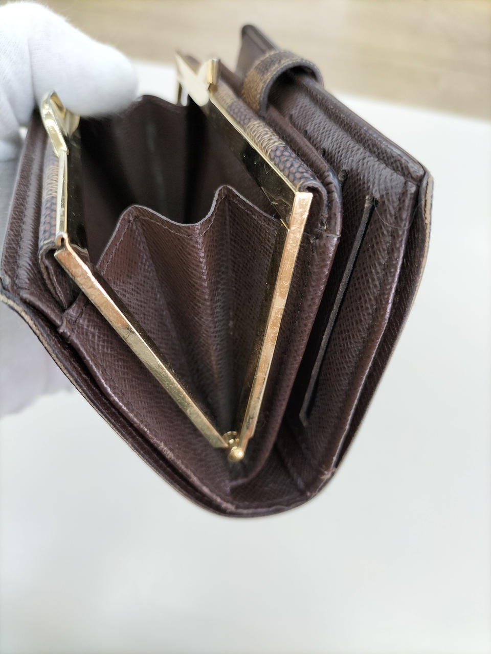 落ち着いた優美さと幾何学的なモチーフが魅力的なダミエラインの、カード入れが8枚ついた、大きく開いて中身が見やすい機能的ながま口財布