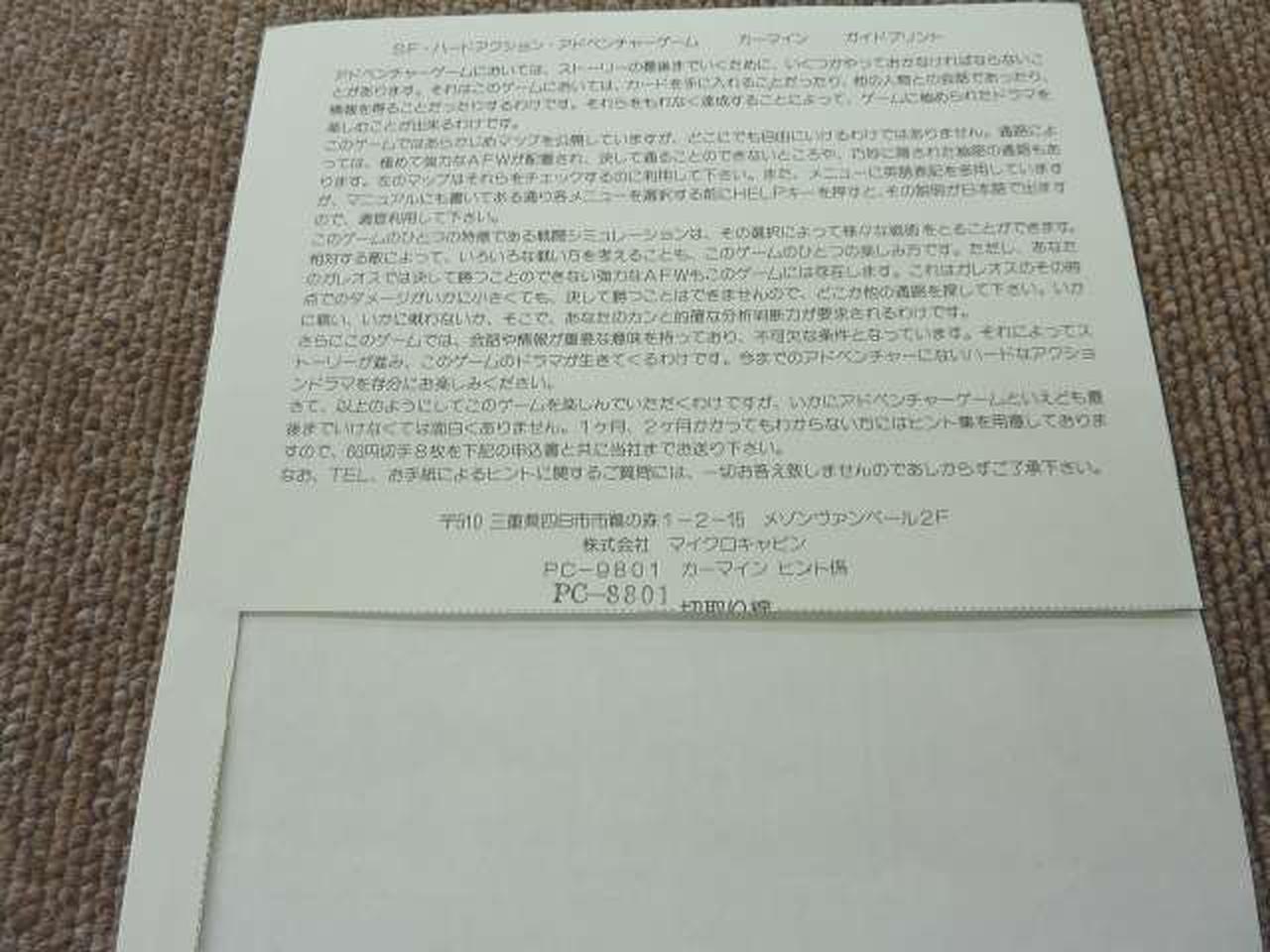写真6ですが、ゲームのヒント集のようなものを欲しければ応募する、といった内容の紙がカットされています。 |