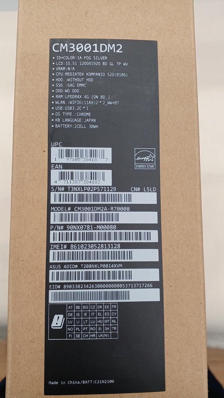 CPU:MediaTek KOMPANIO 520@2GHz メモリ:4GB ストレージ:eMMC 64GB OS:ChromeOS 画面サイズ:1200×1920(10.5インチ) 重量:約614g |