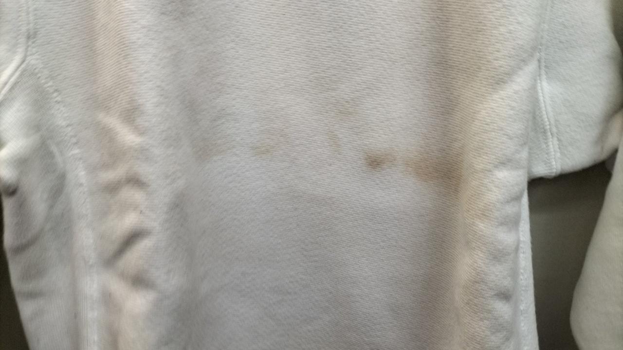 フロント部分と袖に汚れがみられます。 |