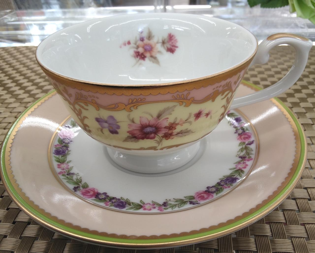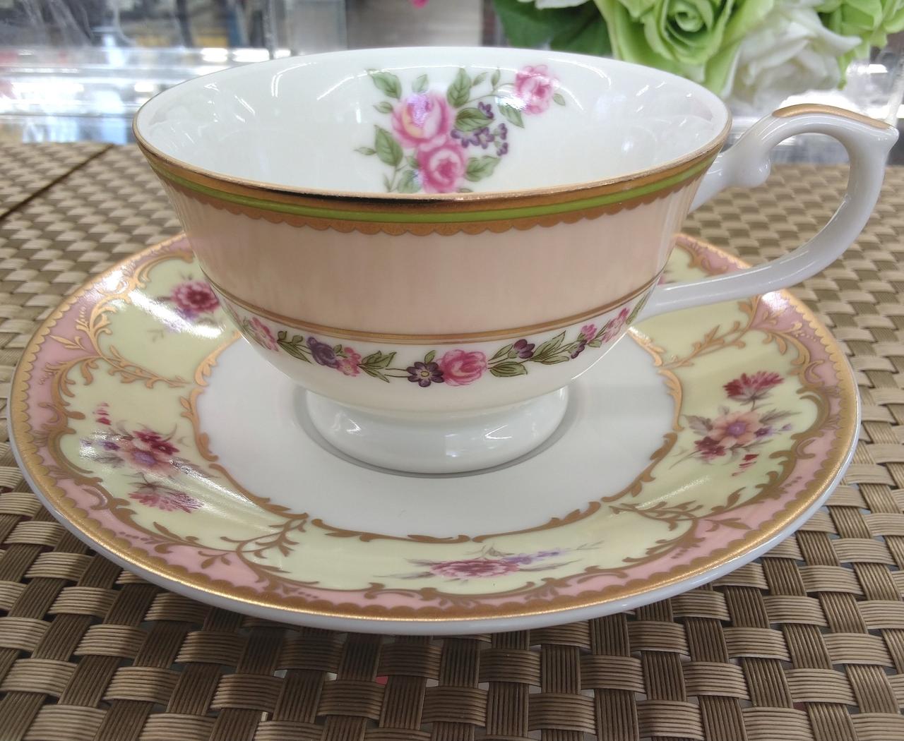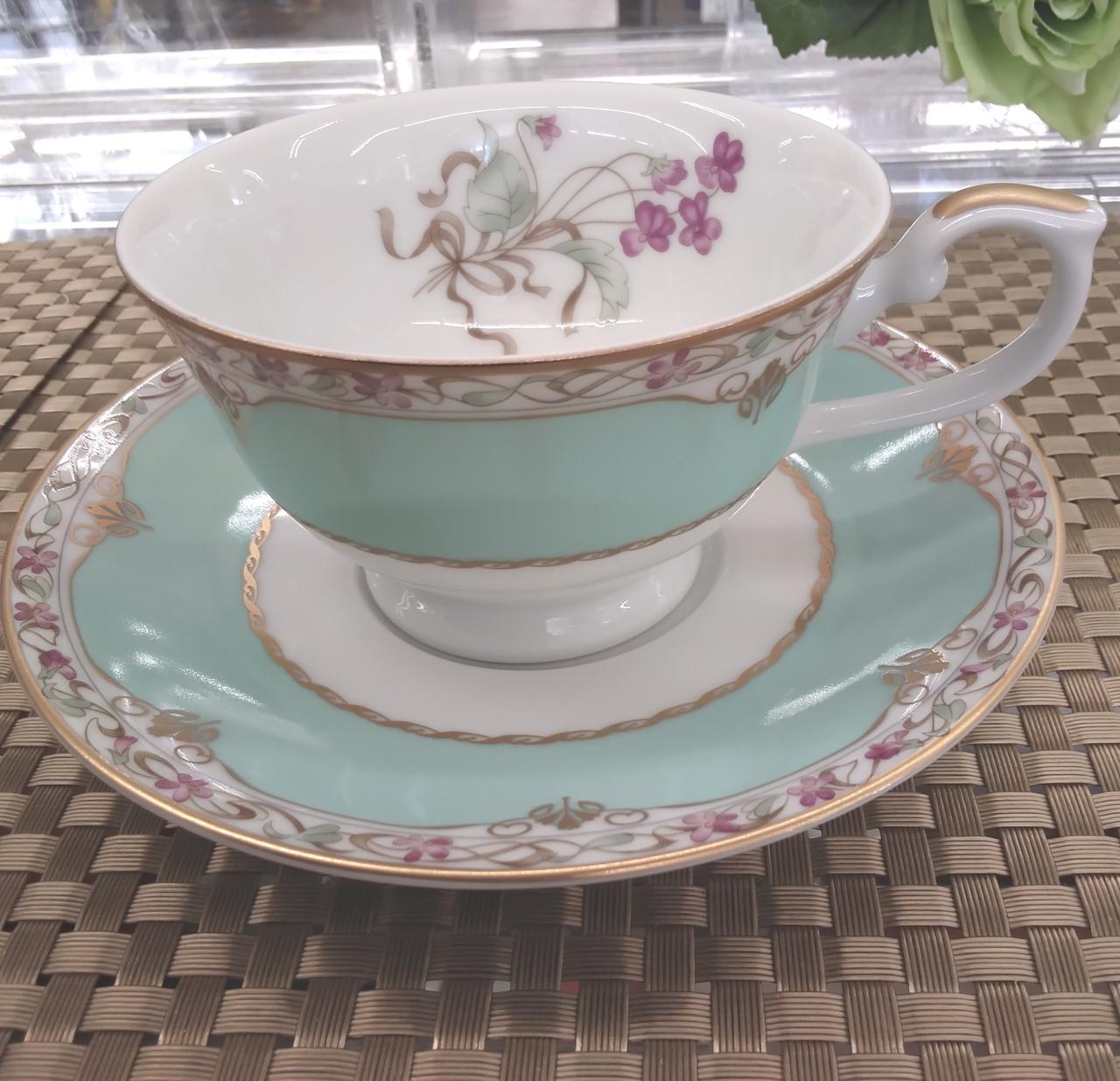 パステルカラーの花柄27cmプレート、19cmケーキプレート、カップ&ソーサー優しく柔らかなテイストでお客様とのティータイムが楽しくなりそうです。