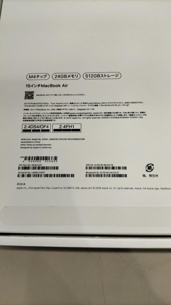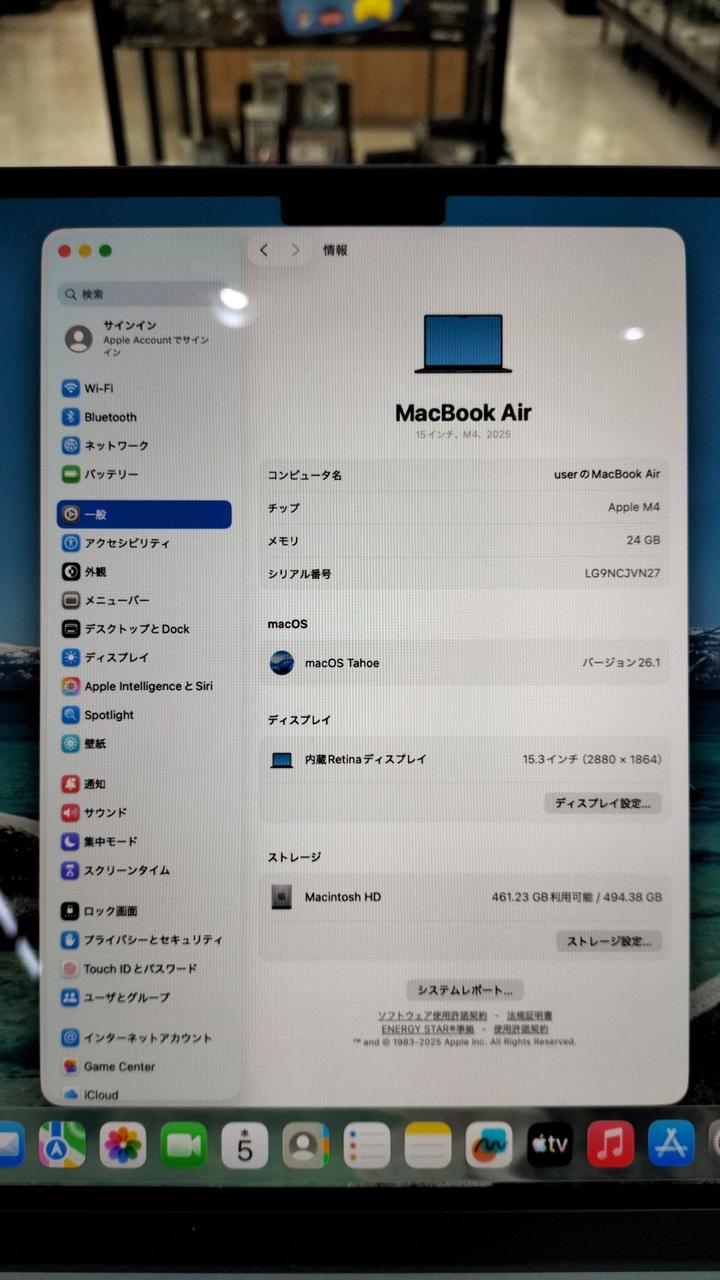 CPU:Apple M4 RAM:24GB SSD:512GB MACOS:26.0.1 Tahoe |